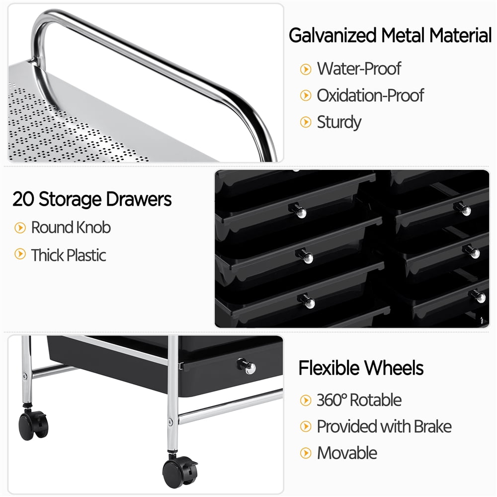 Alden Design 20 Drawers Metal Frame Storage Cart Rolling Bin with Lockable Wheels, Black