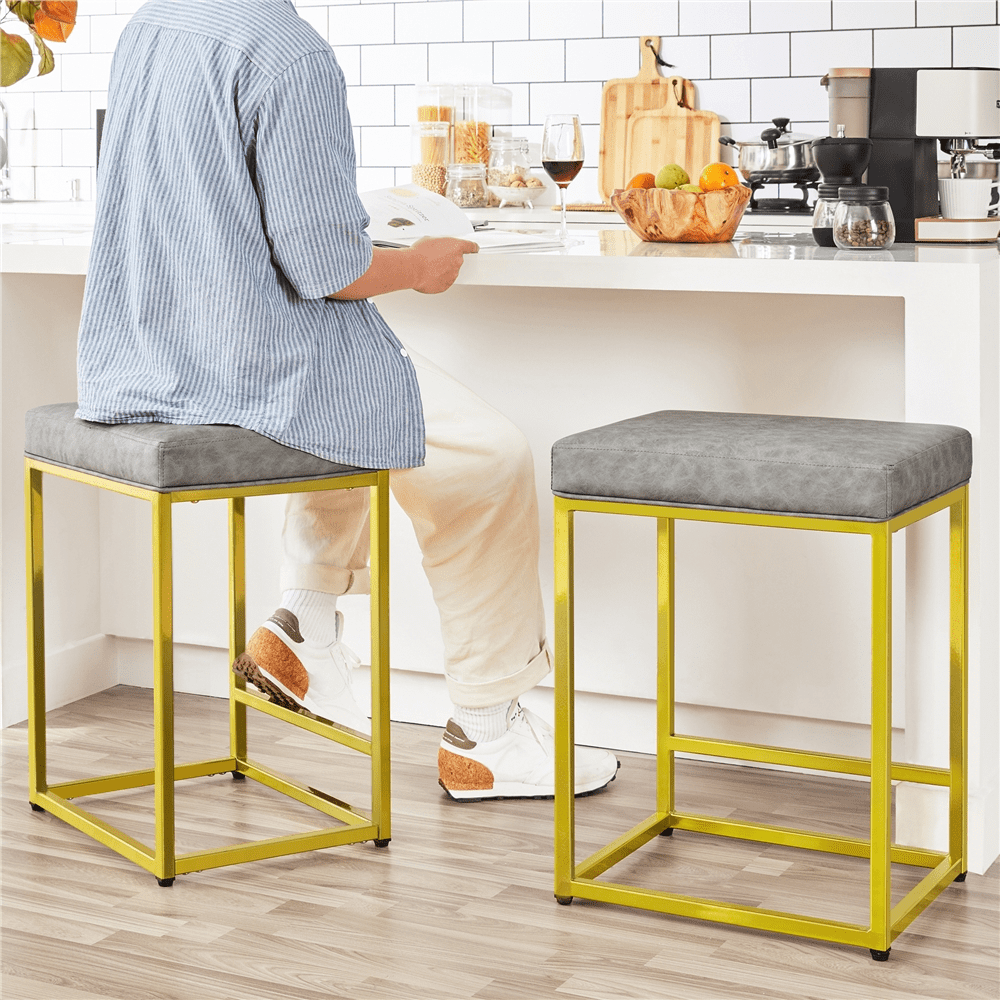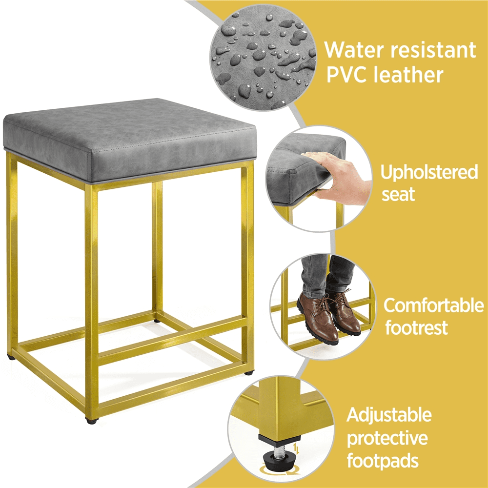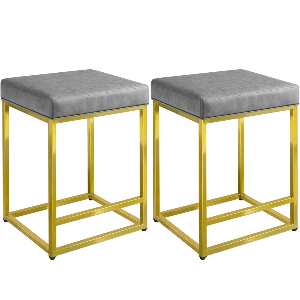 SmileMart 24″ H Modern Upholster Counter Bar Stools With Gold Frame, Gray Qty.: 2PCS Color: Gray cushion, Gold frame Material: PVC leather, Foam, Metal Overall size: 19” L x 16” W x 24” H Cushion size: 18.7” L x 15.6” W x 3.3” Thickness Square tube size: 0.8” L x 0.8” W Max. load capacity: 300lb G.W.: 31.7lb N.W.: 27.6lb Note: 1.Please allow ±1cm/0.5” errors due to the manual measurement. 2.For your safety, please do not stand on it.
