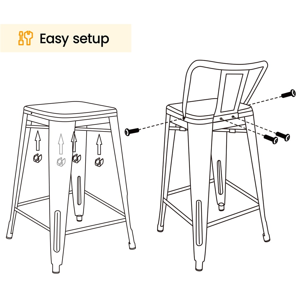 Alden Design 24″ Metal Low Back Barstools with Wood Top, Set of 4, Black: Qty.: 4pcs Material: Metal, Sassafras Color: Black Overall size: 41 x 45 x 77cm/16 x 18 x 30” (L x W x H) Seat size: 31 x 31 x 61.4cm/12.2 x 12.2 x 24.2” (L x W x H) Backrest size: 34.5 x 24 x 7.7/13.6 x 9.4 x 3”(L x W x H) Ground clearance (footrest to ground): 18.3cm/7.2” Max. load capacity: 136kg/300lb N.W.: 19.4kg/43lb (each stool: 5kg/11lb) G.W.: 22.7kg/50lb Note: 1.Please allow ±1.3cm/0.5”errors due to manual measurement. 2.For your safety, please do not stand on the stool. 3.Please disassemble the backrests first before stacking the stools up. Assembly Required Residential Use