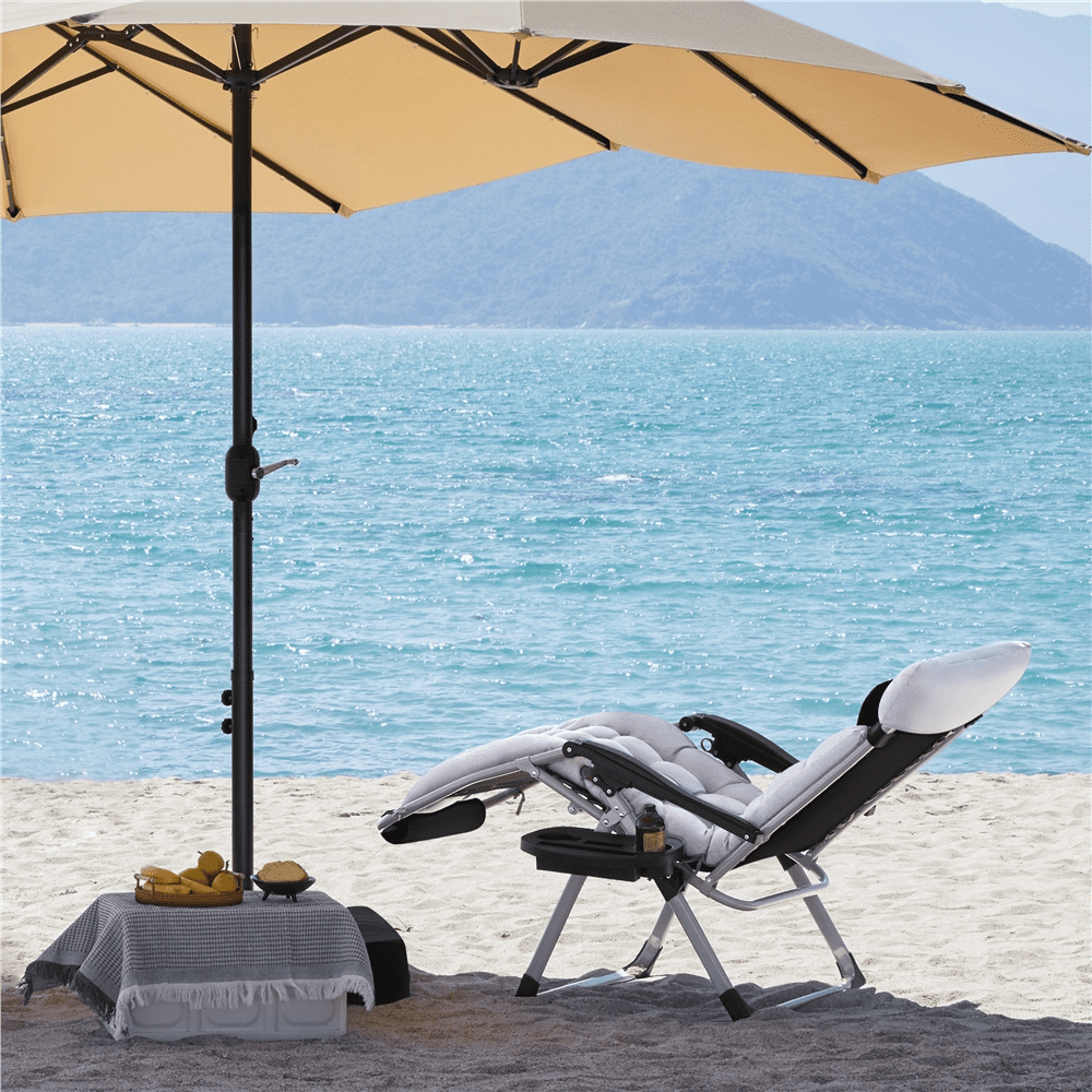 Cozy Padded Seating: Features a thick pad and elastic strap-fixed Texteline that conforms to your body, this recliner offering soft, supportive comfort whether reclining or sitting upright Lockable Reclining Positions: The adaptive reclining system adjusts to your preferred angle and locks securely, ideal for napping, reading, sunbathing, and more Winter-Ready Design: Crafted with 550g Texteline fabric and a removable thick pad, this recliner offers added warmth and comfort, making it suitable for outdoor use during cool weather Adjustable Support Pillow: The soft pillow is equipped with an elastic strap for easy adjustment, allowing you to use it as a headrest or lumbar support depending on your comfort needs Ready to Use: This folding beach lounge chair comes fully assembled, so you can simply unfold it and start enjoying your outdoor relaxation right away Color: Gray Materials: Painted Steel, 550g Texteline Dimension: Unfolded: (zero gravity): 63″ L × 27.5″ W × 30″ H; Folded: 35.5″ L × 27.5″ W × 6.5″ Thickness Seat: 35″ Depth × 27.4″ Width Maximum Weight Capacity: 400 lb Item Weight: 21.1 lb Note: Please allow a 1/2″ measurement tolerance