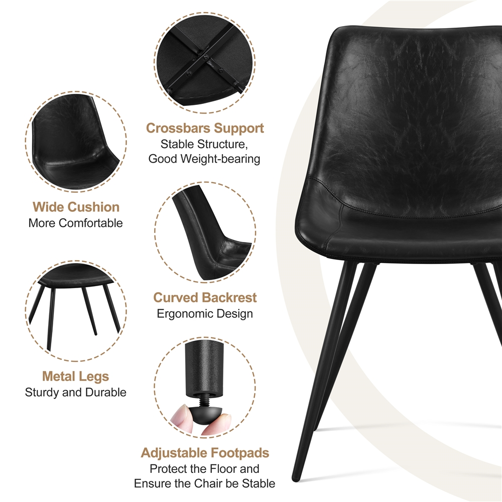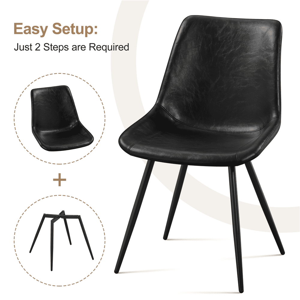 Our set of 2 accent chairs is crafted from a blend of long-lasting materials, including water-resistant PU leather, foam, powder-coated metal, and firm plywood. Each chair is supported by a sturdy metal frame for added support, holding up to 300lb. These stylish dining chairs are an ideal pick thanks to their neutral color and modern black metal legs, which perfectly match various home décor styles. Their fashionable design and well-crafted stitching make them a great addition to any room. The assembly is very easy and quick!