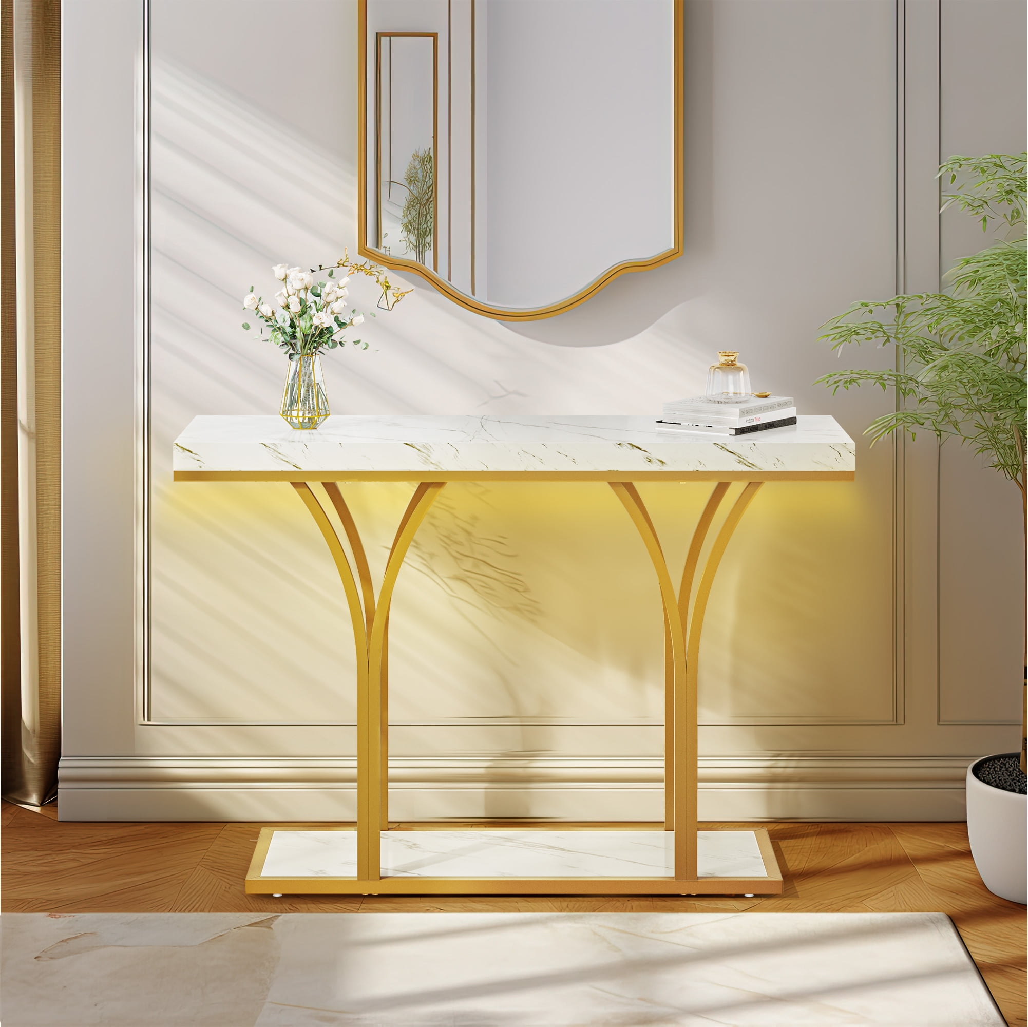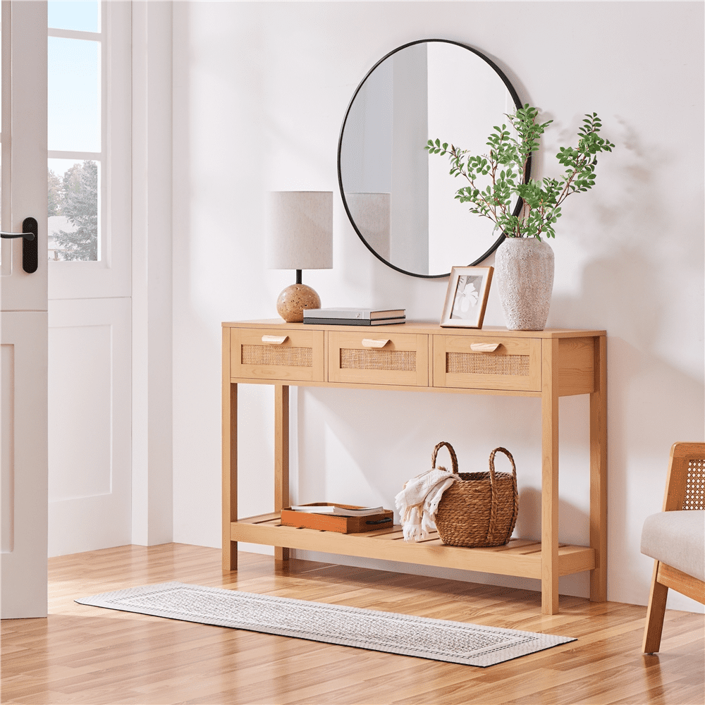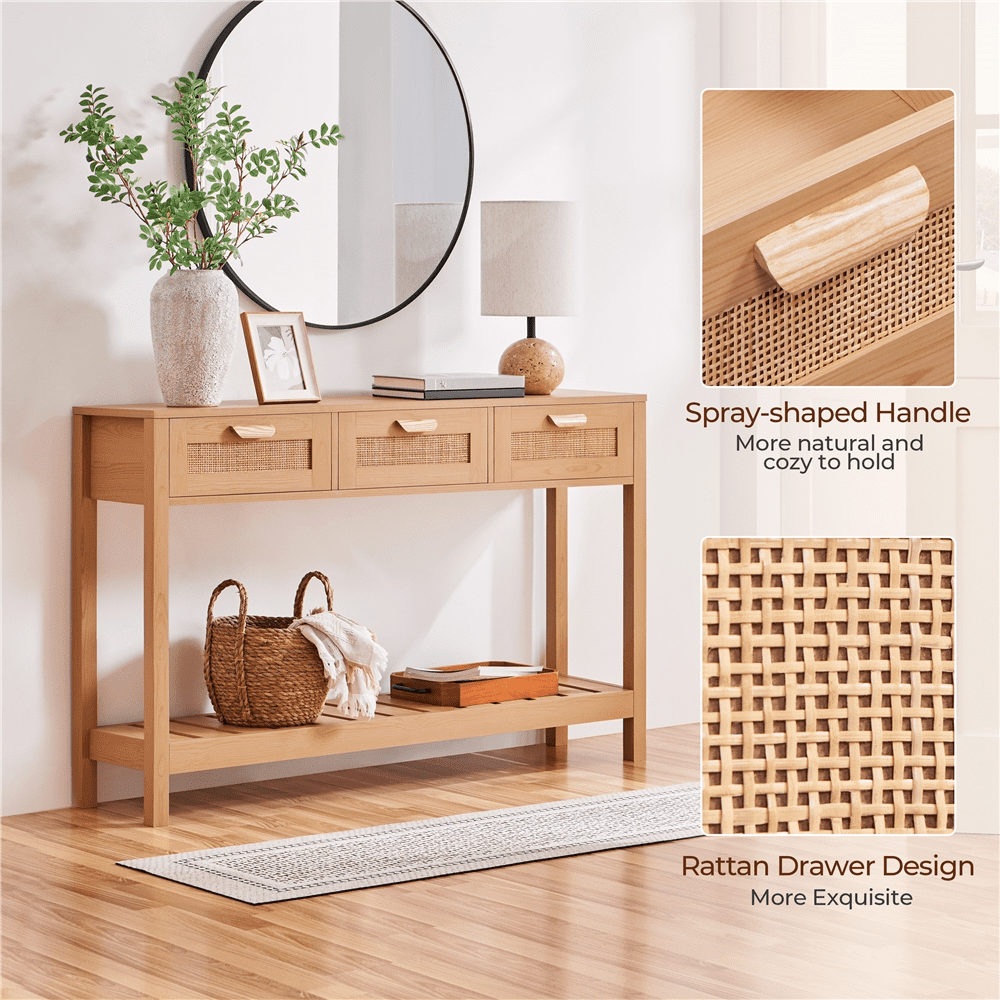 Alden Design 3 Drawer Rattan Dotted Console Table with Bottom Shelf, Light Brown: Color: Light Brown Materials: MDF, Particle Board, White Ash Wood Overall Dimension: 51.5″L × 12″W × 21″H Each Drawer: 13.7″L × 9.4″D × 3.7″H Bottom Shelf: 48.2″L × 11.6″W × 18.2″H Max Weight Capacity: tabletop: 55 lb each drawer: 6.2 lb bottom shelf: 24.3 lb Item Weight: 54.2 lb Shipping Weight: 61.6 lb Open & Closed Storage Smooth Drawer Slides