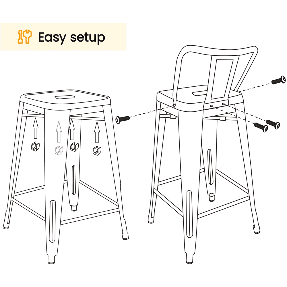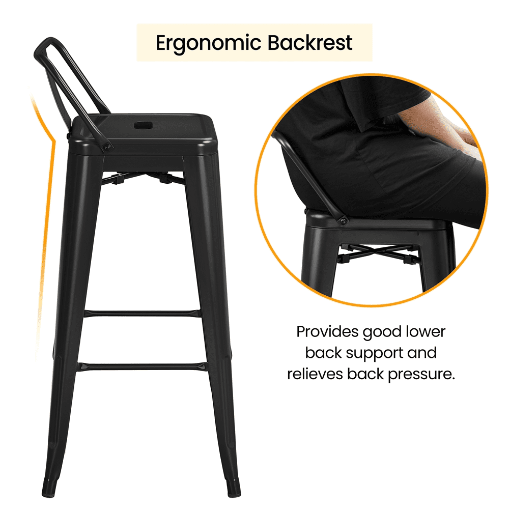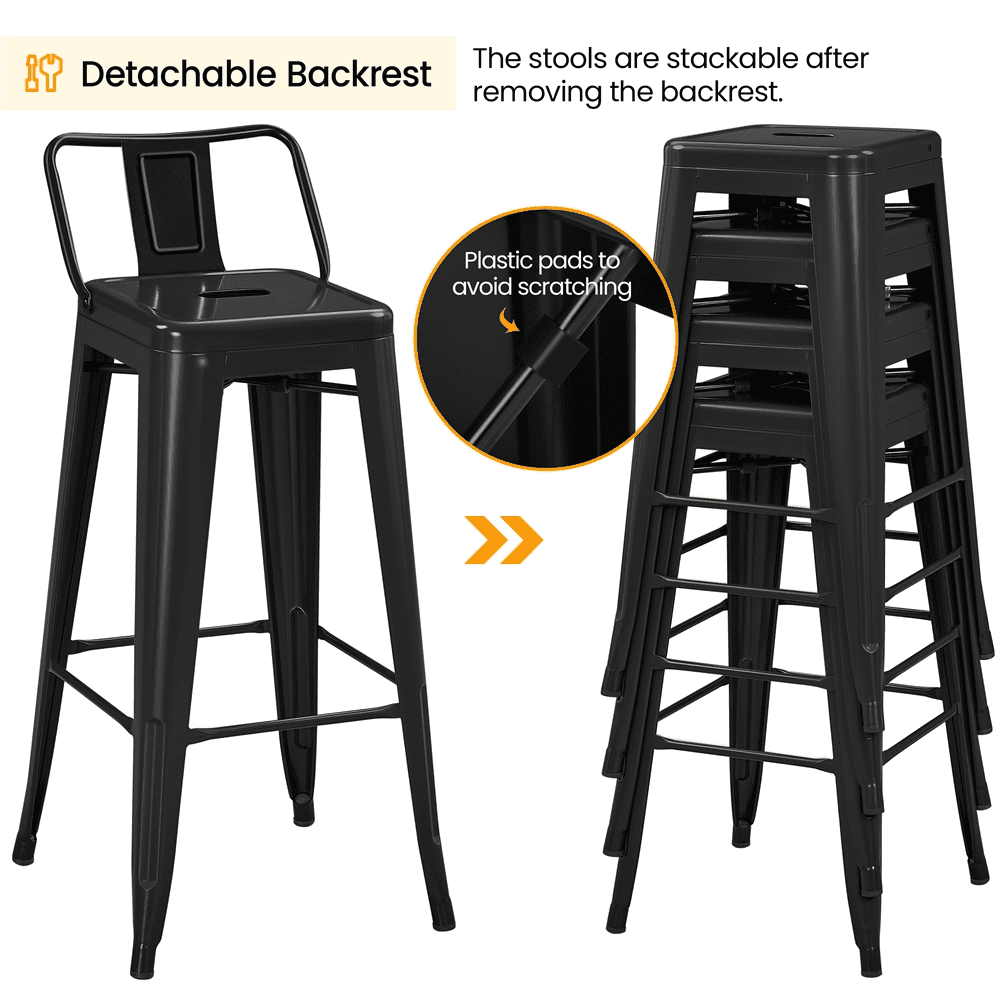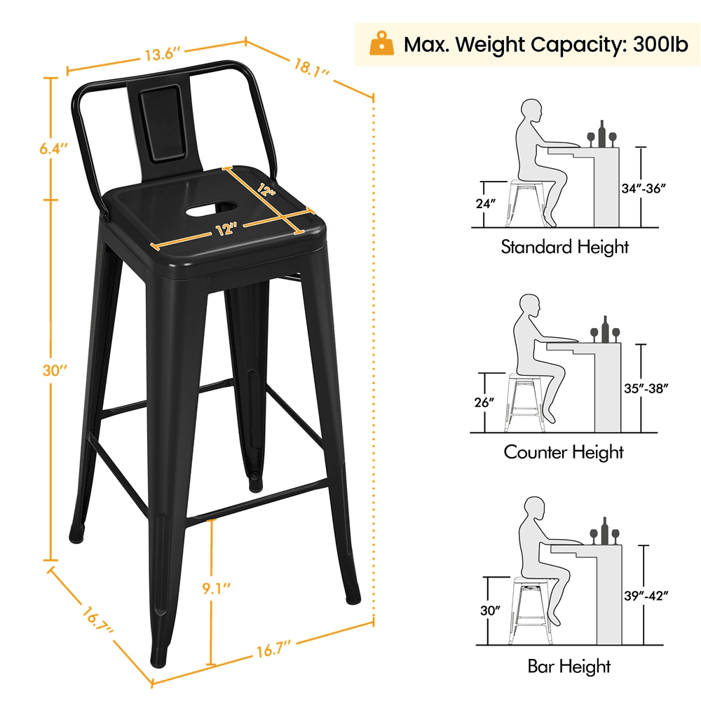 Alden Design 30″ H Metal Counter Height Bar Stools with Low Back for Home, Set of 4, Black Qty.: 4pcs Color: Black Material: Powder-coated Steel Assembled Dimensions: 17” L × 18” W × 36.5” H Seat Size: 12”× 12” Seat Height: 30” Backrest Size: 13.6” L × 9.4” W Ground Clearance (footrest to ground): 9” Max. Load Capacity (ea.): 300 lb Item Weight: 10 lb; (each stool:) 40.6 lb Shipping Weight (4pcs): 47 lb Note: 1. Please allow a ±0.5” measurement tolerance. 2. For your safety, please do not stand on the stool. 3. Please disassemble the backrests first before stacking the stools up. Stackable Design 30” Bar-height Stools