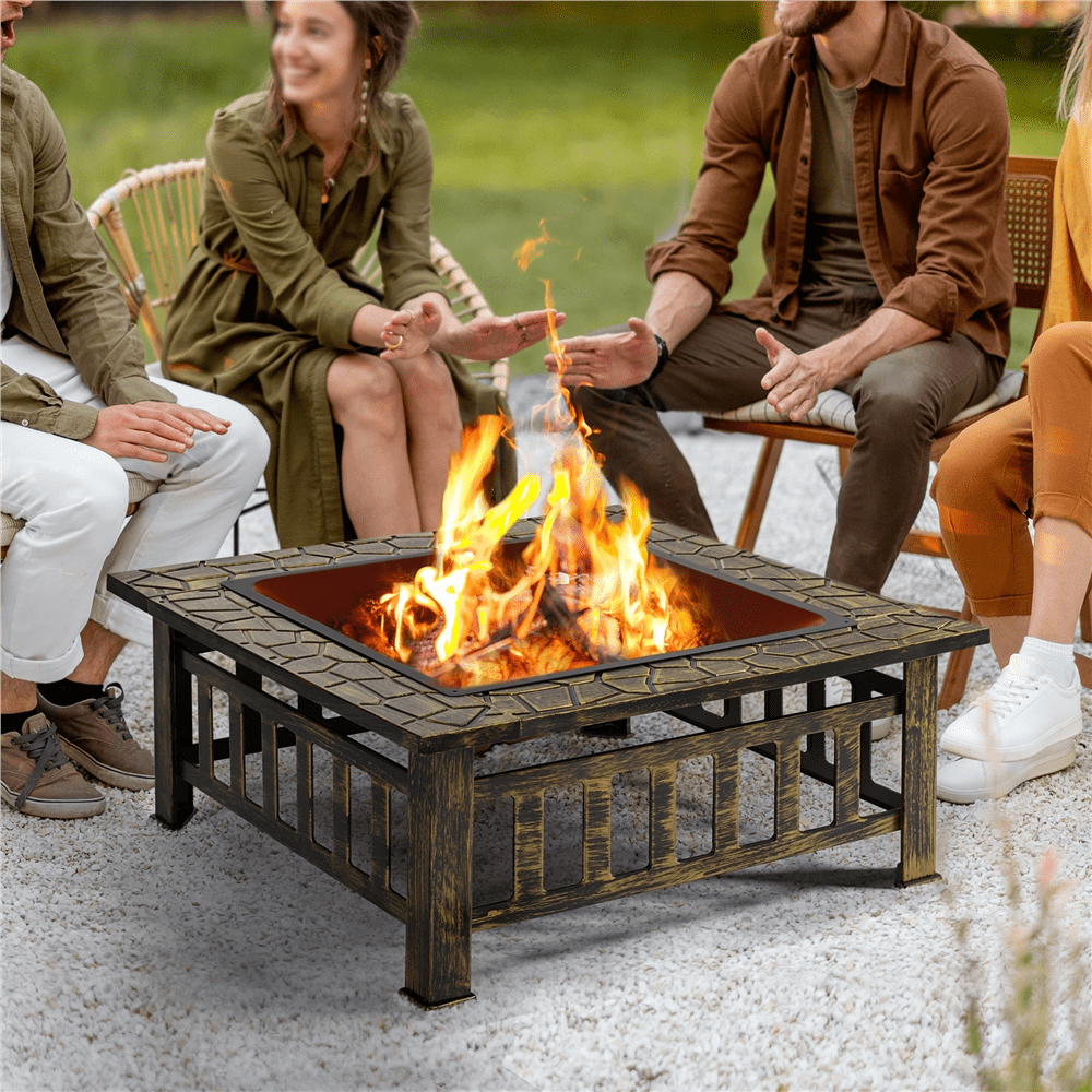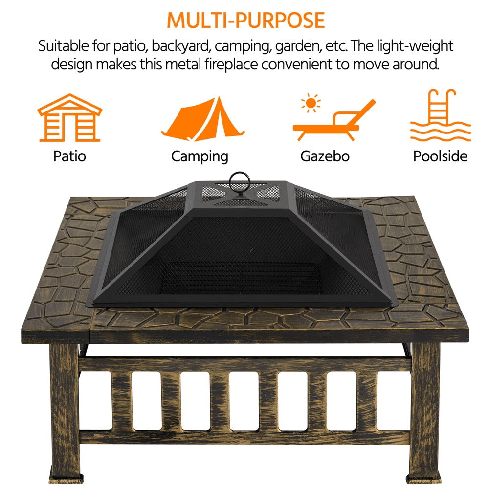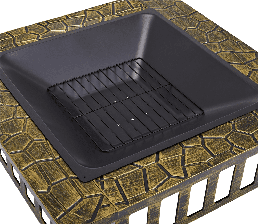 Smile Mart 34” Metal Square Fire Pit Stove Brazier with Cover & Poker for Garden, Bronze Specifications: Color: Bronze Materials: Metal Fuel Type: Charcoal, Firewood Overall Dimensions (w/ lid): 33.85in L × 33.85in W × 21.25in H Fire Pit Height (w/o lid): 13.97in Fire Bowl: 24.5in L × 24.5in W ×5in D Fire Poker Length: 20in Net Weight (assembled product weight): 26 lb Note: 1. Cooking grates are not included. 2. Please use this fire pit on non-combustible surfaces such as cement ground, rocks, or sand for your safety. Please don’t use it on lawns, wooden decks, or in any enclosed room. 3. Please allow a 1/2in measurement tolerance.