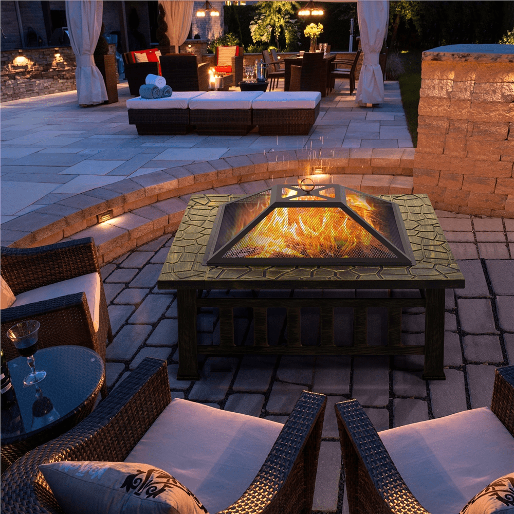 Alden Design 34” Metal Square Fire Pit Stove Brazier with Cover & Poker for Garden, Bronze
