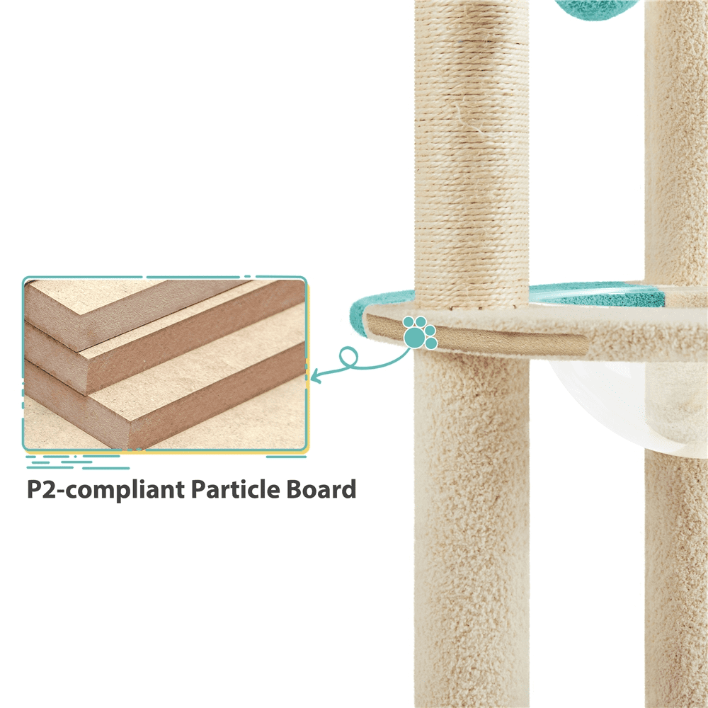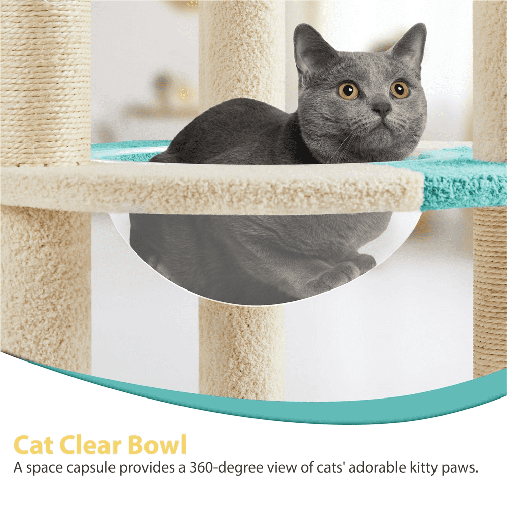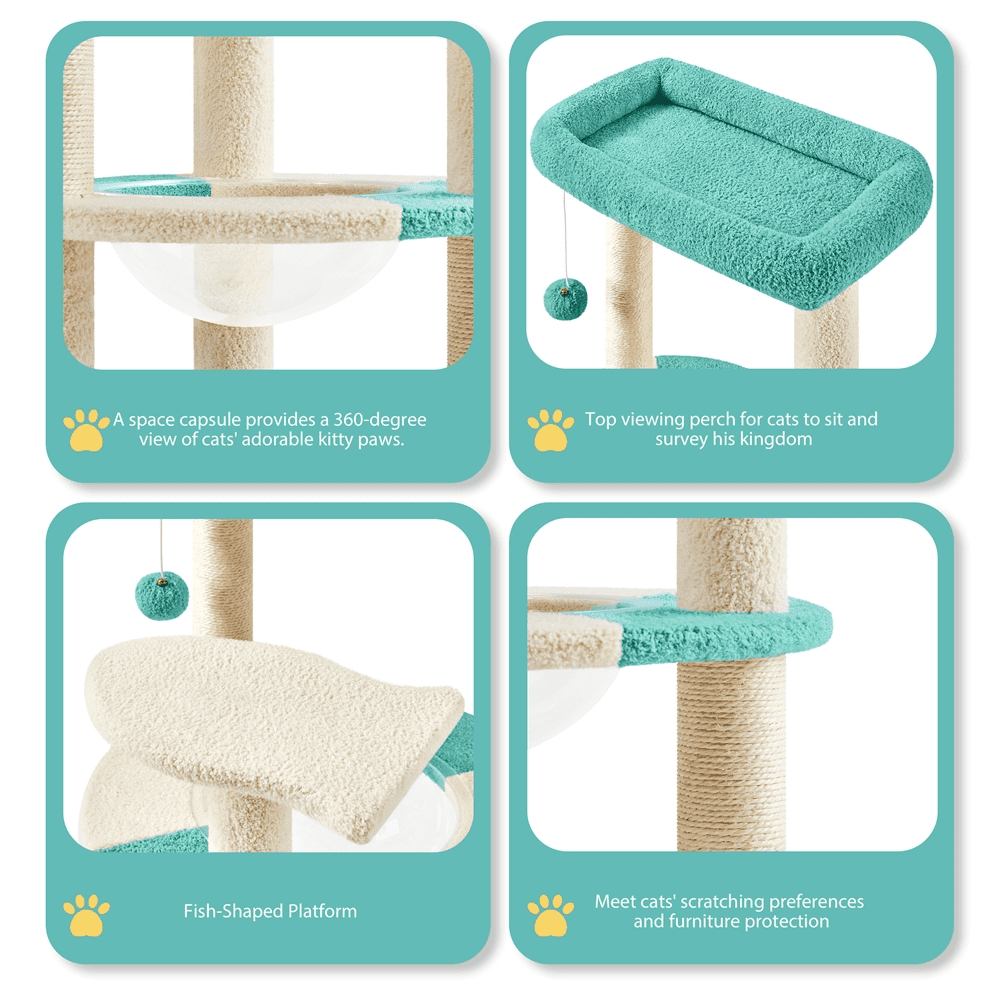 Inspired by the ocean, this marine-style cat tree sports an airy and playful color with a cute fish-shaped perch design. The transparent cat bed bowl resembles the window of a submarine, letting your kittens shuttle through the beautiful underwater world. Made from solid CARB P2-compliant particleboard and covered with soft plush that is perfect for your energetic cats to bounce up and down. A spacious top perch with a 2.6″ thick raised rim that allows your cat’s fluffy head to rest on when enjoying superb scenery out of the window. A fish-shaped platform provides enough space for your kittens to take a break or prance & play with the attached cat ball, and a cozy cat bed fits their body curve just right, perfect for a snuggly sleep.