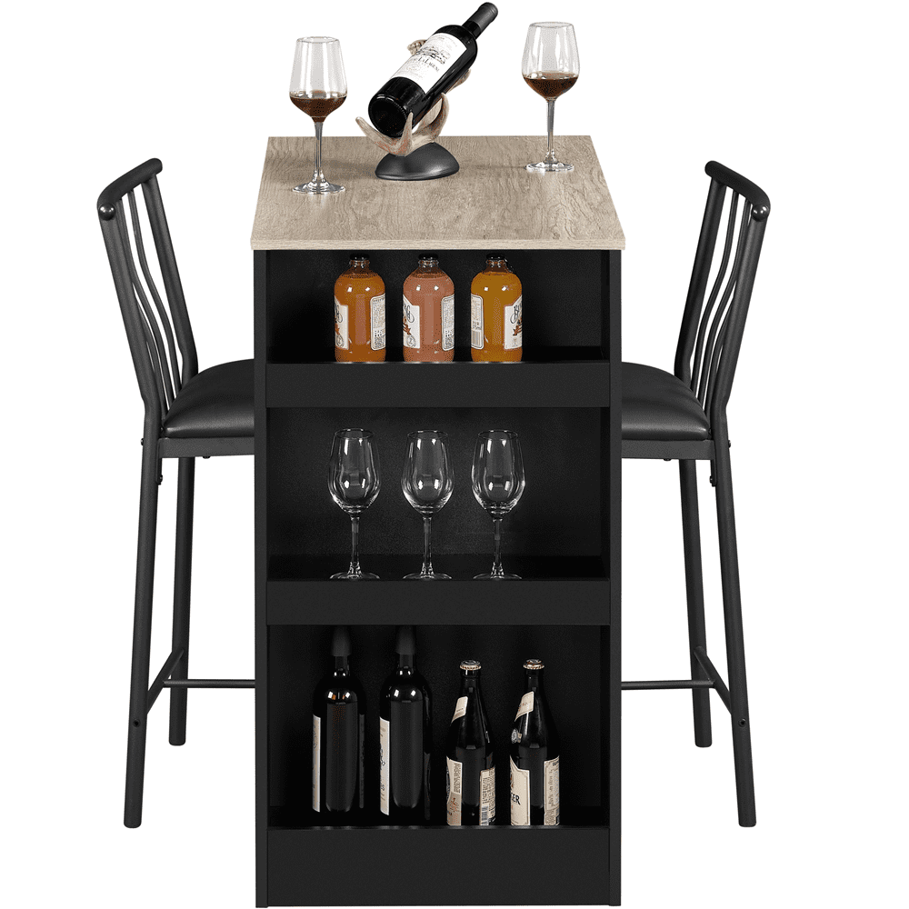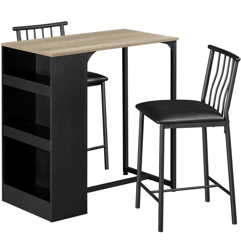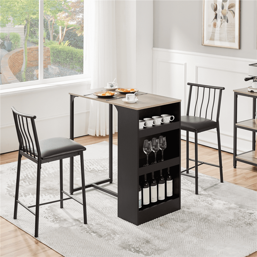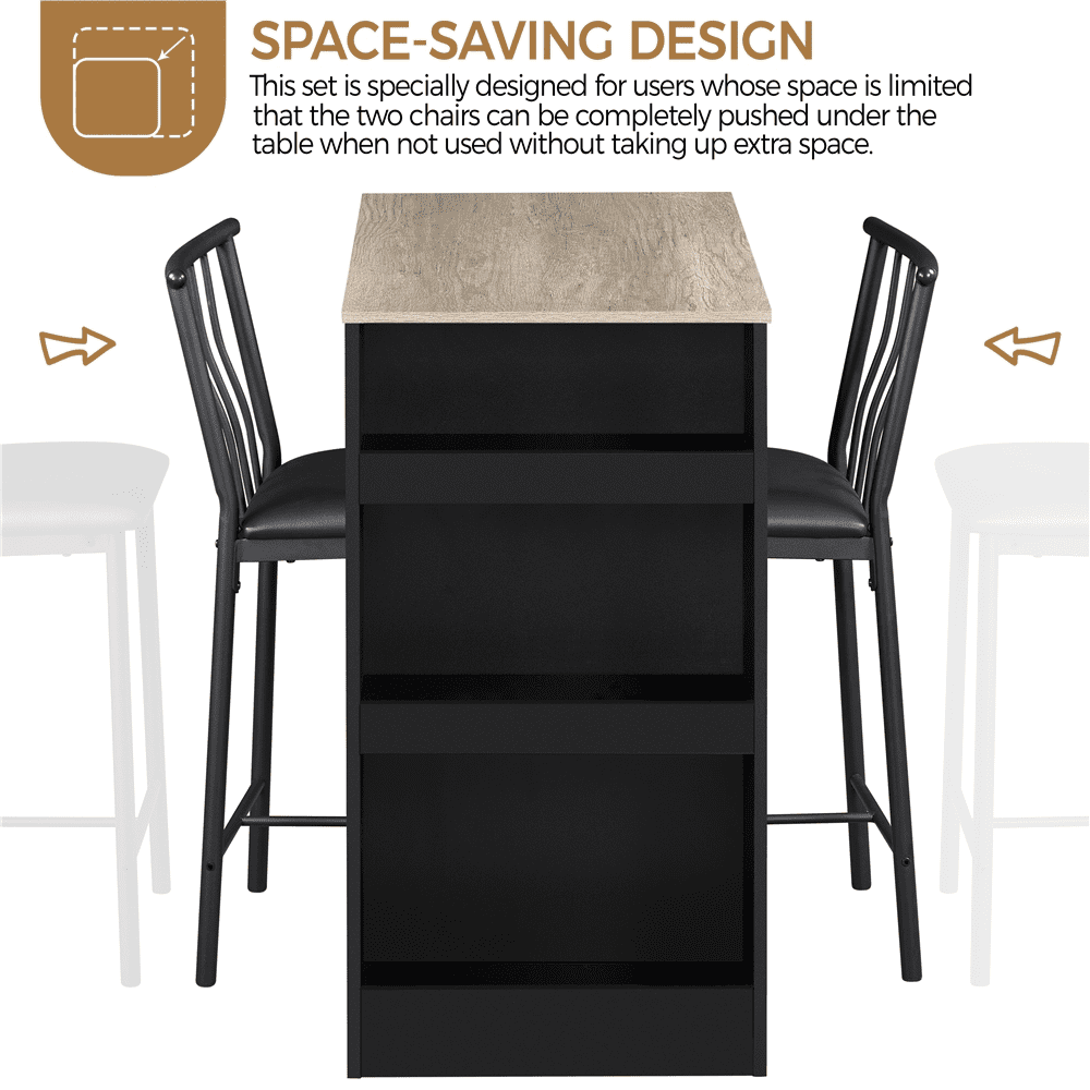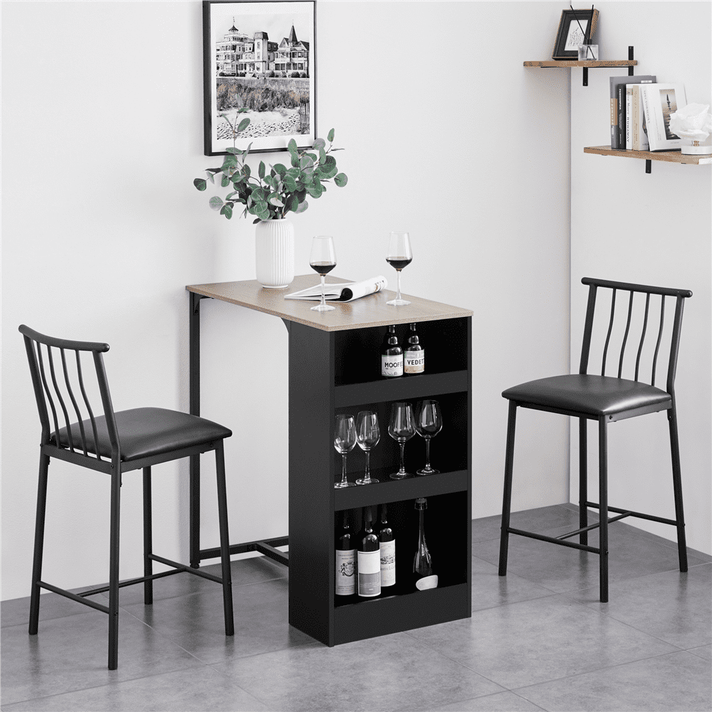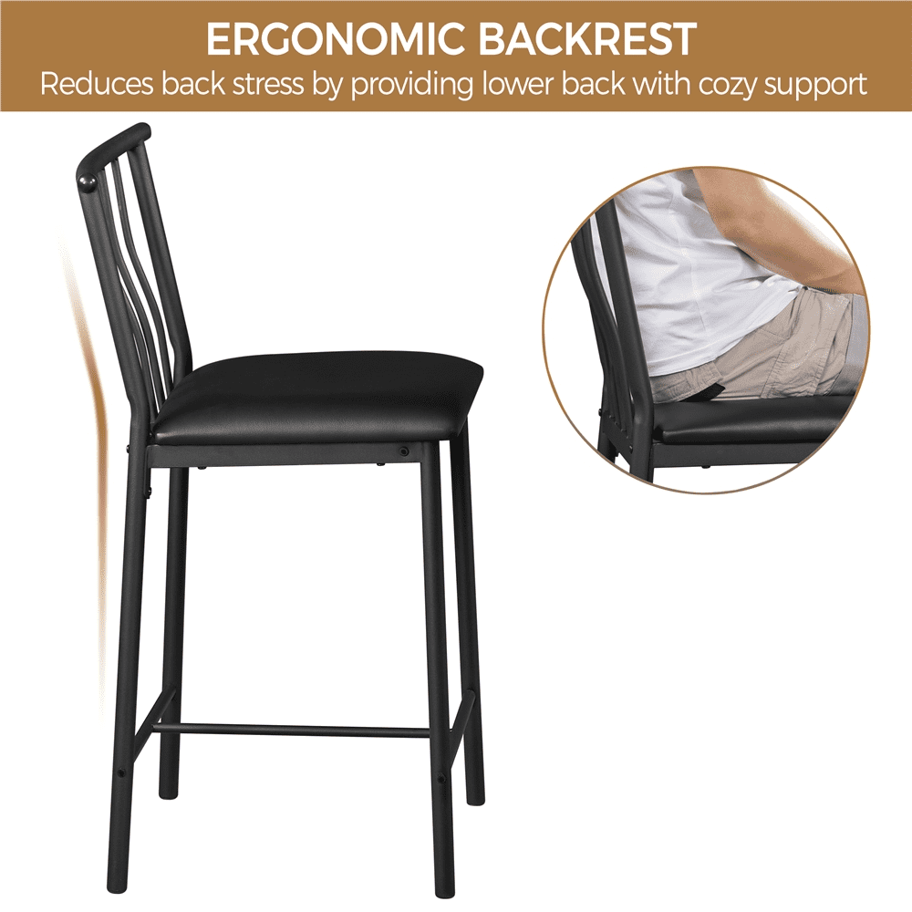 SmileMart 3pcs Vintage Space-saving Counter Table Dining Set with 2* Upholstered Dining Chairs, Black/Gray Chair: Quantity: 2 Color: black Materials: PU leather, iron Dimension: 17*17*35.5’’ (L*W*H) Seat: 15*16’’ (L*W) Distance from Seat to Floor: 24.8’’ Bearing: 286 lb Table: Color: black& rustic brown Materials: MDF, iron Dimension: 36*20*36’’ (L*W*H) Bearing: 99 lb Note: Please allow ±0.4’’ errors due to manual measurement.