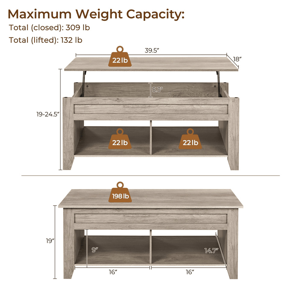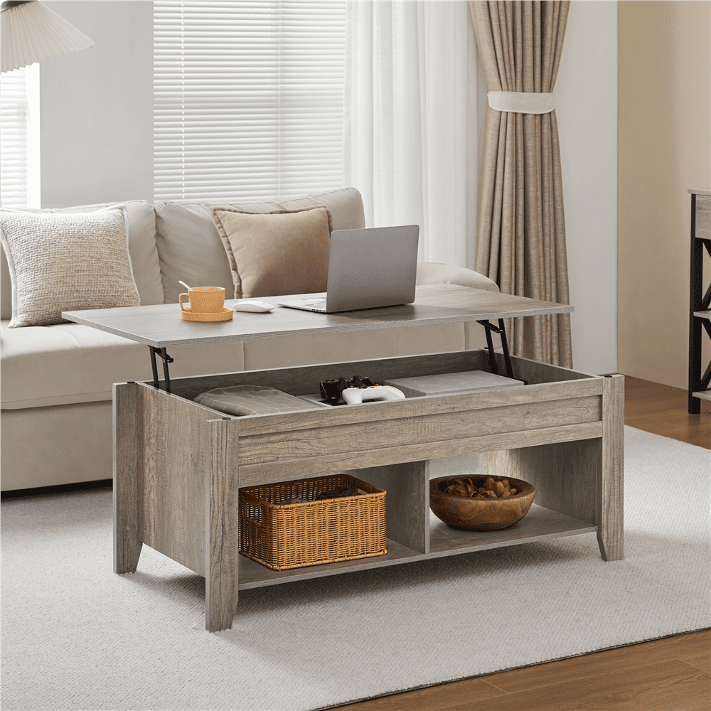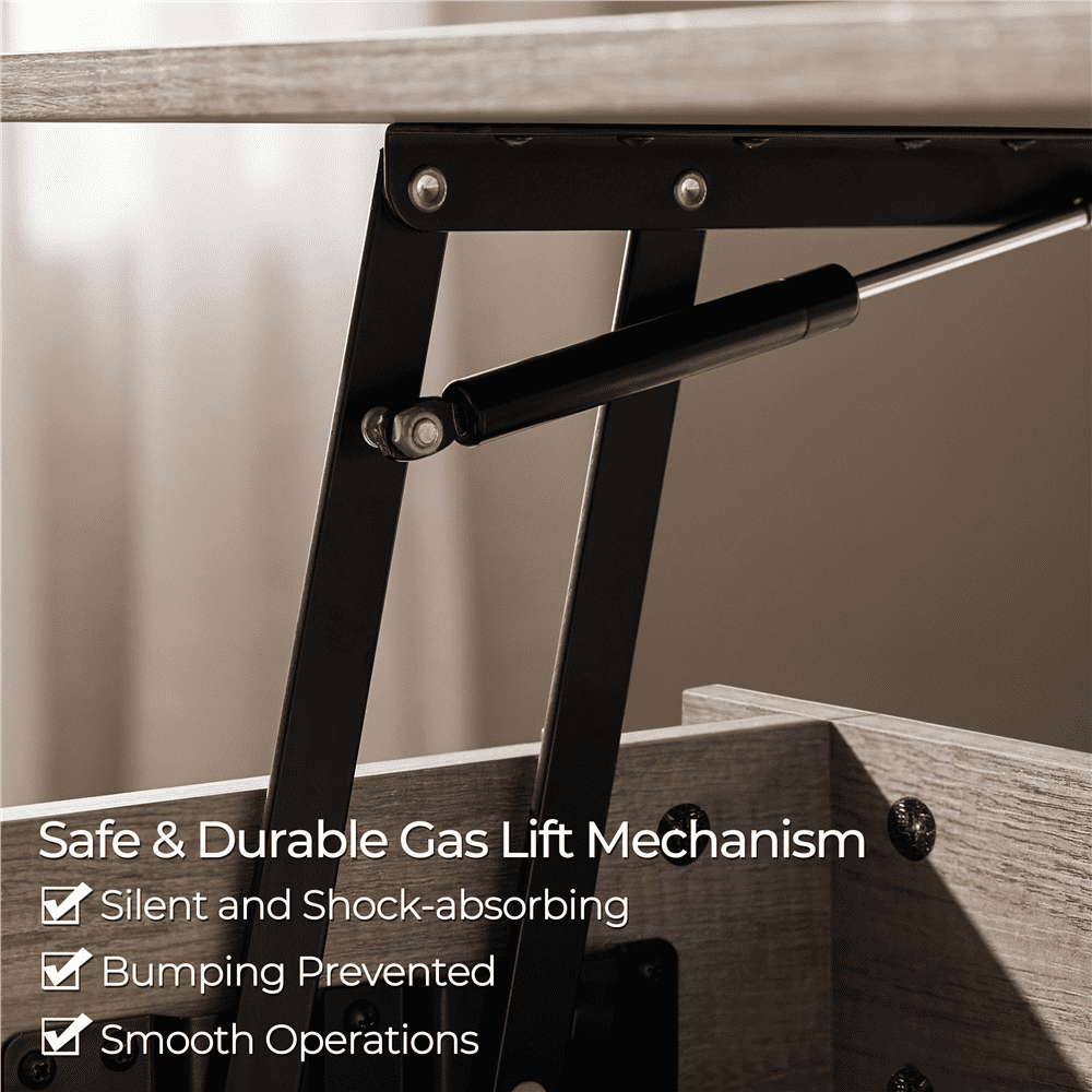 Rustic Charm in Your Home: Featuring clean lines and a distressed finish, this lift-top coffee table brings rustic charm to your space, matching any lodge or farmhouse-style decor in the house. Compact Design with Ample Storage: The spacious compartment beneath the tabletop of this living room table offers plenty of room for essentials, while the open cubbies are ideal for baskets, books, and blankets. For Smaller Spaces: Smoothly switch between a temporary dining/working surface and a coffee table, with a large storage compartment and shelves, this living room furniture is ideal for compact spaces. Upgraded Smooth Gas Lift: The gas lift mechanism offers quieter, smoother, and safer operation for the lift-top coffee table, providing a better user experience compared to a spring lift. Specifications: Color: Gray; Materials: Particle Board, MDF, Metal; Assembled Dimensions (closed): 39.37″ L × 17.72″ W × 19″ H; Extended Tabletop Height: 24.5″; Tabletop: 39.37″ L × 17.72″ W; Total Maximum Weight Capacity: 309 lb (closed), 132 lb (lifted)