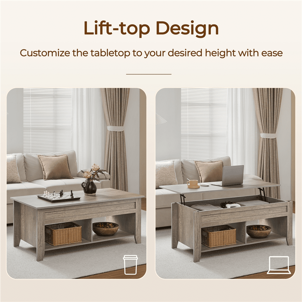 Revamp your living space with this versatile lift-top coffee table, blending function and style. Its smooth gas-lift adjusts the tabletop in seconds—easily switching from a compact coffee table to a handy dining or work surface. Underneath, a hidden compartment and open shelves offer ample storage for daily essentials, keeping things tidy. Made of durable, water-resistant manufactured wood, it’s built to last, with a sleek, neutral design that complements any decor. Perfect for small apartments, lofts, or family rooms, it’s a must-have for compact living and modern looks.