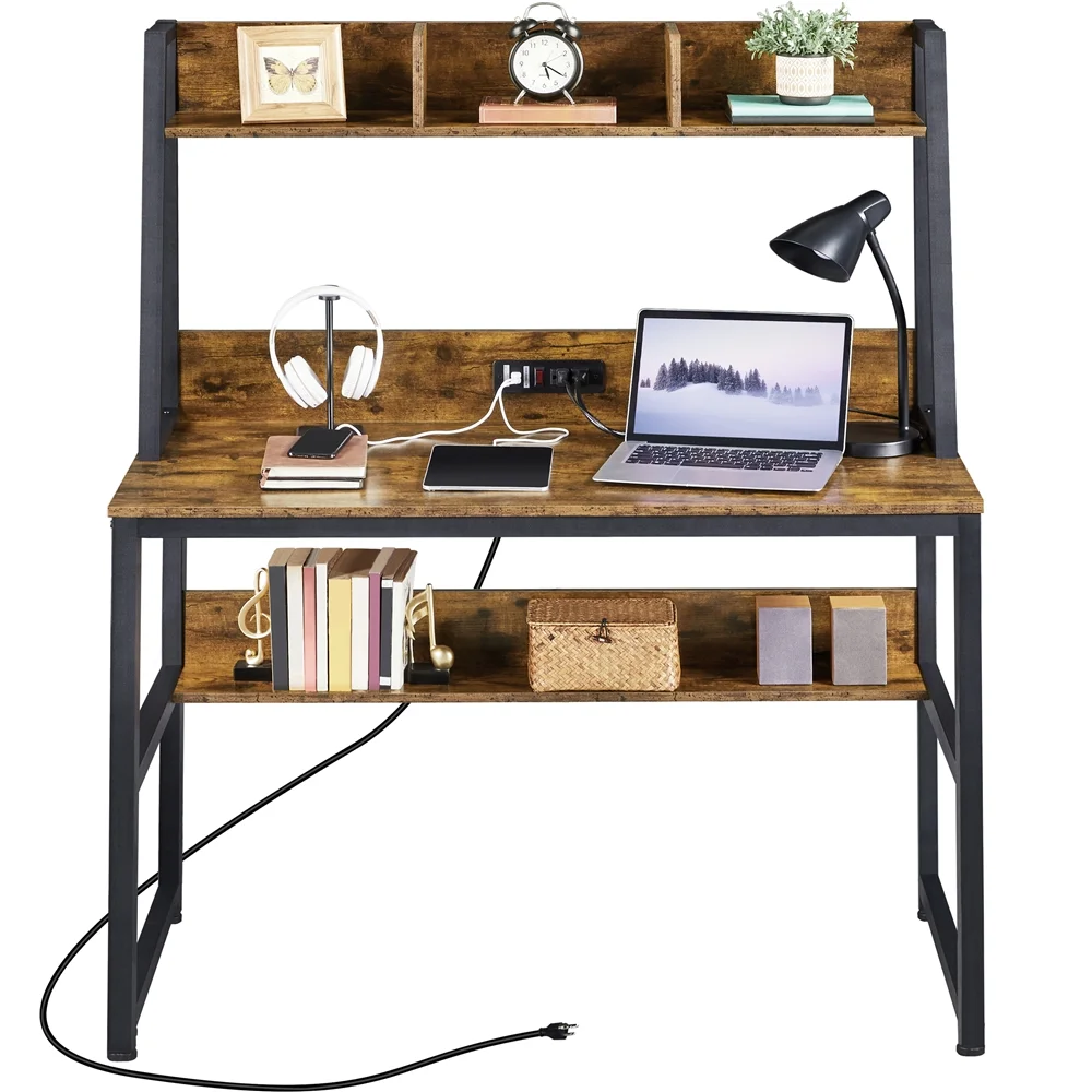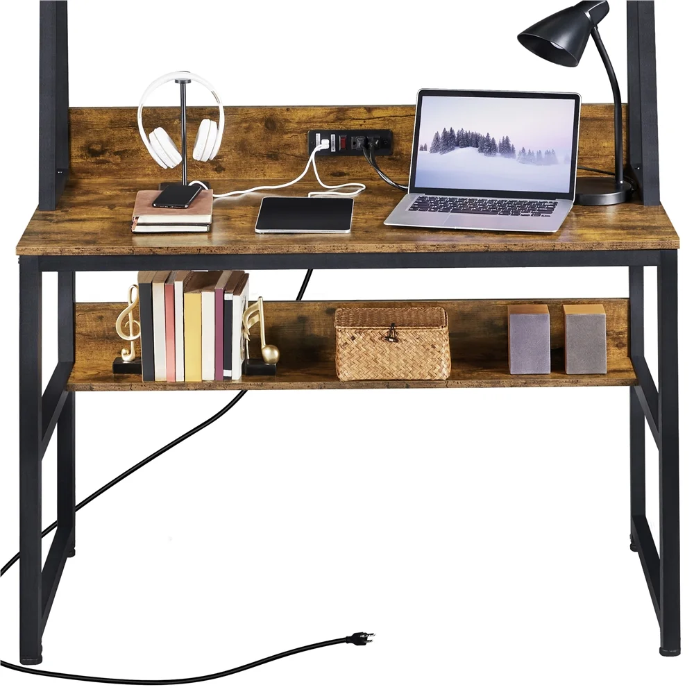 Alden Design 47.5in Computer Desk with Bookshelf and Power Outlet for Home Office, Rustic Brown Premium Materials for Long Companionship Veneered Surface, Anti-Scratch & Water Resistant Easy Assembly Color: Rustic Brown Material: MDF Board & Iron Dimension: 47.5 x 22.5 x 55″ (L x W x H) Desk Dimension: 47.5 x 22 x 29.5″ (L x W x H) Maximum Load Capacity: lower shelf 22 lb desktop: 176.4 lb higher shelf: 33 lb Gross Weight (product in the box): 63 lb Power Outlet: Length: 2m Rated Power: 1500W Ports: 2 ACs & 2 USB Comprising: a switch, a HOOK & LOOP Plugs: 3-plug Cable: double-insulated round wire Note: Please allow ±0.5” measurement tolerance. Please do not use appliances that exceed the power rating of the power outlet!