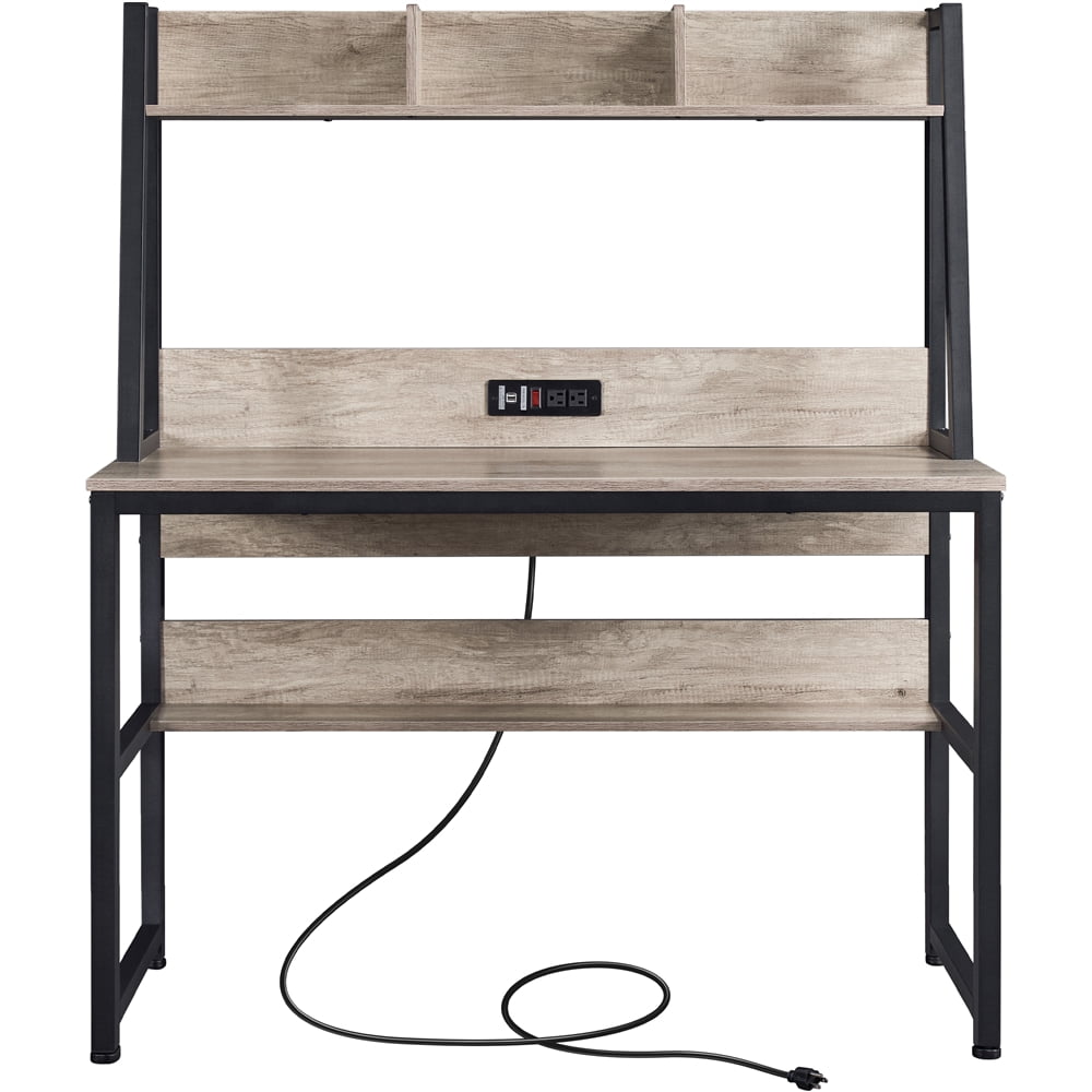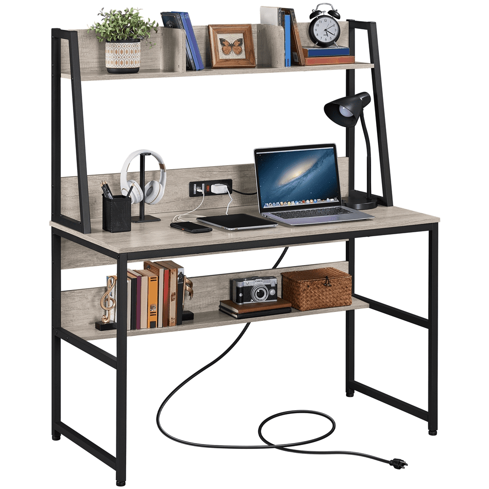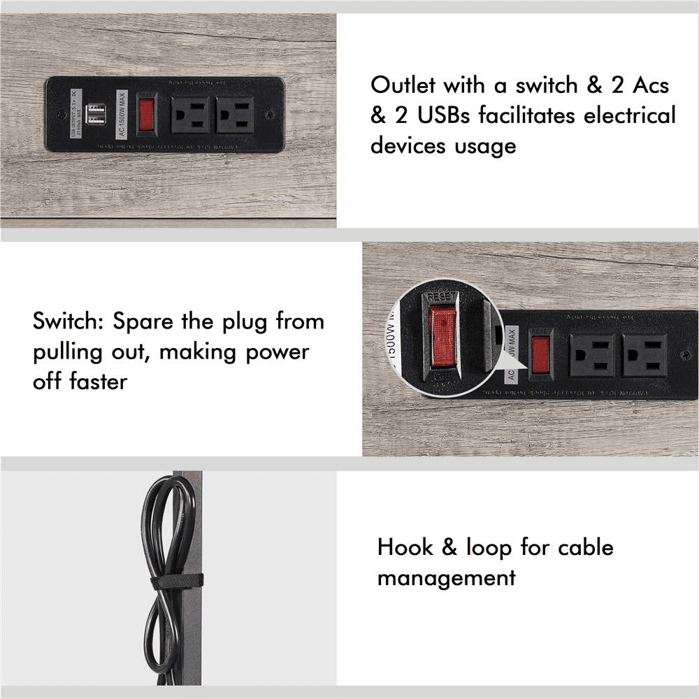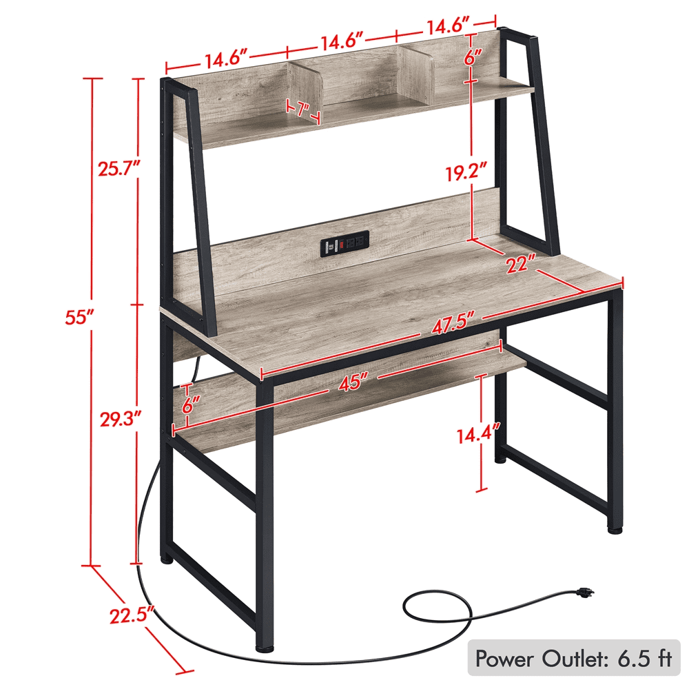 Alden Design 47.5in Laptop Computer Desk with Bookshelf and Power Outlet for Home Office, Gray Premium Materials for Quality and Durability Veneered Surface, Anti-Scratch & Water Resistant Easy Assembly Color: Gray Material: MDF Board & Iron Dimension: 47.5 x 22.5 x 55″ (L x W x H) Desk Dimension: 47.5 x 22 x 29.5″ (L x W x H) Maximum Load Capacity: lower shelf 22 lb desktop 176.4 lb higher shelf: 33 lb Gross Weight (product in the box): 63 lb Power Outlet: Length: 2m Rated Power: 1500W Ports: 2 ACs & 2 USB Comprising: a switch, a HOOK & LOOP Plugs: 3-plug Cable: double-insulated round wire Note: Please allow ±0.5” measurement tolerance. Please do not use appliances that exceed the power rating of the power outlet!