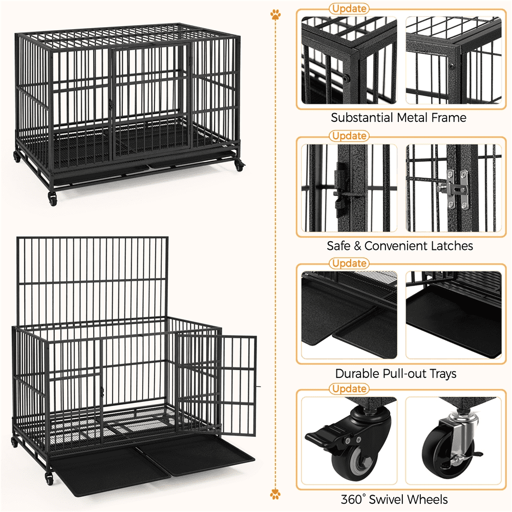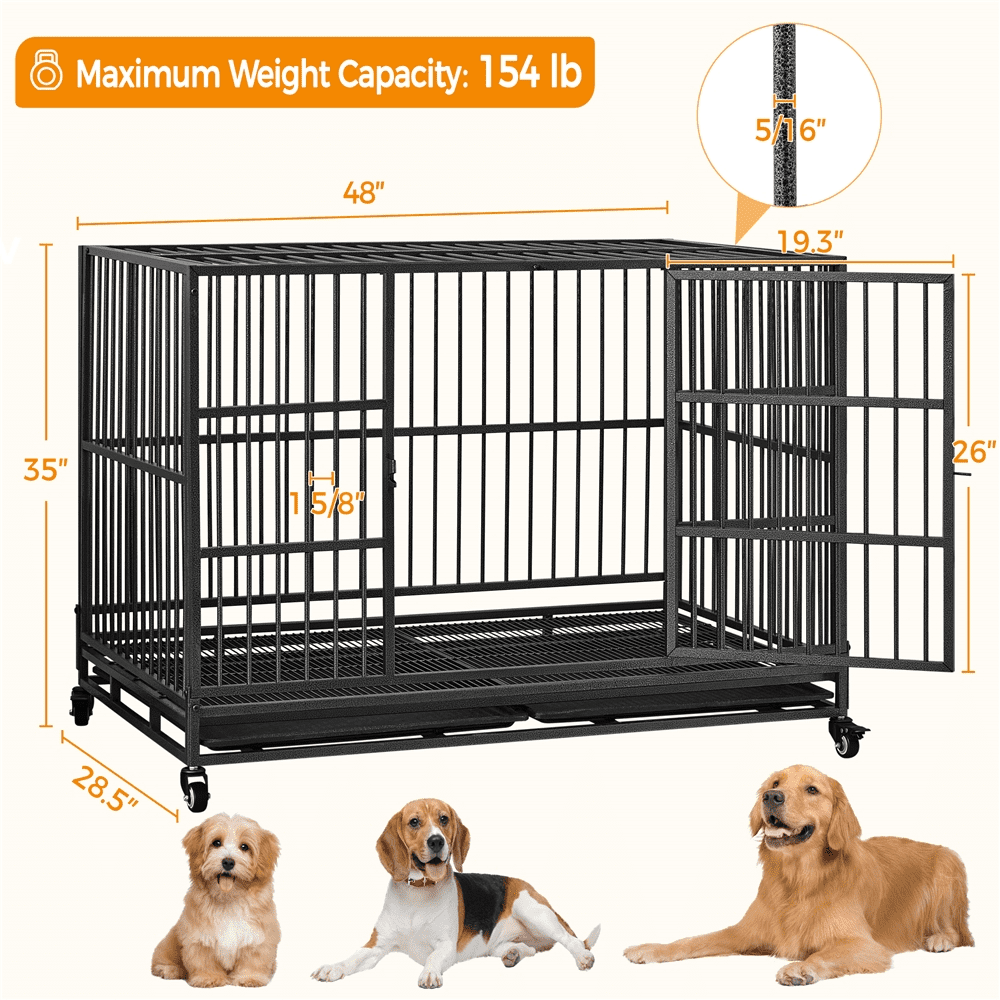 Alden Design 48-inch Indestructible Rolling Dog Crate with Open-Top Design, Black Color: Black Materials: Steel, ABS Bar Spacing: 4 cm / 1 5/8″ Wire Diameter: 5/16″ Assembled Dimensions: 48″ L × 35″ W × 28.5″ H Door: 19.3″ W × 26″ H Maximum Weight Capacity: 154 lb Item Weight: 62.3 lb Shipping Weight: 70.1 lb Note: Please allow a 1/2″ measurement tolerance. Indestructible Metal Construction Spacious For Larger Breeds
