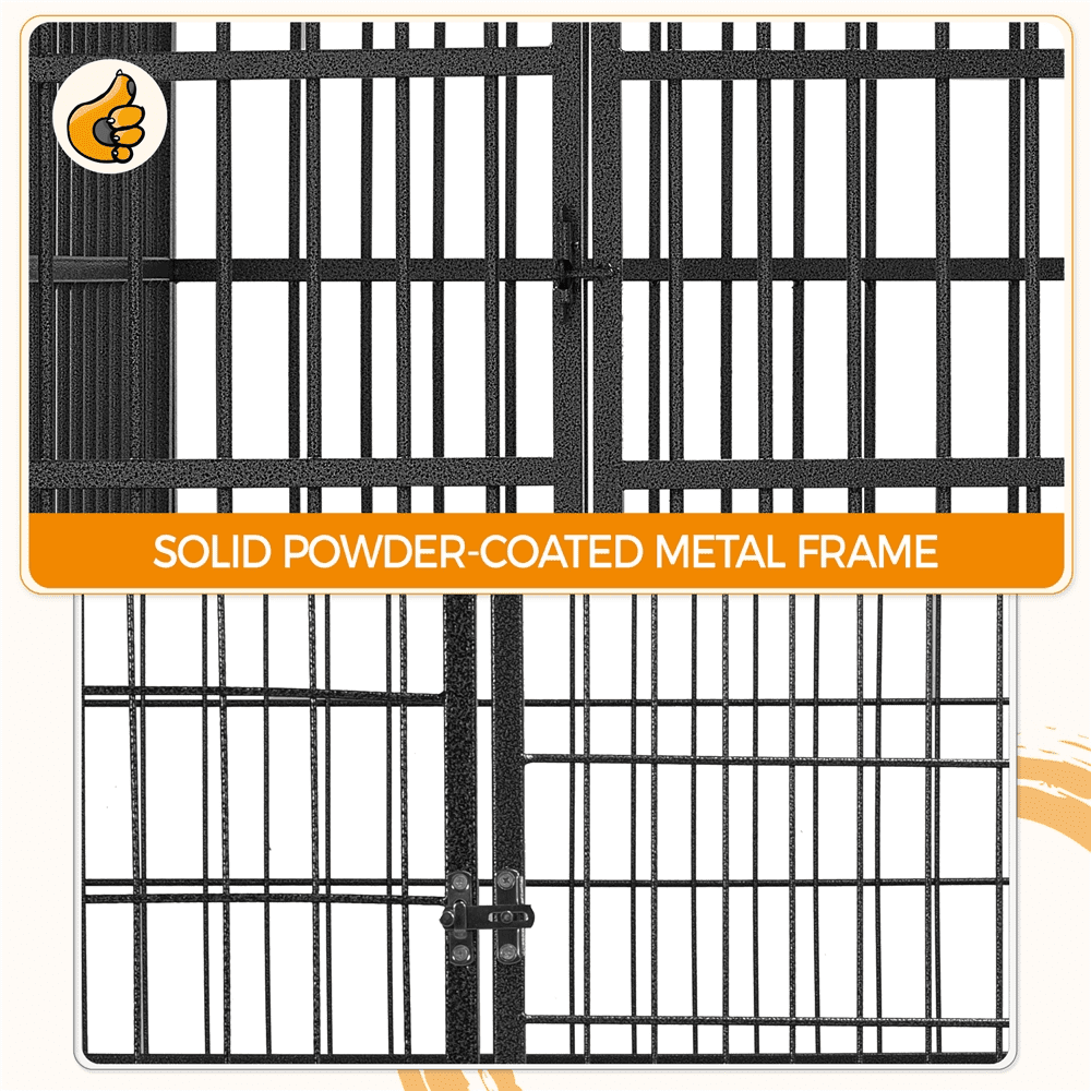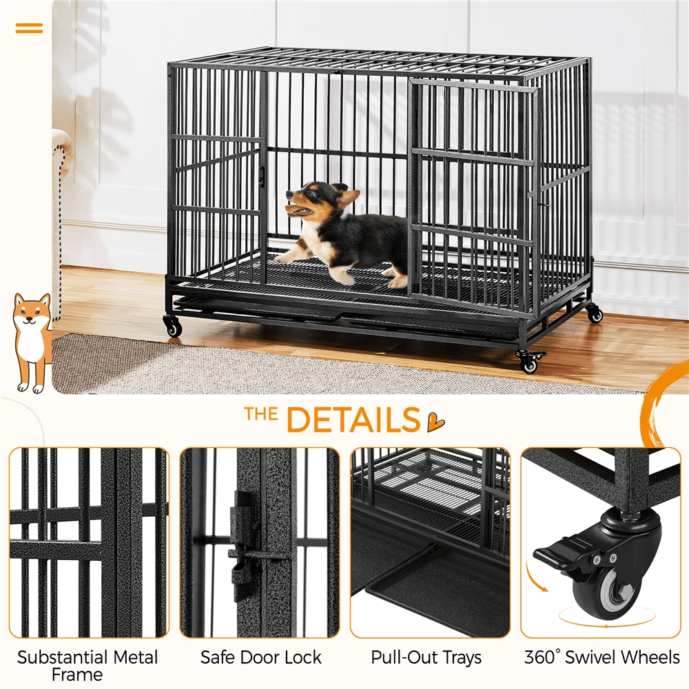 This roomy dog crate, measuring 121 cm in length, 88 cm in width, and 72 cm in height, with a high capacity of 70 kg, is ideal for larger breeds like Bernese Mountain Dogs, Rottweilers, and German Shepherds. Crafted for durability, the indestructible dog crate features a robust metal construction with 20-gauge steel, 8 mm diameter wires, and 1.6 cm square frame tubes, all powder-coated in waterproof paint for enhanced strength. Designed for convenience, this rolling dog crate sits on four 360-degree swivel wheels, allowing easy movement and flexibility in daily activities. The open-top design of this large dog crate facilitates quick access to your pet, especially in situations requiring interaction or treat-giving without fully opening the front door. For added security, latches secure the top when you need a more protected space for your dog. Other convenient designs, like the pull-out trays and easy-to-lock door latch, make this dog crate a must-have for dog parents. The assembly for this drop dog crate is also quick and straightforward. Thanks to the pre-assembled panels, you can finish the setup within half an hour.