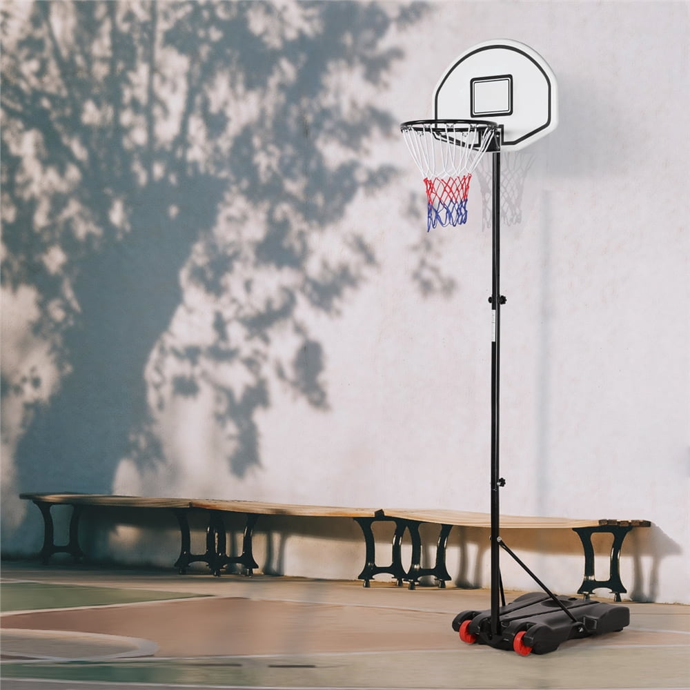 SmileMart 1.9-2.5M Height Adjustable Basketball Hoop System for Outdoor, Black Color: just as pictures show Materials: iron, PE plastic, synthetic fiber Overall dimension: 73 x 73.5 x (196-251) cm / 2.4 x 2.4 x (6.4-8.2) ft (L x W x H) Adjustable height between rim and ground: 159-214 cm/ 5.2-7ft Backboard size: 73 x 49 x 1.6 cm/ 28.7 x 19.3 x 0.6’’ (L x W x Thickness) Basketball rim diameter: 42 cm/ 16.5’’ Wheel diameter: 10 x 3 cm / 4 x 1.2’’ (Dia. x H) Maximum base weight (filled with water): 33kg /8.7-gallon N.W.: 8.1 kg / 17.8 lb G.W.: 9.5 kg / 20.8 lb Note: For added safety, ensure to fill the base with water or sand before use. To avoid the basketball stand tipping over and causing personal injury, please do not dunk.