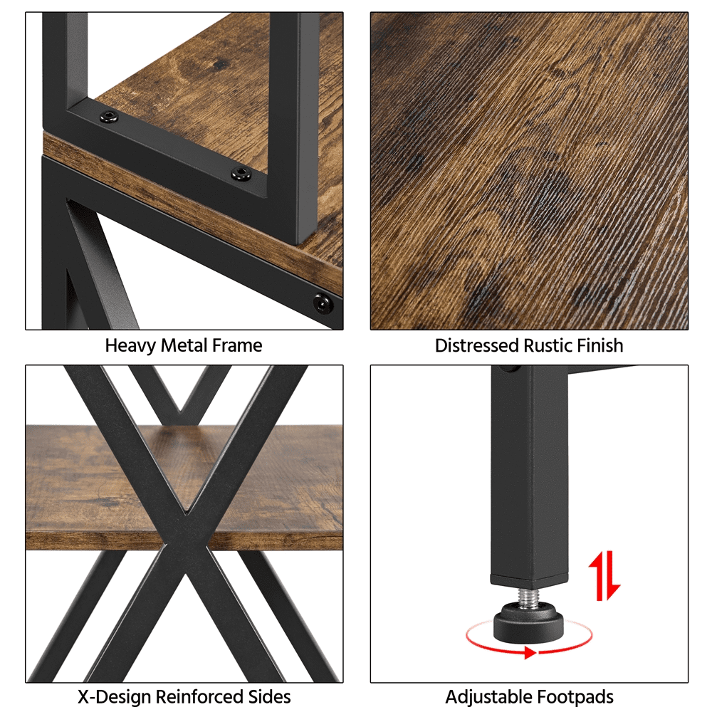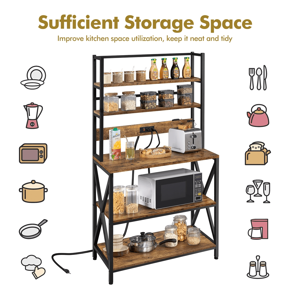 SmileMart 5-Tier Kitchen Baker’s Racks with Power Outlets for Kitchens, Rustic Brown Color: Rustic Brown Materials: Engineered Wood, Metal Power Outlet: 2 AC Outlets with a Switch Power Cord Length: 6.5′ Power Cord Type: Double-Insulated Round Cable Overall Dimensions: 35.5″ L × 16″ W × 64.5″ H Countertop Height: 33″ Countertop: 35.5″ L × 16″ W Upper Shelf: 35.5″ L × 5.6″ W Lower Shelf: 34″ L × 16″ W Distance Between Shelves (from top to bottom): 8″; 13.7″; 14″; 12.6″ Net Weight (assembled product weight): 44.1 lb Gross Weight (product in the box): 48.6 lb Maximum Weight Capacity (from top to bottom): Upper Shelf (each): 18 lb Countertop: 44 lb Lower Shelf (each): 44 lb Note: 1. Please allow a 1/2″ measurement tolerance. 2. Please do not overload the product. 3. Please do not stand or sit on this item.