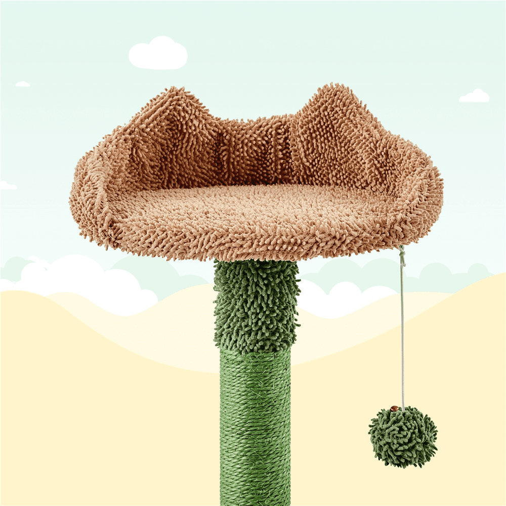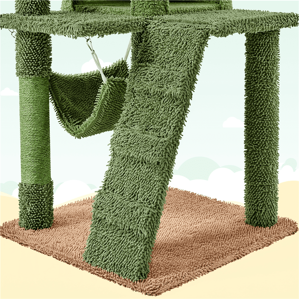 Designed to capture the awe-inspiring beauty of desert landscapes, this tower features a captivating combination of vibrant green and brown colors, along with accents inspired by cactus stems. The tower stands at a height of 53.5”, and is crafted using green materials including CARB P2-compliant particle board, durable moppy fabric, as well as natural sisal rope, ensuring a safe and comfortable space for your pets to play and nap. With multiple scratching posts, this tower encourages positive scratching habits while protecting your furniture from those sharp little claws. The warm and fluffy condo, along with the hammock, creates the perfect lounging spots for your adventurous pets after they finish exploring the cactus-shaped post and ladder.