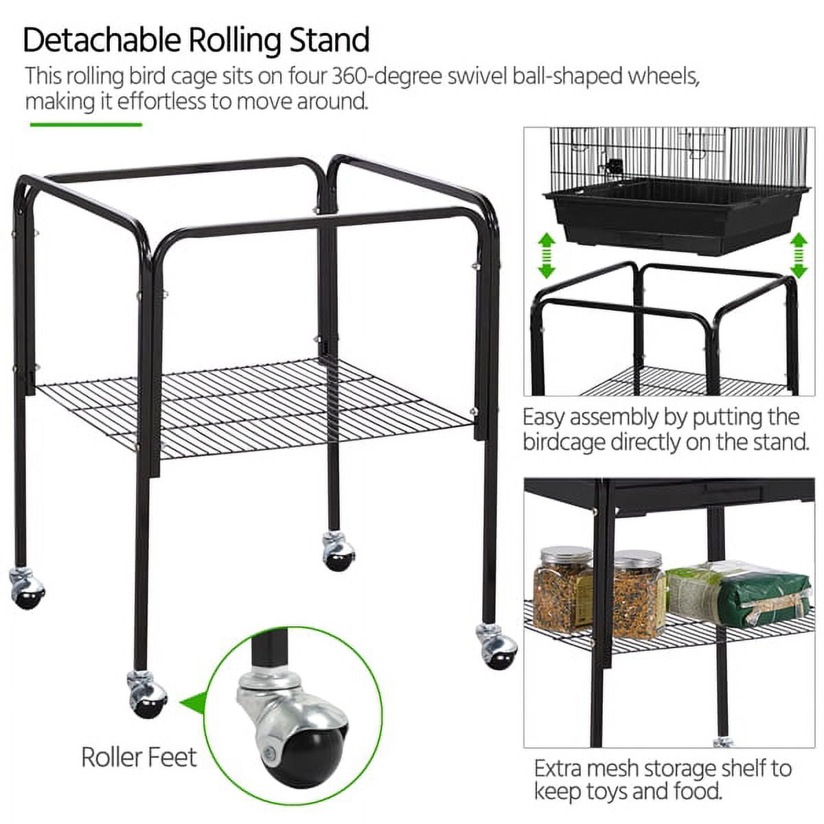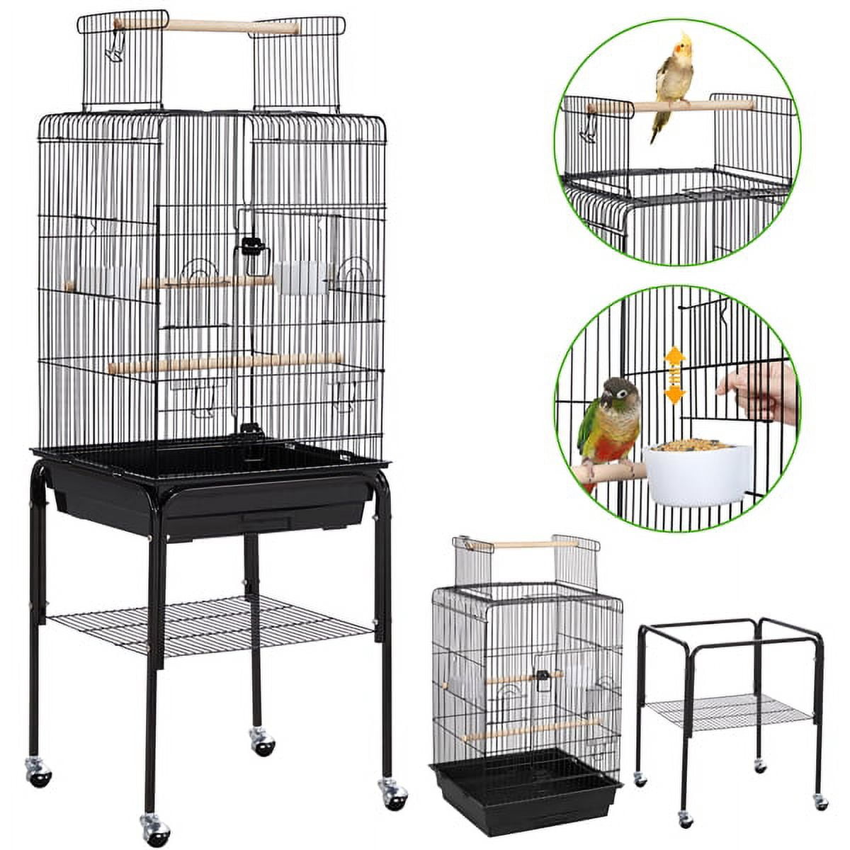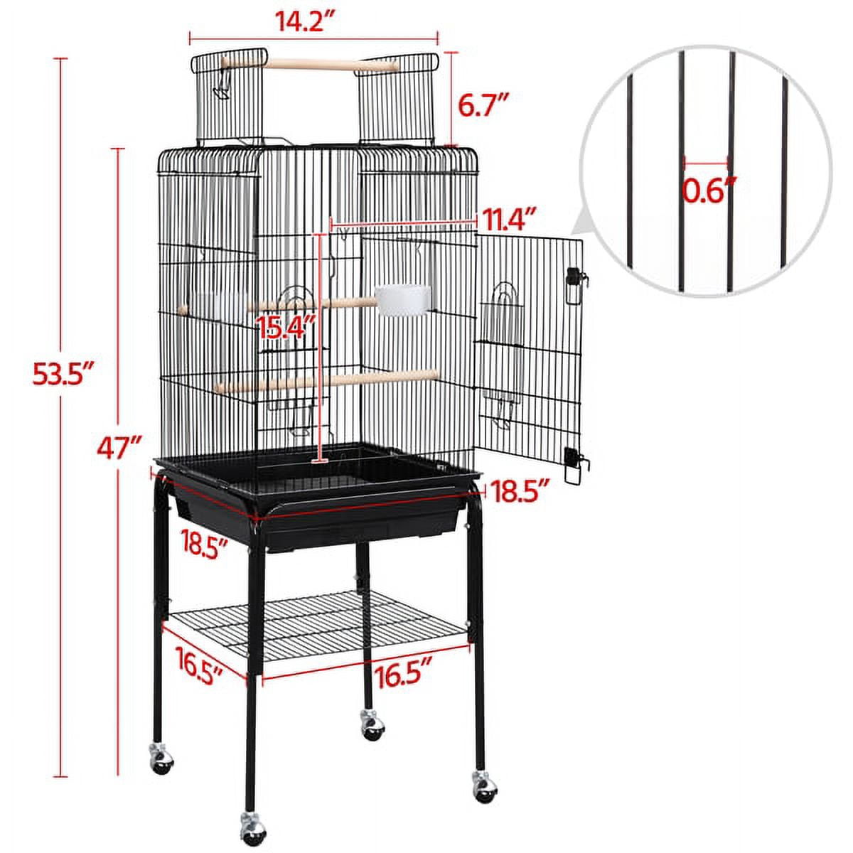 SmileMart 47inch Rolling Bird Cage with Play Top Stand Metal Bird Cage for Small Birds,Black Features: Interactive play top: To keep your bird stimulated and provide both you and your feathery friends with a better interaction way, we upgraded this 47-inch bird cage by adding an easy-to-use play top. It includes a perch that keeps the top doors open for the birds to stand on, and can be closed to give them a safe enclosed home. Convenient feeding system: On the facade of this rolling bird cage are two feeding cups that can be accessed outside the cage through the small feeding doors. This convenient design helps easy bird seed refilling without disturbing your easily-scared friends. Solid construction: Crafted from quality metal wires covered with non-toxic rust-resistant paint, our bird cage is a strong metal structure with an easy-to-clean plastic base, and two sanded wooden perches for the birds to play. Make cleaning a breeze: To ensure good user experience for pet parents as well, this cage has slide-out tray for collecting bird droppings and easy cleaning. Extra accessory storage: Another thoughtful design for pet parents is the extra storage shelf on the stand. It can keep bird cage cleaning tools, bird seeds and toys handy and neat. Detachable rolling stand: This rolling bird cage sits on four 360-degree swivel ball-shaped wheels, making it effortless to move around. The upper cage can be used separately thanks to the detachable design. You can place/carry the cage without the stand at will. Perfect for small birds: This cage measures 46.5cm/18.5inch long, 46.5cm/18.5inch wide and 71cm/28inch high. The decent size of this cage provides plenty of living space and room for activity to small birds like canary, cockatiel, lovebirds, etc. Specifications: Material: painted metal, PP plastic, ABS plastic Overall dimension (with top closed): 46.5×46.5x119cm/18.5×18.5x47inch (LxWxH) Overall dimension (with top open): 46.5×46.5x136cm/18.5×18.5×53.5inch (LxWxH) Cage size (with top closed): 46.5×46.5x71cm/18.5×18.5x28inch (LxWxH) Bar spacing: 1.5cm/0.6inch Metal wire diameter: 3mm/0.12inch; 2mm/0.08inch Door size: 39x29cm/15.4×11.4inch (LxW) Rolling stand size: 45.5x46x58.5cm/18x18x23inch (LxWxH) Storage shelf size: 42x42cm/16.5×16.5inch (LxW) G.W.: 8.3kg/18.3lb Color: black Note: Please allow 0.5-1cm/0.5-1 inch errors due to manual measurements.