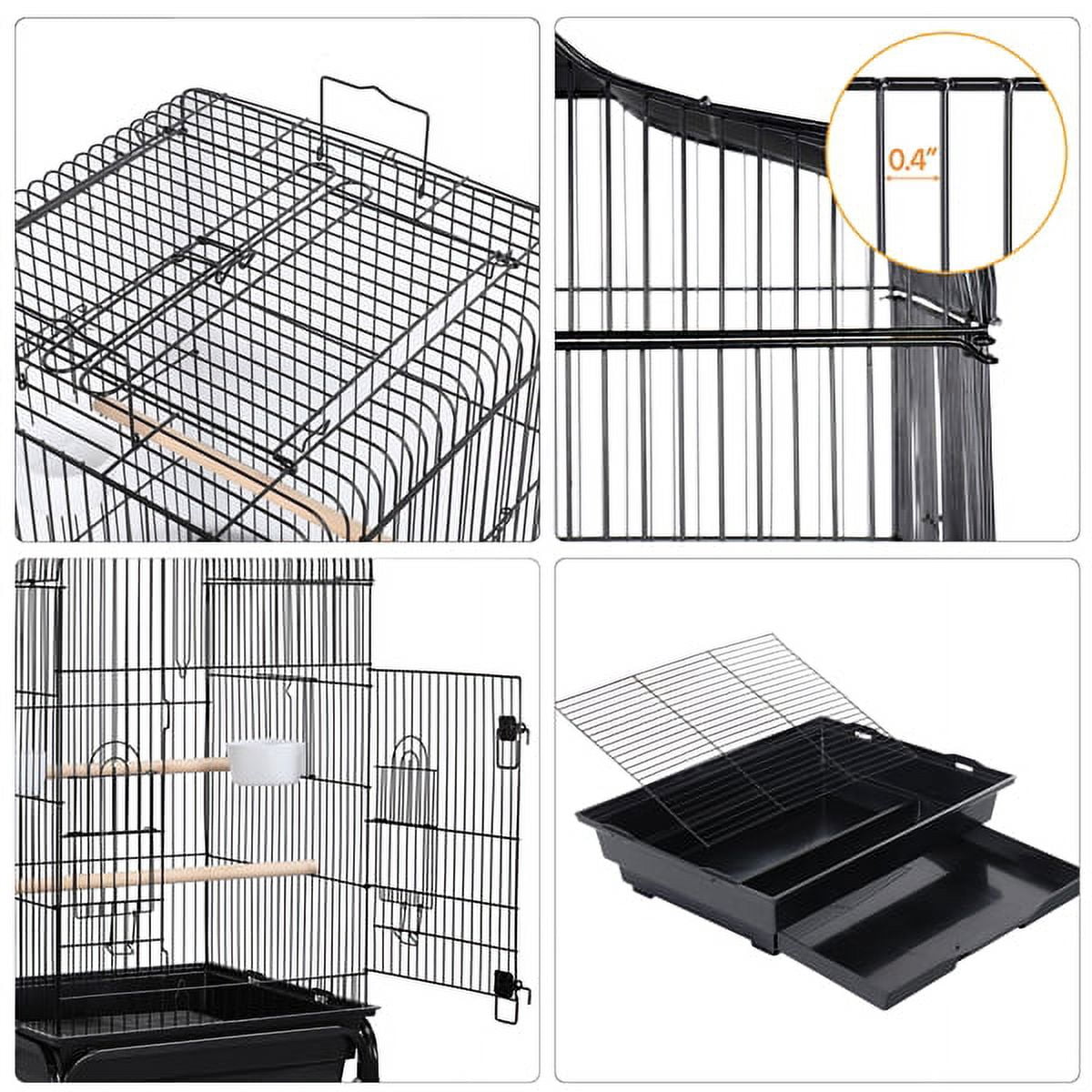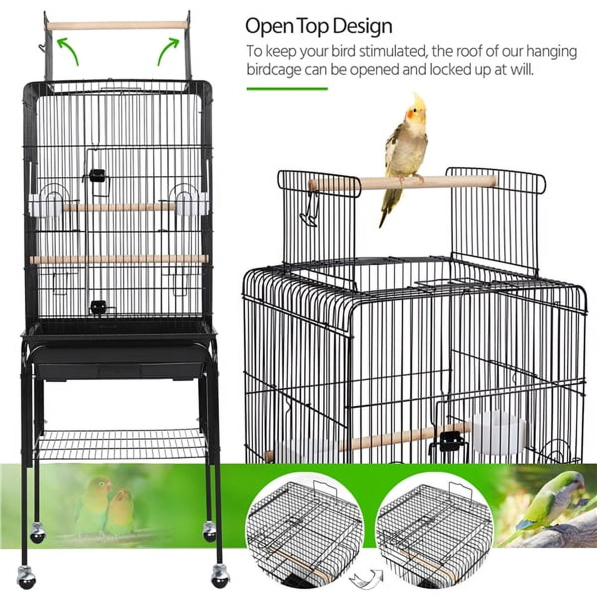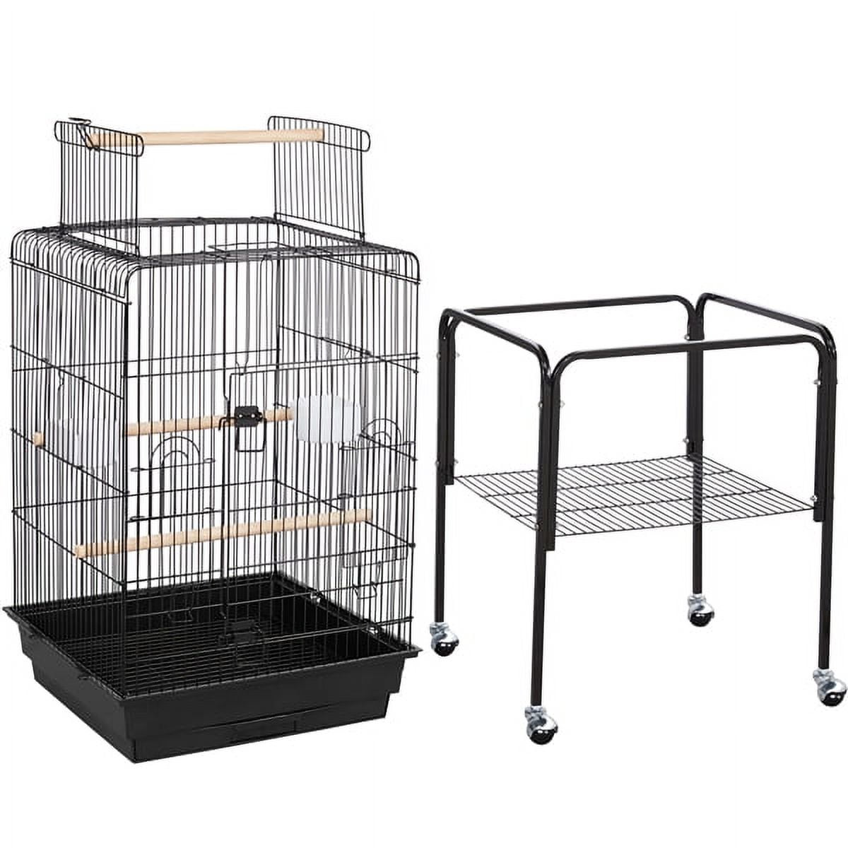 SmileMart 47inch Rolling Bird Cage with Play Top Stand Metal Bird Cage for Small Birds,Black Features: Interactive play top: To keep your bird stimulated and provide both you and your feathery friends with a better interaction way, we upgraded this 47-inch bird cage by adding an easy-to-use play top. It includes a perch that keeps the top doors open for the birds to stand on, and can be closed to give them a safe enclosed home. Convenient feeding system: On the facade of this rolling bird cage are two feeding cups that can be accessed outside the cage through the small feeding doors. This convenient design helps easy bird seed refilling without disturbing your easily-scared friends. Solid construction: Crafted from quality metal wires covered with non-toxic rust-resistant paint, our bird cage is a strong metal structure with an easy-to-clean plastic base, and two sanded wooden perches for the birds to play. Make cleaning a breeze: To ensure good user experience for pet parents as well, this cage has slide-out tray for collecting bird droppings and easy cleaning. Extra accessory storage: Another thoughtful design for pet parents is the extra storage shelf on the stand. It can keep bird cage cleaning tools, bird seeds and toys handy and neat. Detachable rolling stand: This rolling bird cage sits on four 360-degree swivel ball-shaped wheels, making it effortless to move around. The upper cage can be used separately thanks to the detachable design. You can place/carry the cage without the stand at will. Perfect for small birds: This cage measures 46.5cm/18.5inch long, 46.5cm/18.5inch wide and 71cm/28inch high. The decent size of this cage provides plenty of living space and room for activity to small birds like canary, cockatiel, lovebirds, etc. Specifications: Material: painted metal, PP plastic, ABS plastic Overall dimension (with top closed): 46.5×46.5x119cm/18.5×18.5x47inch (LxWxH) Overall dimension (with top open): 46.5×46.5x136cm/18.5×18.5×53.5inch (LxWxH) Cage size (with top closed): 46.5×46.5x71cm/18.5×18.5x28inch (LxWxH) Bar spacing: 1.5cm/0.6inch Metal wire diameter: 3mm/0.12inch; 2mm/0.08inch Door size: 39x29cm/15.4×11.4inch (LxW) Rolling stand size: 45.5x46x58.5cm/18x18x23inch (LxWxH) Storage shelf size: 42x42cm/16.5×16.5inch (LxW) G.W.: 8.3kg/18.3lb Color: black Note: Please allow 0.5-1cm/0.5-1 inch errors due to manual measurements.