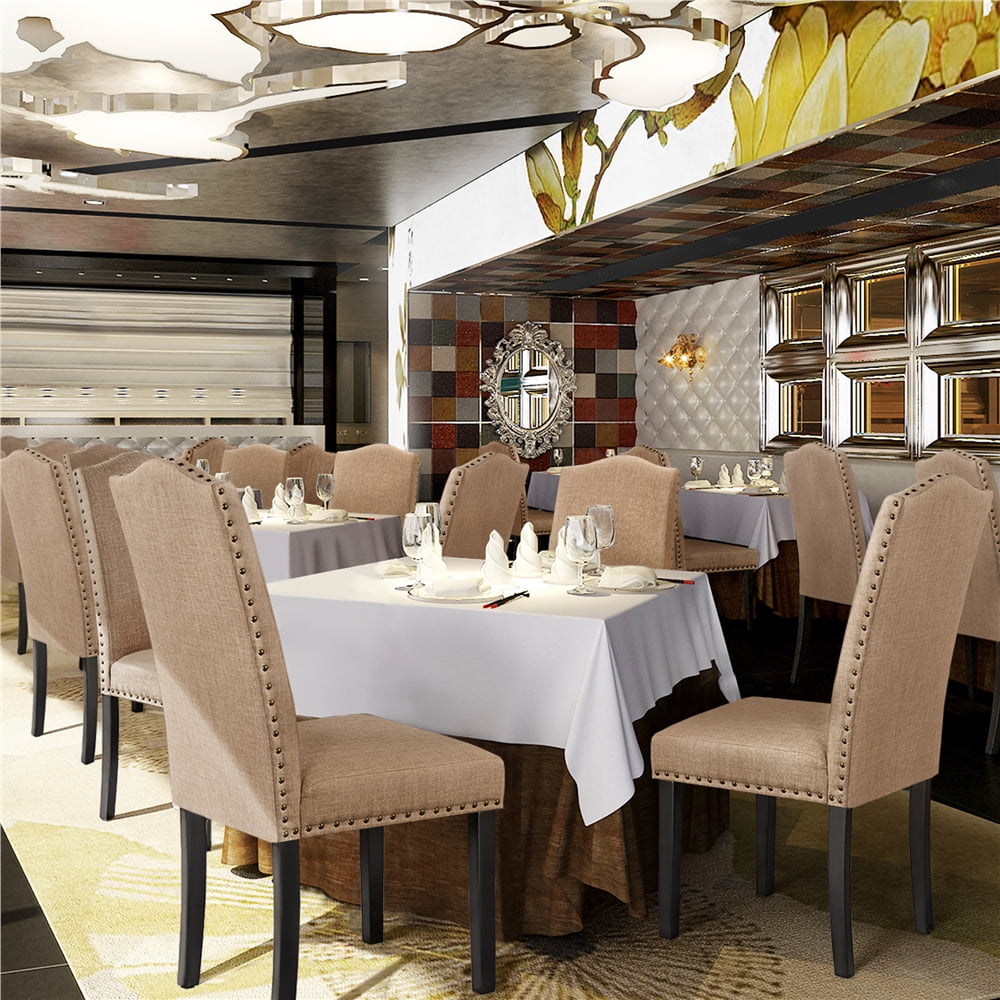 Make your mealtime comfortable with this set of 6 fabric dining chairs. Constructed with an engineered & solid wood frame, a high-density foam seat with breathable linen-like fabric upholstery, sturdy rubberwood legs, and a curved high backrest, these chairs offer lasting comfort and durability. The sleek lines and chic nailhead trim add an elegant touch, making this set effortlessly complement your home décor. Ideal for dining rooms, kitchens, cafés, restaurants, and hotels.