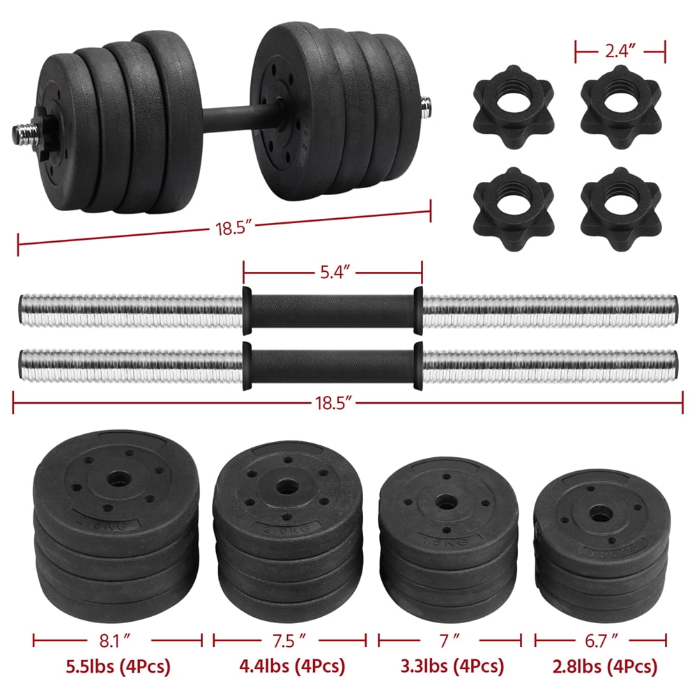 Durable Material: This 66 lb dumbbell set is constructed of concrete weight plates covered with hard plastic and electroplated iron dumbbell bars. Oxidation-proof and water-resistant materials provide you with long service life Full Set of 2 Dumbbells: Our adjustable dumbbell set comes with 16 weight plates in 4 different weights (2.5 kg/5.5 lbs, 2 kg/4.4 lbs, 1.5 kg/3.3 lbs, 1.25 kg/2.8 lbs), 4 pieces for each weight; 2 iron bars measure at 47 x 2.5 cm/18.5 x 1’’ (LxDia.) with a 13.6 cm /5.4’’ long handle for each bar; 2 star-lock collars Secure Spinlock Collars: Our dumbbell bars with threaded ends and star-lock collars prevent plates from loose or falling, ensuring secure gripping and easy weight plate changes Easy to Use: Compact dumbbells are easily assembled within seconds. The customizable design cuts the need for a clutter of dumbbells in your home gym while allowing you to perform a range of workout exercises to shape your body Floor Protection: These weight plates covered with hardened plastic help avoid causing scratches or damage to the floor, suitable for both home and commercial use