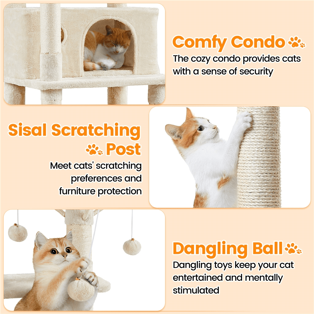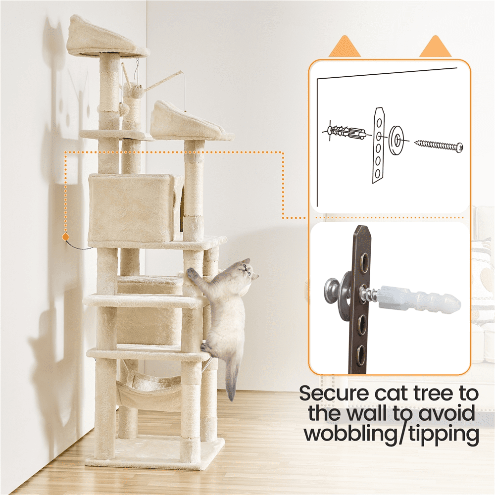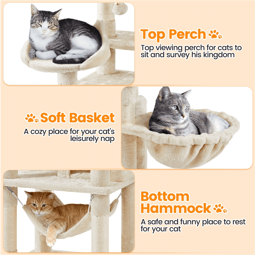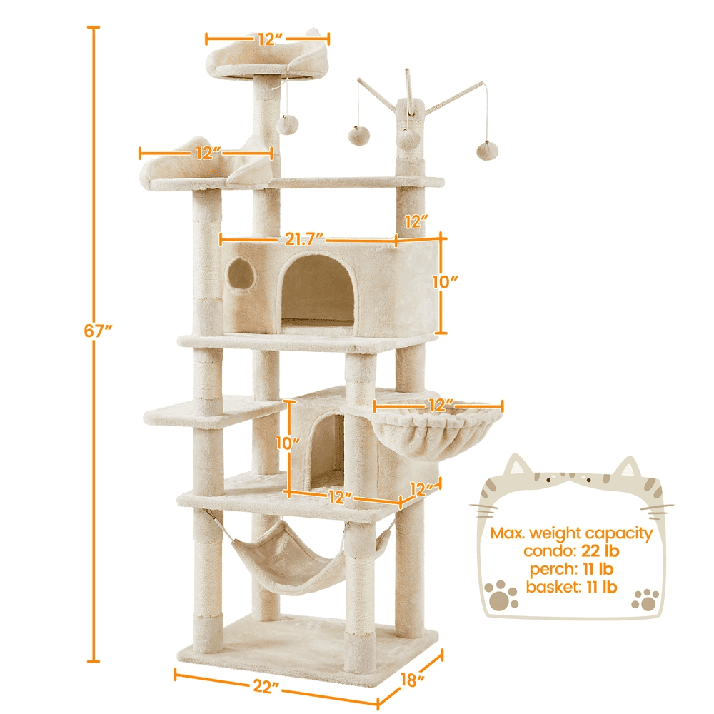 Alden Design 67″ H Large Multi-Level Cat Tree with 2 Cat Condos for Indoor Cats, Beige Removable Cat Teaser Sticks Dangling Ball Adds Extra Fun Stable Design For Safe Leaping Maximum Load Capacity Both for Fun & Rest Materials: Particleboard, Plush, Sisal Color: Beige Assembled Dimensions: 22″ L × 18″ W × 67″ H Baseboard: 22″ L × 18″ W Cat-ear-shaped Perch: 12″ Dia.× 6″ H Cubic Condo: 12″ L × 12″ W × 10″ H; Door: 7″ W × 8″ H Cuboid Condo: 21.7″ L × 12″ W × 10″ H; Door: 7.5″ W × 8″ H; Window: 3″ Dia. Hammock: 16″ L × 12.4″ W Basket Diameter: 12.2″ Removable Cat Teaser Sticks: 10.6″ Maximum Weight Capacity: Perch: 11 lb Condo: 22 lb Basket: 11 lb Shipping Weight: 45 lb Item Weight: 42.5 lb Note: Please allow a 0.6″ measurement tolerance. Removable Cat Teaser Sticks Stable Design For Safe Leaping