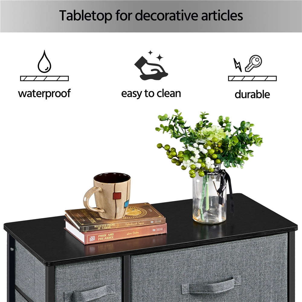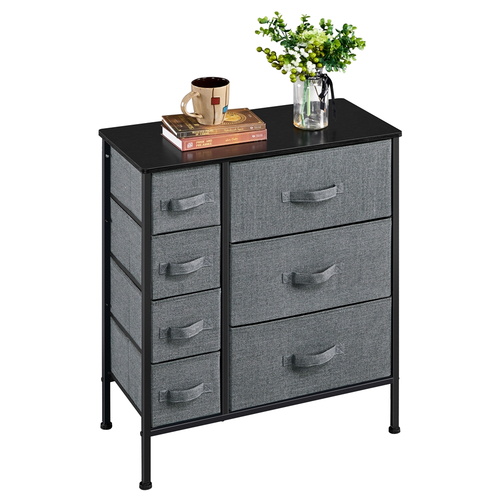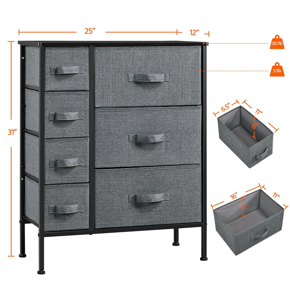 SmileMart 7-Drawer Fabric Storage Tower with Black Metal Frame, Dark Gray: Wooden inserts in drawers to support your items Easy to clean fabric material Color: Dark Gray, Black Material: Iron, MDF Boards, Fabric Overall Dimension: 63.5 x 30 x 79 cm/25 x 12 x 31.5” (LxWxH) Big Drawer Dimension: 40 x 27.5 x 20.4 cm/15.7 x 11 x 8” (WxDxH) Small Drawer Dimension: 16 x 27.5 x 15.5 cm/6.3 x 11 x 6” (WxDxH) G.W. : 8.5 kg/18.7 lb Max. Load Capacity of the Tabletop: 29 kg/64 lb Max. Load Capacity of Each Drawer: Big: 2.6 kg/6 lb; Small: 1.6 kg/4 lb Note: Please allow ±1cm/0.5” error due to manual measurement. Please secure the storage to the wall with the provided hardware. Easy to assemble: It is super easy to put this drawer chest together. All necessaries and instructions are accompanied in the package.