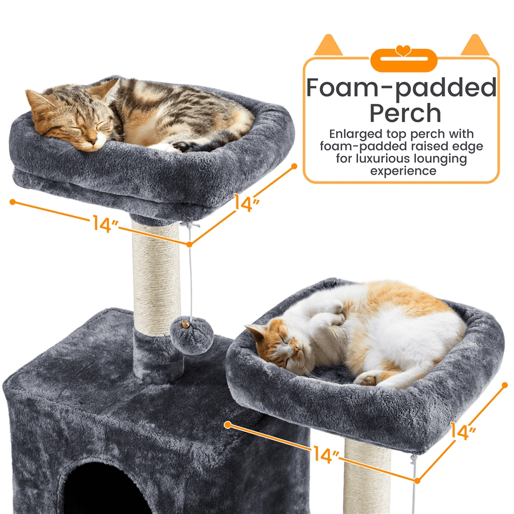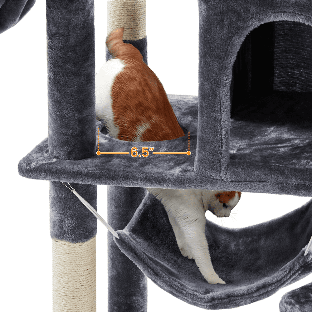 Alden Design 71″ H Multi-Level Large Cat Tree with 2 Cozy Perches 2 Condos,Dark Gray Color: dark gray Material: particle board,plush & sisal rope Overall dimension (approx.): 24 ” L x 19 ” W x 71 ” H Top perch sizee:: 14 ” L x 14 ” W x 3.3 ”H Big condo size (approx.): 19.5 ” L x 12.2 ” W x 12 ” H Small condo size (approx.): 16 ” L x 12.2 ” W x 12 ” H Door size: 7.5 ” W x 8.7 ” H Basket size: 14.2 ” Dia. Hammock size: 16 ” L x 12.6 ” W Ramp size: 11.2 ” L x 6.5 ” W Base board size: 23.6 ” L x 19 ” W; Round hole: 6.5 ” Dia. Maximum weight capacity: basket: 13 lb; condo: 22 lb; perch: 11 lb; hammock: 18 lb Net weight (assembled product weight): 41.4 lb Gross weight (product in the box): 42.8 lb Note: 1. Keep the cat tree dry and away from fire. 2. Please ensure the product’s size and maximum load capacity fit your pet before purchasing. 3. Please allow a 0.6″ measurement tolerance. Assembly Required Resdential Use
