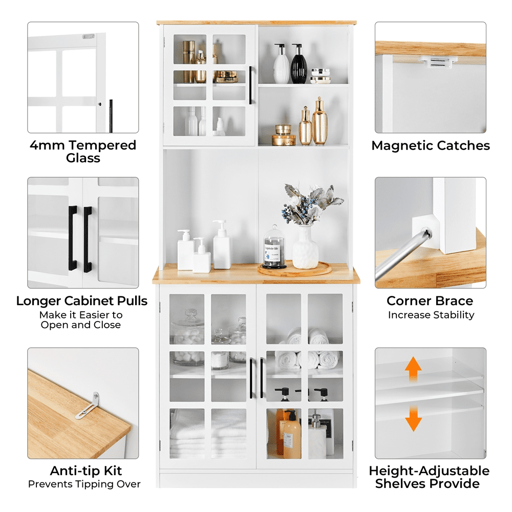 Sleek Kitchen Organizer: A clean white appearance creates a kitchen pantry that brings your kitchen a high-end feeling and timeless look. Mullioned glass cabinet doors become its visual focal point and light up the design Tempered Glass Cabinet Doors: The transparent tempered glass doors add more stylishness to this kitchen storage unit and make it clear for you to identify the items in the cabinets Versatile: This freestanding storage rack can be used in any of your designated places. It is equipped with cable management holes, suitable as a microwave cabinet in the kitchen, or a side cabinet to add storage space to your cleaning room Hassle-free Cleaning: Just low maintenance is required. With a water-resistant painting surface, this storage cabinet is oxidation-resistant and easy to clean. Varnished MDF countertop can be cleaned without too much trouble or risk of damage Anti-tip Kit: We also prepare an anti-tip kit for enhanced safety and stability. You can attach the storage shelf to the wall with the included anti-tip kit for safety Specifications: Color: White; Materials: MDF, Tempered Glass; Assembled Dimensions: 31.5″ L × 15″ W × 72″ H; Middle Countertop: 31.5″ L × 14″ D; Maximum Weight Capacity: total: 176 lb; countertop: 66 lb; upper shelves (ea.): 11 lb; lower shelves (ea.): 33 lb