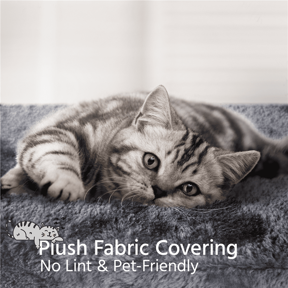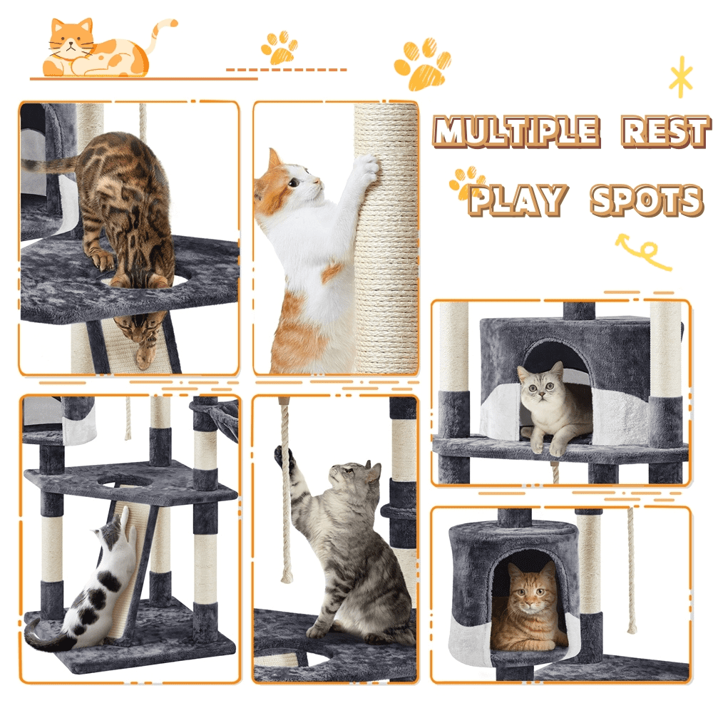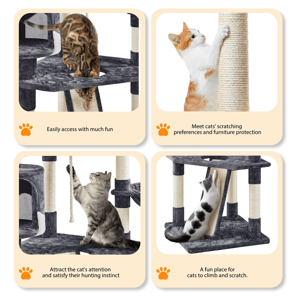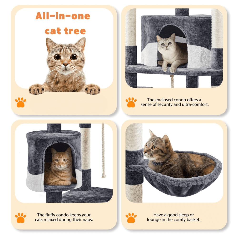 This 79″ cat tree allows 2 to 3 adult cats to play at the same time. Its multilevel design expands the usable activity space vertically and offers more room for pets to climb and explore. There are 9 scratching posts at different heights to encourage positive scratching behavior. Three perches at the top provide adequate lounging space for multiple cats. Two fluffy condos and a plush basket in different sizes offer multiple soft and comfortable relaxing options. The cat tree tower is made of durable and eco-friendly materials. Our cat tree with basket features a big baseboard to avoid wobbling or tipping over. A safety strap is provided to attach the cat tree to the wall for extra stability.