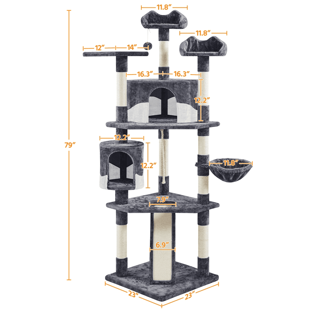 Alden Design 79″H Multilevel Large Cat Tree Condo Tower with Scratching Post, Gray Placement Suggestion Simple design & Easy-to-match Effortless Assembly Scratching Board Warm Notes Color: Dark Gray/White Materials: Particleboard, Plush, Sisal, Foam, and Plastic Overall Dimensions: 23″ L × 23″ W × 79″ H Baseboard: 23″ L × 23″ W × 1″ Thickness Perch with Cat-ear-shape Edge: 12 ″ Dia.× 5.5″ Edge Height Rectangle Platform: 12″ W ×14″ L Polygonal Condo: 16.3″ L × 16.3″ W × 12.2″ H; Entrance: 8″ W × 9.4″ H Round Condo: 12.2″ Dia. × 12.2″ H; Entrance: 8″ W × 10.2″ H Basket Diameter: 12″ Ramp: 23″ L × 7″ W Round Hole Diameter: 8″ Maximum Weight Capacity Condo: 22lb Basket / Perch: 11 lb Shipping Weight: 45.4 lb Item Weight: 42.5 lb Note: 1. Please allow a 1/2″ measurement tolerance. 2. Keep the cat tree dry and away from fire. 3. Please ensure the product’s size and maximum load capacity fit your pet before purchasing.