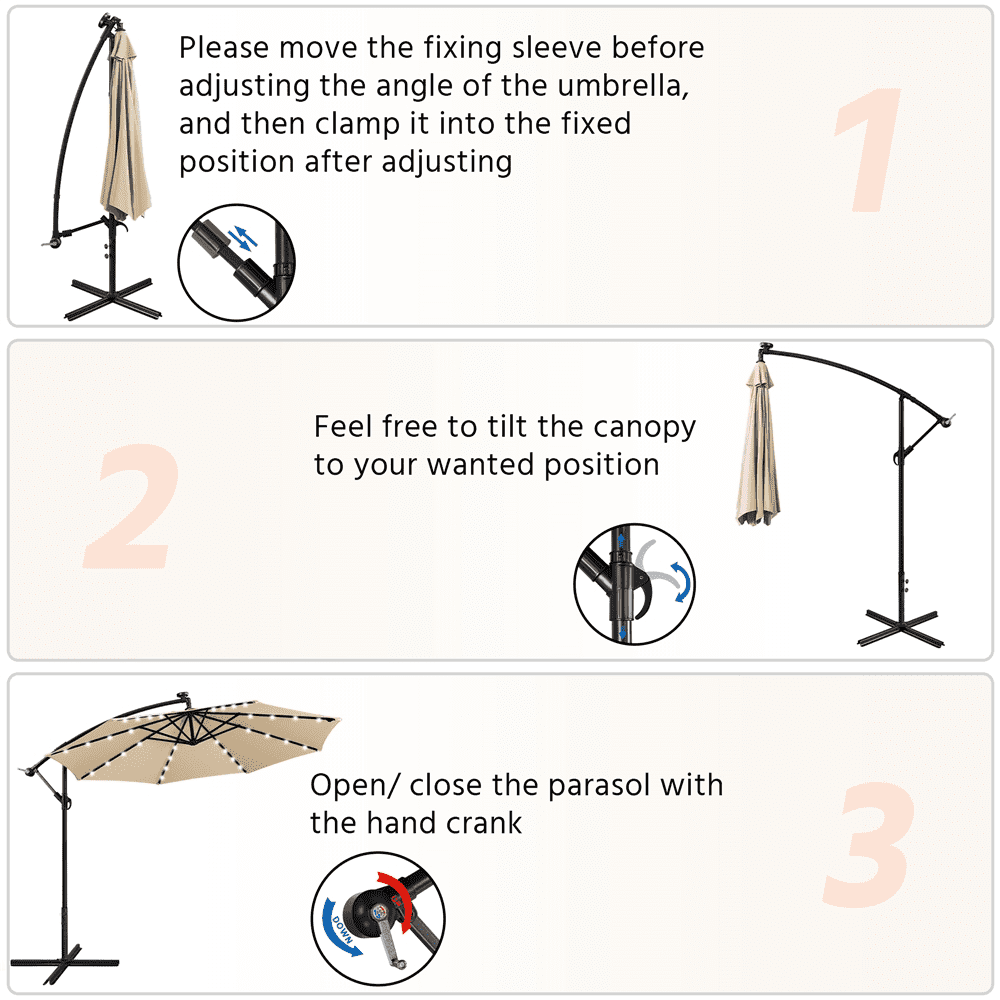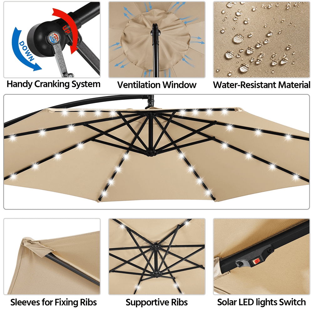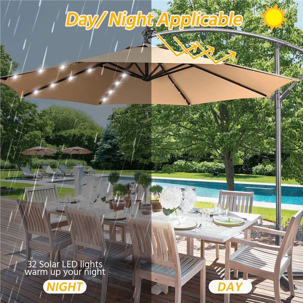 Strong sunlight exposure and rainy season always make us put off all the patio gathering, well, not this time with our patio hanging cantilever umbrella! Our outdoor offset umbrella is constructed of sturdy metal that hard but lightweight, durable enough to have a long lifespan. Polyester canopy serves high intensity, it does not break or change shape. 8 open spot on the top of the canopy for better airflow. Rust-resistant coating provides all-weather protection. Large sized canopy gives wider shading space. Cranking system is easy to use and require less assembling steps. Stable crossed base make sure this patio offset cantilever umbrella is stable and anti-collapse, it is also compatible with our patio umbrella base to be a complete set. Feel free to browse them out. Best of all, this market umbrella features 32 solar-powered lights that can add a lot of romance and sparkle to your evening without much effort. A great addition to the patio, garden, deck, poolside, café and restaurant. Easy setup is required for this outdoor umbrella.