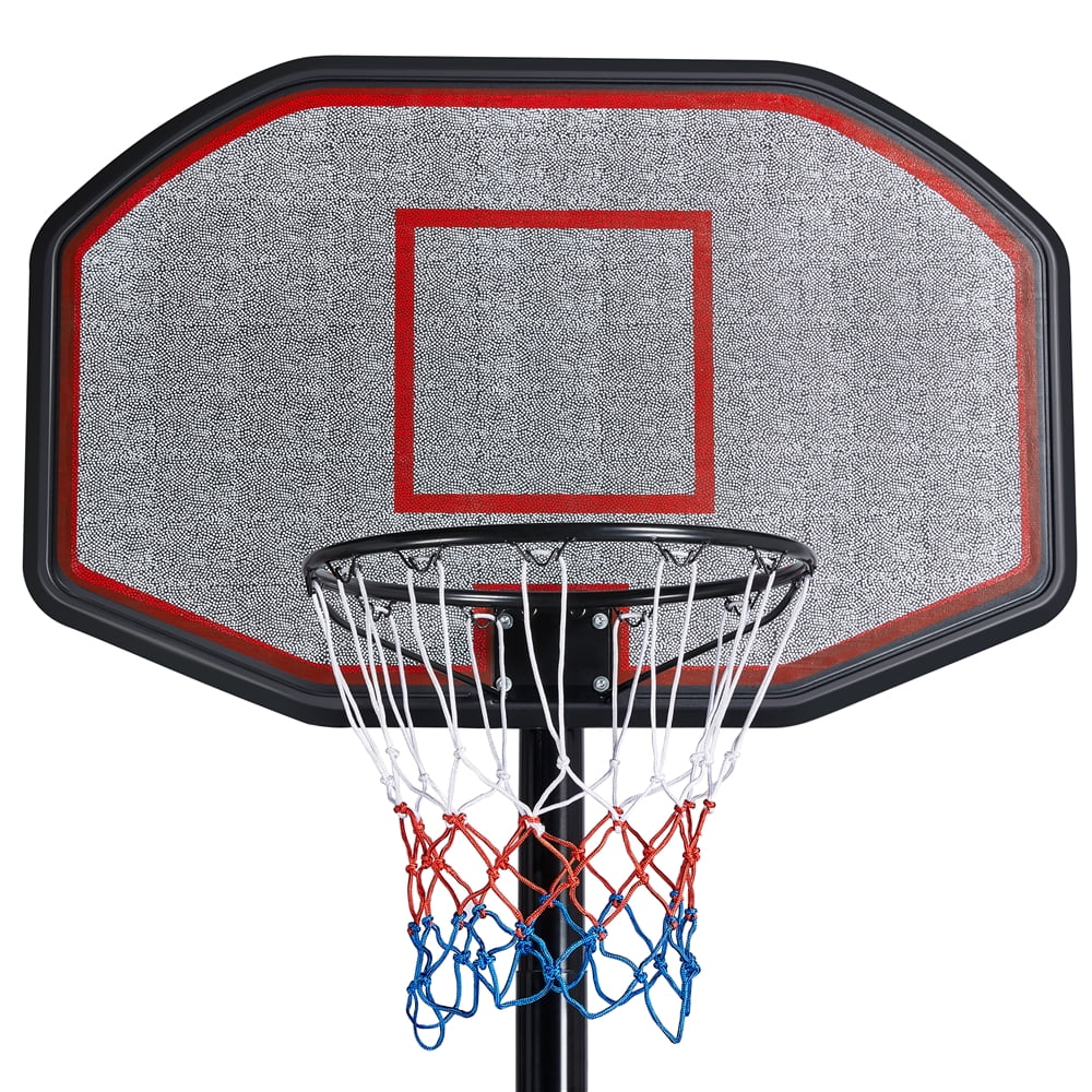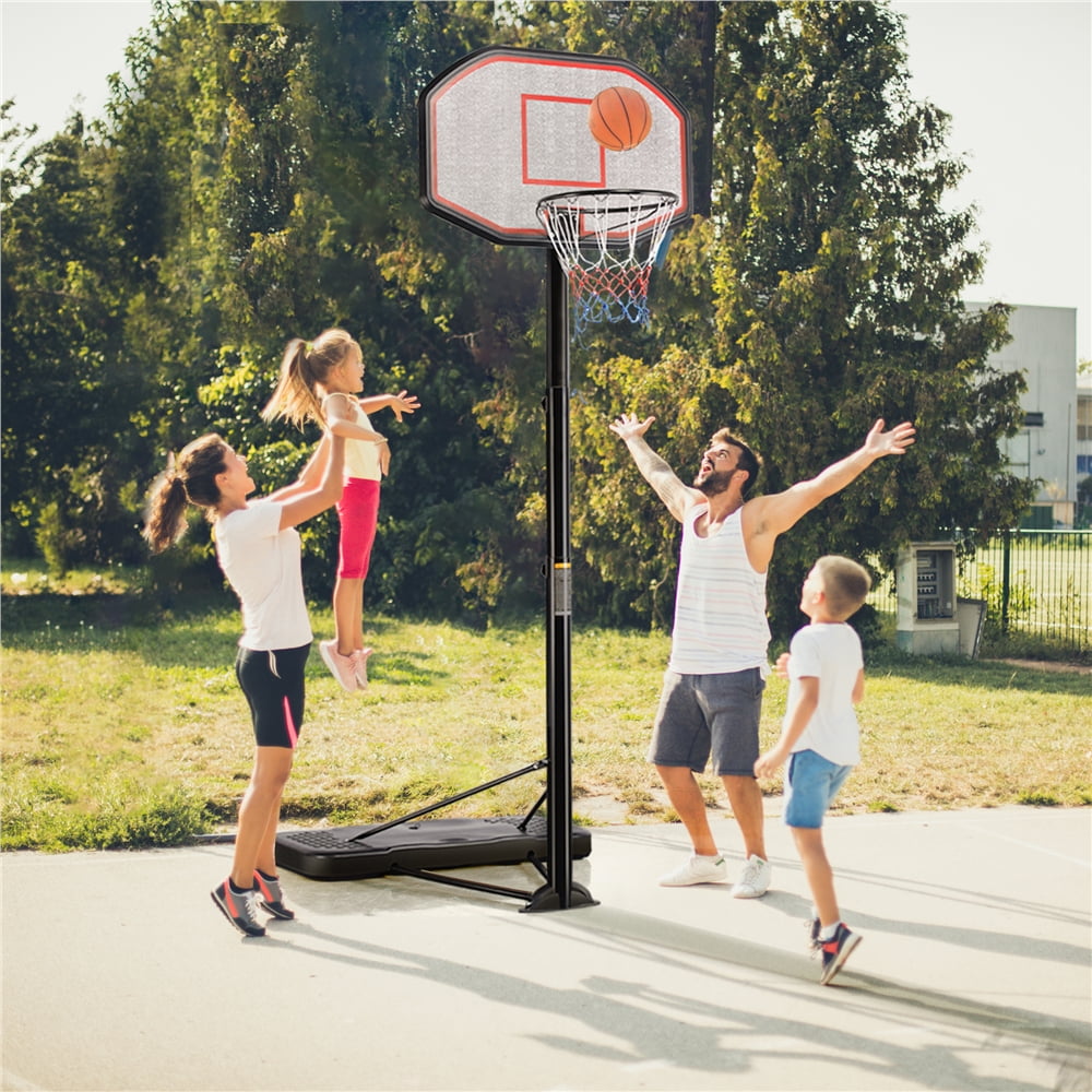 Add more fun and energy to your own driveway or backyard with this Height-Adjustable Portable Basketball System. The 43” x 28’’ high-density polyethylene backboard is supported by heavy-duty powder-coated and weather-resistant steel poles. The rim height can be easily adjusted from 7 ft/218.5 cm to 10 ft/306.5 cm in 6’’/15 cm increments, which is ideal for both younger players and adults to play with. It has a big weighted base that can be filled with water or sand for added stability and safety, and the two wheels ensure east mobility of the stand. Brand: Alden Design