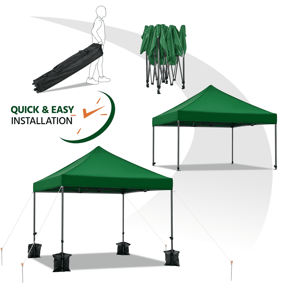 Alden Design 10x10ft Commercial Pop-up Canopy Tent with Wheeled Carry Bag, Dark Green Canopy Color: Dark Green Material: 500D Polyester, Steel Assembled Dimensions: 10′ L × 10′ W × 10.6-11.2′ H Eave Height: 6.5-7′ Storage Bag: 10.2″ L × 10.2″ W × 64″ H Banner Section: 10′ W × 1′ H Item Weight: 50 lb Shipping Weight: 55.2 lb Set Includes: 1 Canopy 1 Roller Bag 4 Sandbags 4 Anchor Ropes 4 Ground Stakes Note: 1. Please allow ±1.2″ measurement tolerance. 2. Please do not use this canopy tent in a strong breeze, continuous light/heavy rain, or extreme weather conditions. 3. Please anchor the canopy tent to the ground and secure it with sandbags and anchor ropes when in use.