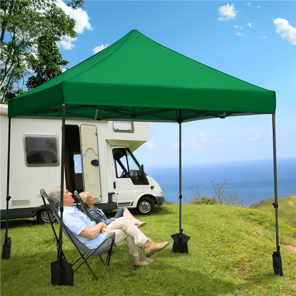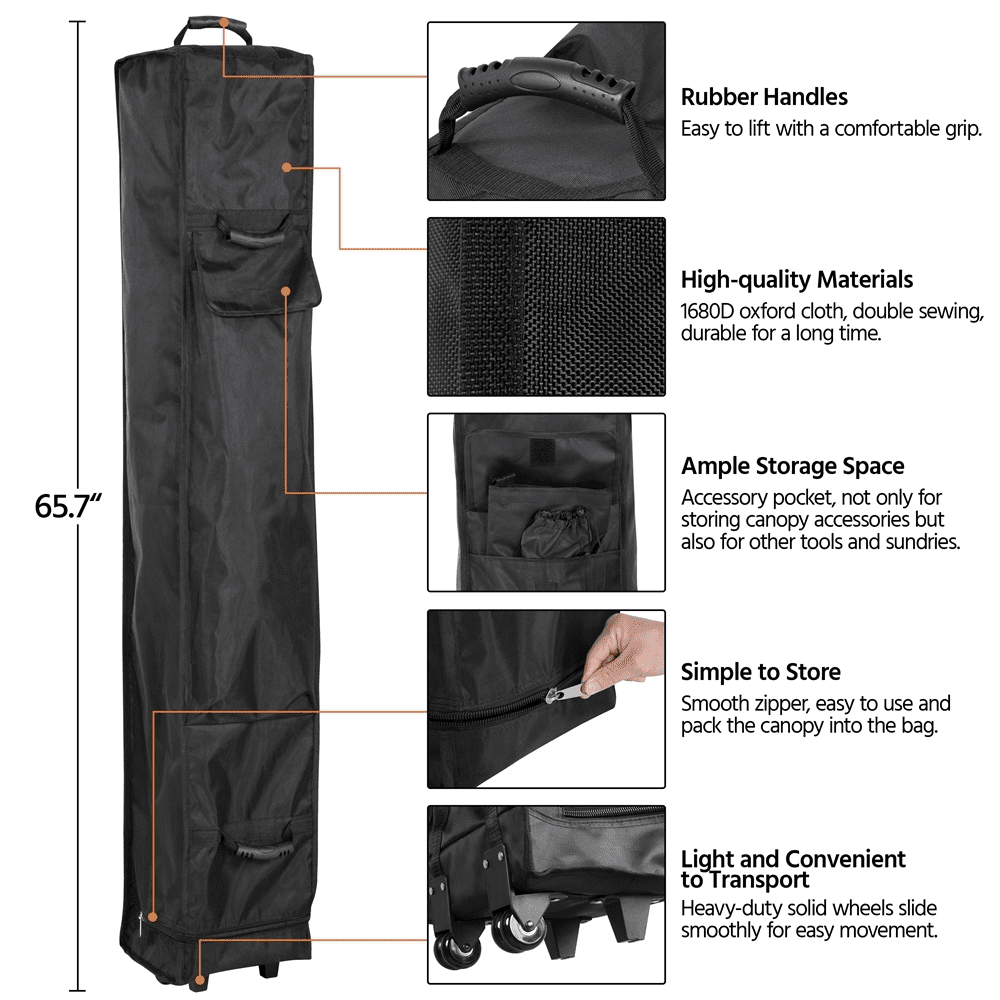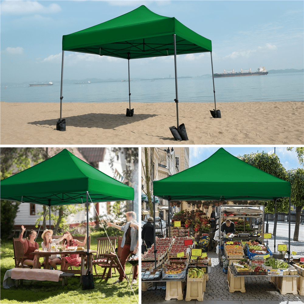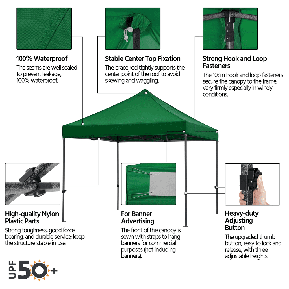 No matter it is rainy or sunny, you can always have fun with your friends under this waterproof heavy-duty commercial pop-up canopy! Let this pop-up canopy help you hold a perfect party or BBQ in the backyard, protecting from rain or ultraviolet. This commercial heavy-duty canopy is height adjustable for different needs. There are three holes for height adjustment on each tubular column of the pop-up canopy. The adjustable range is from 227cm/89.4inch to 245cm/96.5inch. You can freely change the height of the canopy according to your needs.The thoughtful details of the pop-up gazebo make it very convenient to set up and disassemble. Also, a wheeled carry bag is provided for easy storage and portability. The folding pop up tent is perfect for outdoor sports, festival events, flea markets, parties, etc. We are dedicated to providing you with sincere service. If you have any problems or questions in the use process, please feel free to contact us for further assistance.This commercial canopy is suitable for outdoor activities, camping, wedding, picnic, BBQ, and other commercial uses. The foldable design makes the tent easy to use and pack.