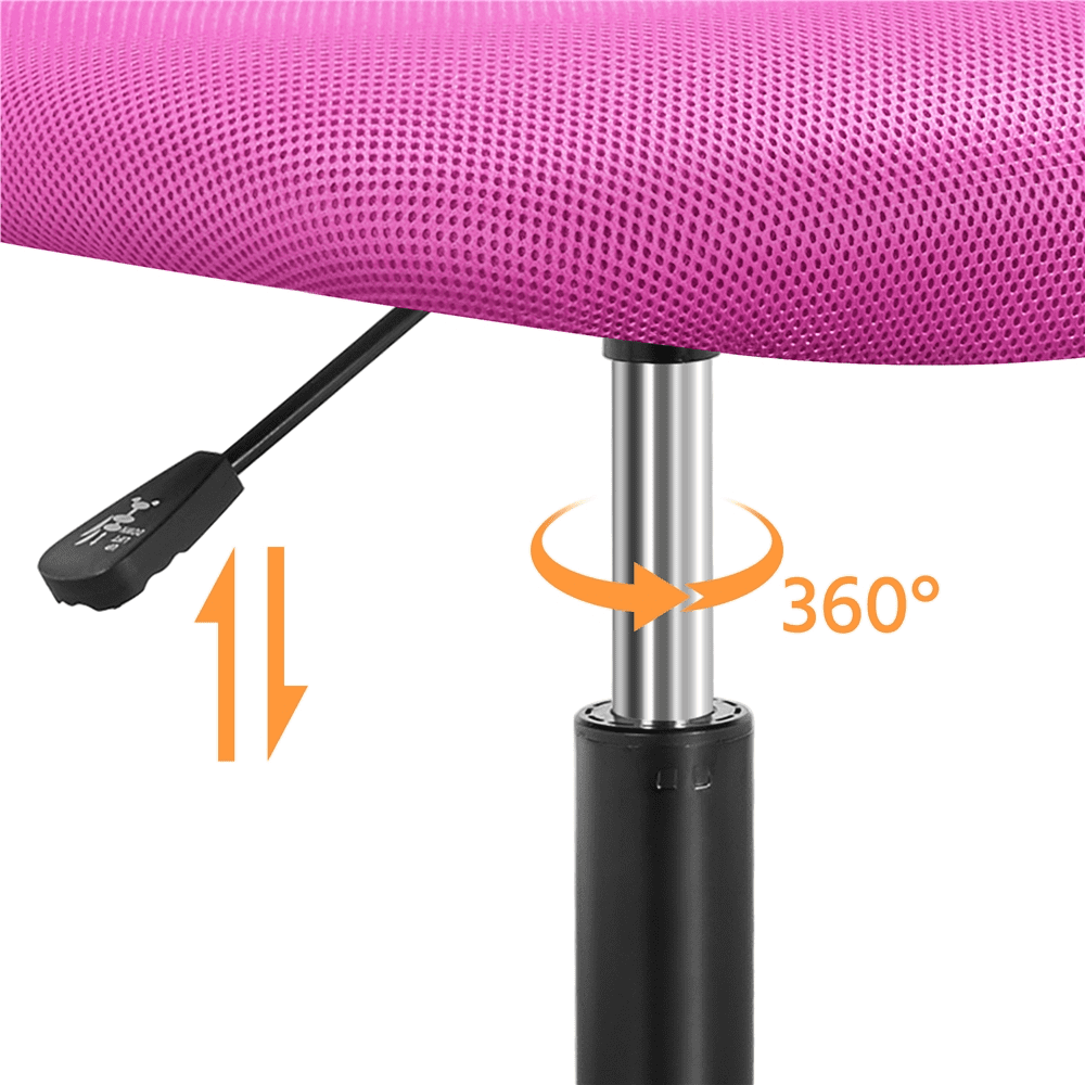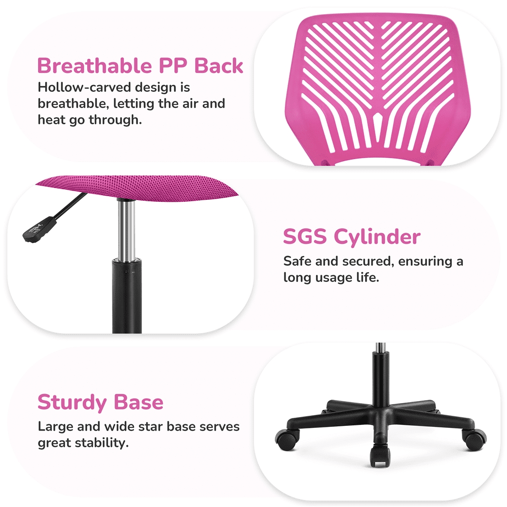 Optimized Comfort: Featuring a generously padded seat with high-density foam and a dual-layer mesh covering, this desk chair elevates seating comfort. The soft upholstery, resilient mesh cover, and high-density filler prevent deformation, while the spacious seat measures 18.3″ W, 18″ D, and 3″ thick ensuring optimal comfort Sturdy and Durable: This office chair features a blend of a plastic backrest, foam-padded seat, steel gas spring and nylon base with wheels. The premium plastic construction ensures durability and water resistance, ideal for environments with high humidity. Despite its relatively compact size, it has an impressive weight capacity of 300 lb Easy to Assembly: The package includes all necessary components, hardware, and user-friendly instructions for a straightforward 5-step assembly process that can be completed in just 15 minutes Adjustable Seat Height: The ergonomic office chair allows height adjustment between 16.3-21.7″, catering to individual preferences for an ideal sitting posture. Users can easily modify the seat height by pulling the lever located beneath the seat without needing to stand up Easy Mobility and Armless Design: Designed for high flexibility, this armless task chair allows easy entry and exit while tucking neatly under desks to save space. Its smooth-rolling wheels ensure quiet, fluid mobility for effortless transitions between tasks Specifications: Materials: PP, Polyester Fibre, Nylon, Foam, Composite Board; Color: Rose Red; Assembled Dimensions: 22″ W × 22″ D × 30.5-36″ H; Adjustable Seat Height: 16.3-21.7″; Maximum Weight Capacity: 300 lb
