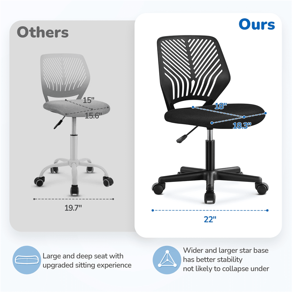 Alden Design Adjustable Armless Mid Back Office Chair, Set of 2: Materials: PP, Polyester Fibre, Nylon, Foam Color Options: Turquoise, Rose Red, Purple, Dark Gray and White, Black Overall Dimension: 50 × 55 × 79-92cm/20 × 22 × 31-36.5’’(L × W × H) Adjustable Seat Height: 43-56cm/17-22’’ Weight Capacity: 136kg/300lb G.W.: 7.1kg / 15.7lb; N.W.: 5.9kg / 13lb Quantity: 2pcs Note: Please do not stand on the chair. Please allow ±1.5cm/0.6’’errors due to manual measurement. Easy to assemble: all necessary parts and hardware included Assembly Required Residential Use