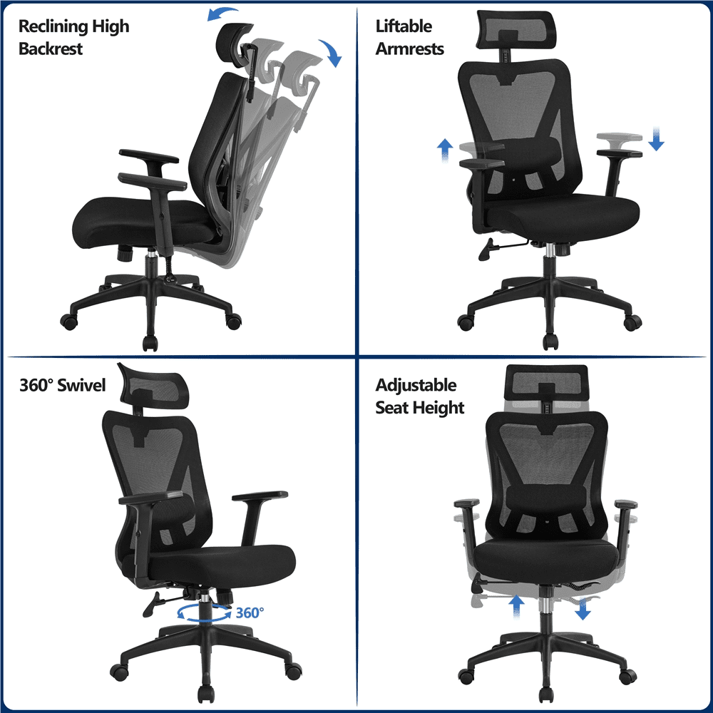 If you spend a lot of time at your desk, you’ll need such a comfortable and functional office chair. High mesh back supports your entire back, neck and head, at the same time, bringing a cool sitting experience. A large, cushioned seat relieves fatigue from prolonged sitting. Best of all, our desk chair is highly adaptable to meet your preferences. The seat height, lumbar support, headrest, armrests, and back tilt angle can all be adjusted for ultimate comfort. The star base with five nylon castors allows 360° smooth and mute mobility. Make your day productive but relaxing from now on. Age Group: Adult