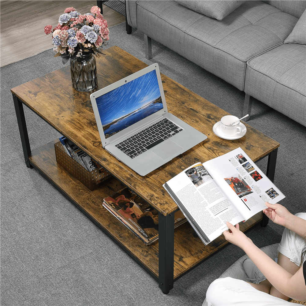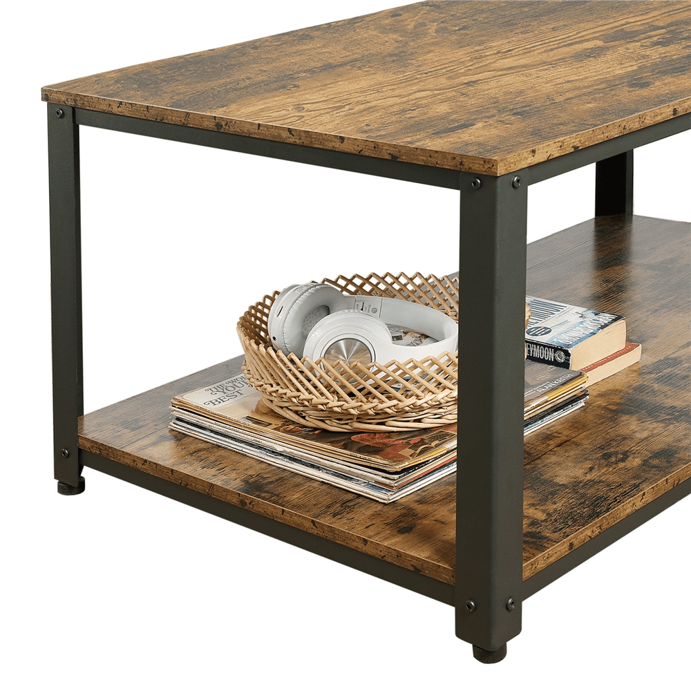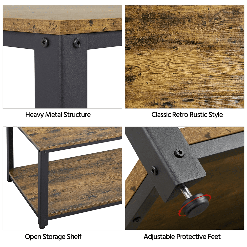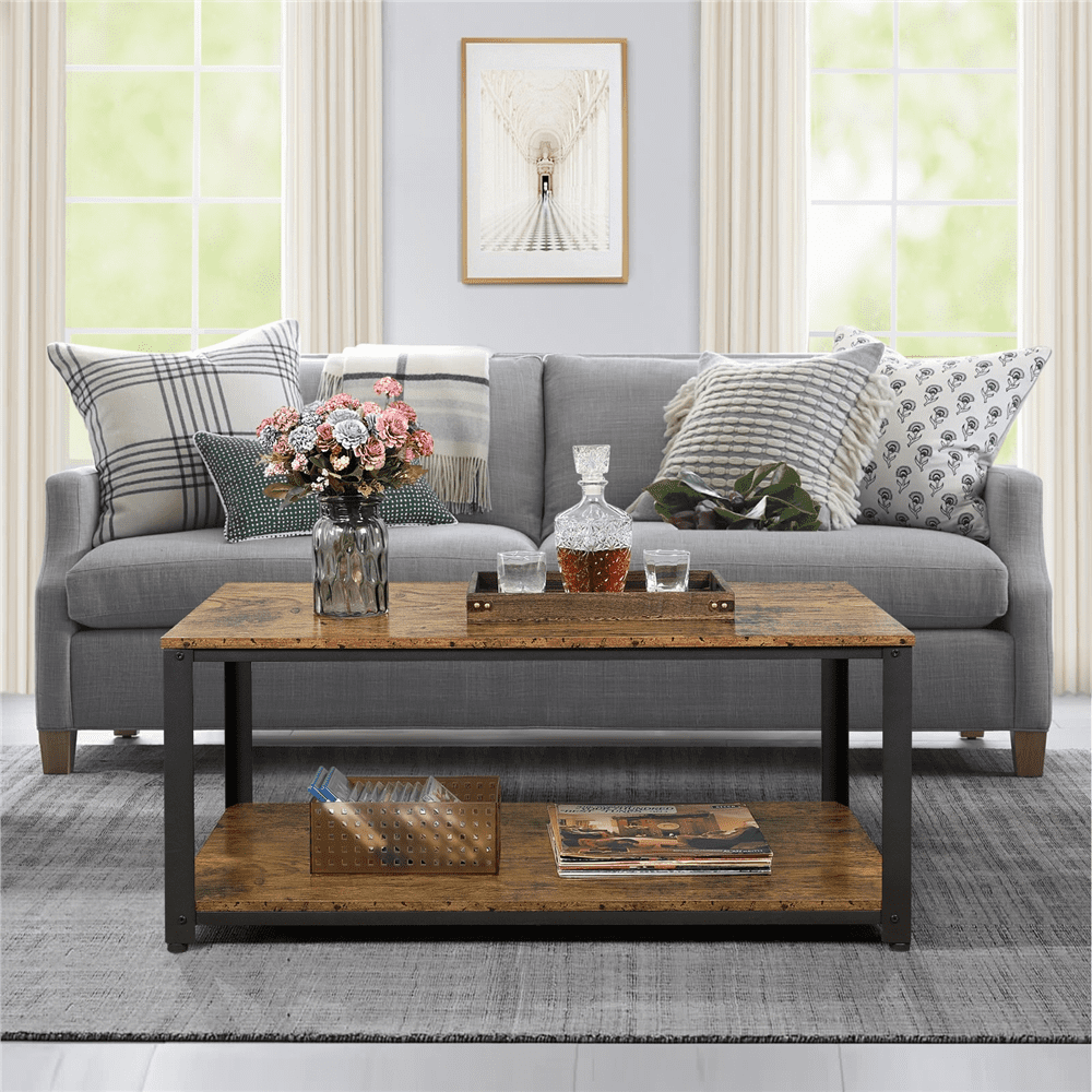 Alden Design Coffee Table with Storage Shelf for Living Room, Rustic Brown: Spacious: Coffee table features a storage shelf that expands space, used for storing and organizing your books, remote controls, and so on, making your stuff neat and tidy Multifunctional: The vintage coffee table can be used as an end table in front of your sofa, a tea table, or even as a space-saving desk Easy To Assemble: The storage coffee table comes flat packed with detailed instructions for quick and easy assembly Specifications: Material: MDF & Iron Overall Dimensions: 39.5’’ L x 20’’ W x 17.5 ’’ H Desktop Load Capacity: 198 lb Shelf Load Capacity: 154lb Shipping Weight: 36 lb Item Weight: 32.3 lb