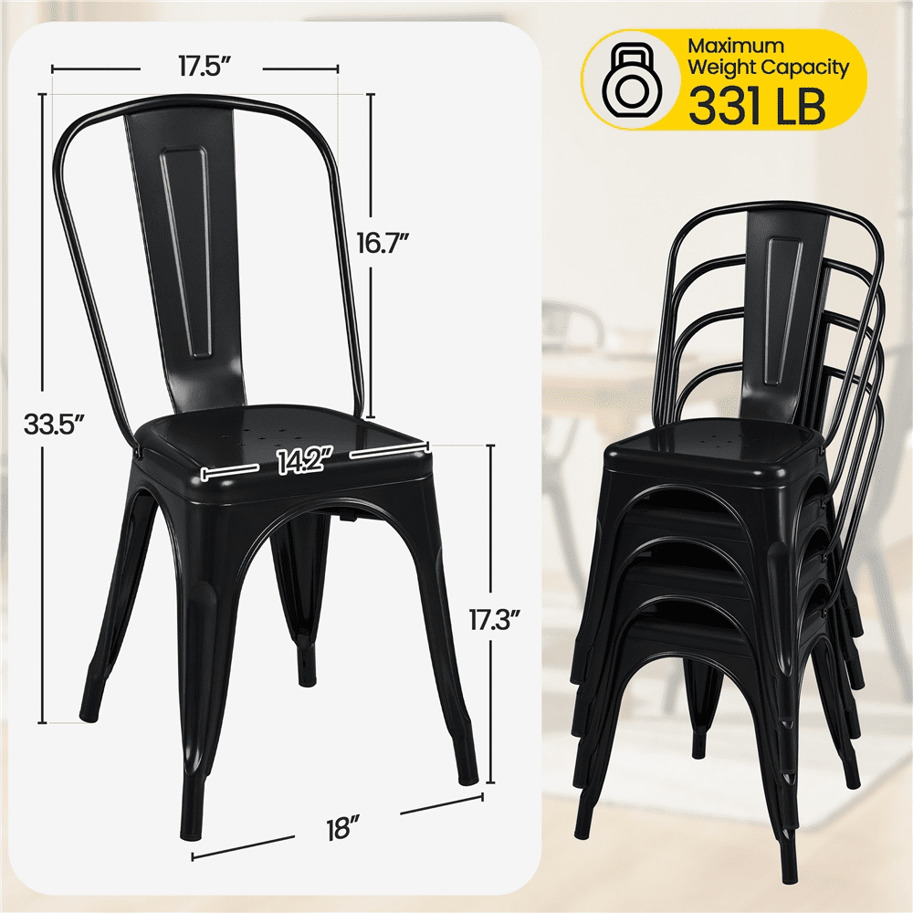 Solid & durable: The chairs are made of iron material with paint coating. The max. load bearing is 330.7lb. It is solid enough for your daily needs. 4 pieces are in one set. They flawlessly match your home style Scratch-proof footpads: Each leg of the chair has a protective footpad at the bottom. No-mar rubber footpads keep chairs from sliding and scratching hardwood floors, scratch-resistant with excellent polish Pretty humanized design: There are several holes on the surface of each chair which can reduce pressure and improve ventilation. With a comfortable backrest, our chairs will make you relaxed when you enjoy your meal with families Illustrated instructions included: The instructions and matching accessories are included, very convenient to assemble and disassemble Good weight capacity: The maximum load-bearing of this pack of 4 stools is 331lb. For safety, please do not overload the chair or step on the chair Specifications: Quantity: 4PCS (one set); Color: Black; Material: Iron;Overall size: 20.7 x 17.5 x 33.7inch (L x W x H); Seat size: 14 x 14.5 x 18inch (L x W x H); Max. load capacity: static, 331lb; dynamic, 225lb