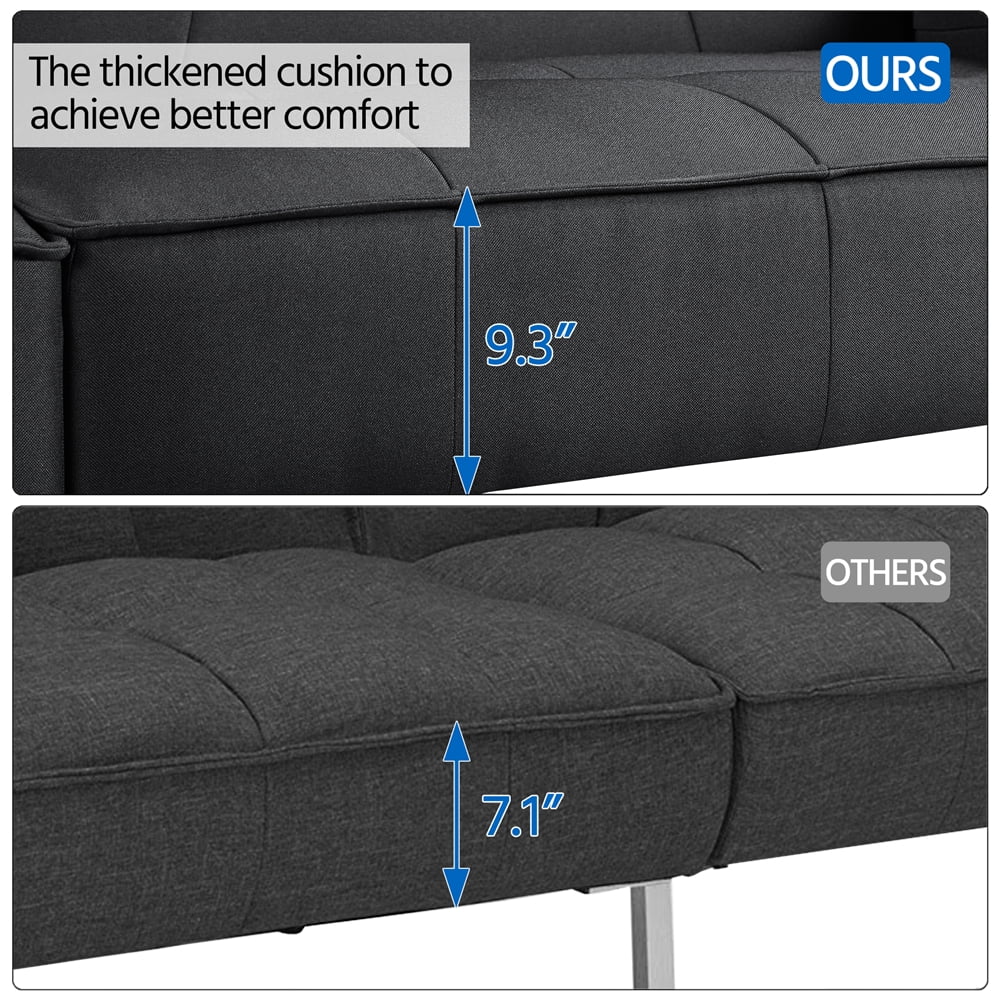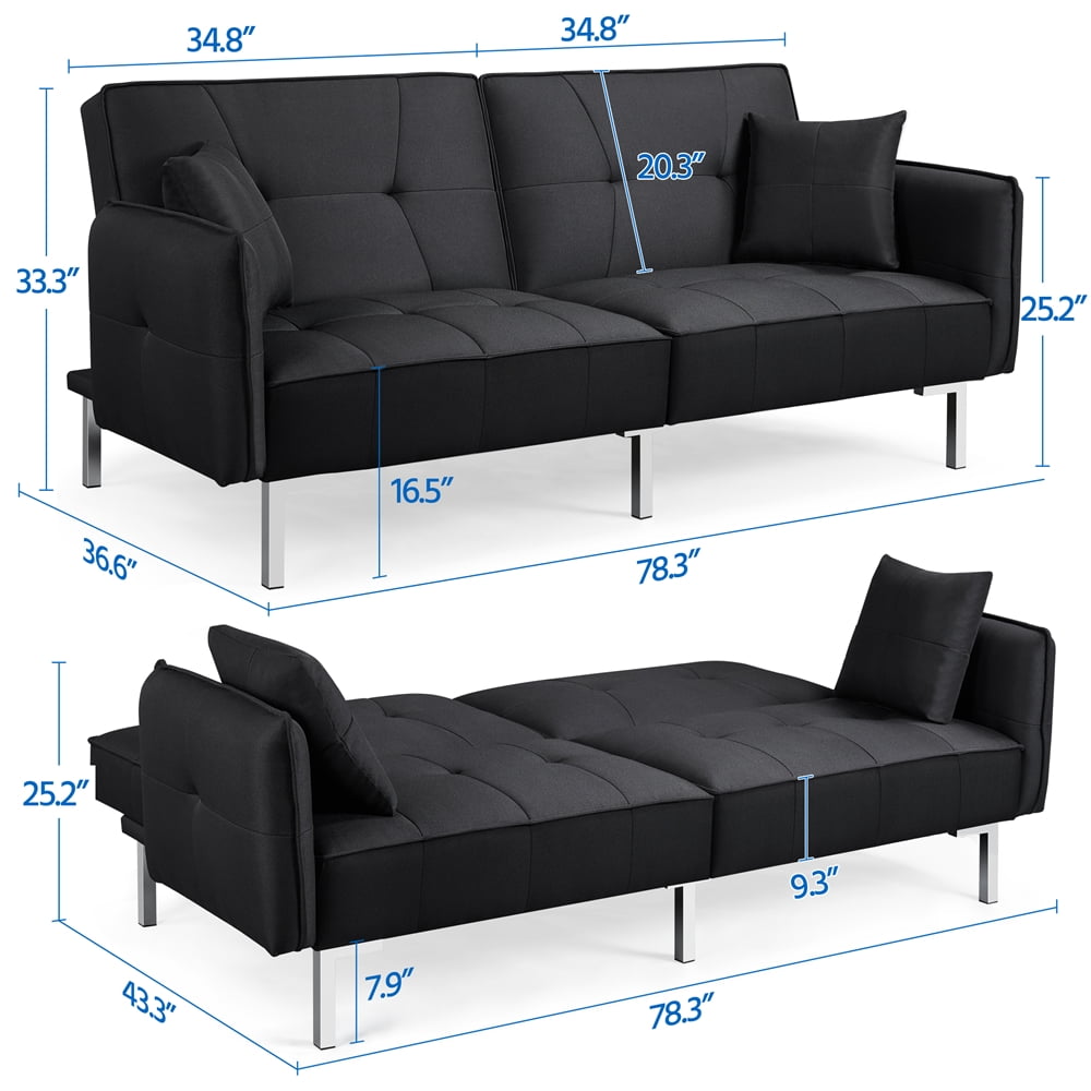 Alden Design Upholstered fabric cover futon sofa bed with adjustable backrest: N. W.: 43.3kg/95.5lb G. W.: 48.8kg/107.6lb Seat height: 42cm/16.5” Armrest height: 64cm/25.2” Weight capacity (max.): 350kg/771.6lb Certification: TB 117-2013 Flammability Standard Ideal for small spaces: taking up 23.7 square feet Materials: linen, sponge, batting, metal, plastic, plywood This versitile “all-in-one” sofa utilizes steel sinuous springs with anti-sag properties in the framing and backrest 105° sofa dimensions (LxWxH): 199x93x84.5cm / 78.3″ x 36.6″ x 33.3” 140° sofa dimensions (LxWxH): 199x103x69.5cm / 78.3″ x 40.6″ x 27.4” 180° sofa dimensions (LxWxH): 199x110x64cm / 78.3″ x 43.3″ x 25.2” Sturdy plywood and metail construction: built of a robust frame with a quality furniture-grade budget-friendly plywood. Six 1″ diameter strong metal legs to support the frame. With 4 L-shaped legs on both sides and 2 T-shaped legs in the center, the whole piece is capable of supporting a weight capacity of 771.6 lbs. Worry-free assembly: we prepared graphics and instructions in each package to assist in assembly. Recommended time to assemble is 30 minutes. We are dedicated to providing you a great experience, so feel free to reach out to us for help. You can find our information in the user guide. Note: Please allow ±1.0cm errors due to manual measurements.