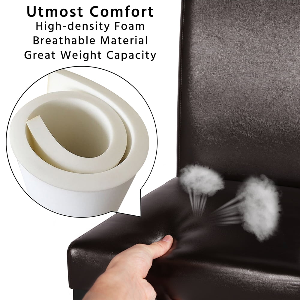 Selected Materials: Our faux leather dining chairs are made from faux leather, solid wood, composite board, foam, and rubberwood. The foam padded seat and high-backed backrest provide you with much comfort and ease Comfortable Seating Experience: Featuring soft and smooth faux leather upholstery, high-density foam padding, and a supportive high backrest, this armless dining chair is designed to offer enhanced comfort Easy Maintenance: These modern kitchen chairs have wear-proof faux leather seats, which not only simplify the cleaning but also increase the texture. It is easy to clean them up and looks high-end with a faux leather surface Stylish Design: Simple fashionable kitchen chairs add a sense of elegance to your room, and the modern design is compatible seamlessly with any décor of occasion Easy Assembly: Simply attach the seat to the integrated backrest, secure the front legs, and install the adjustable foot pads. The straightforward setup ensures your dining chairs are ready for use with minimal effort