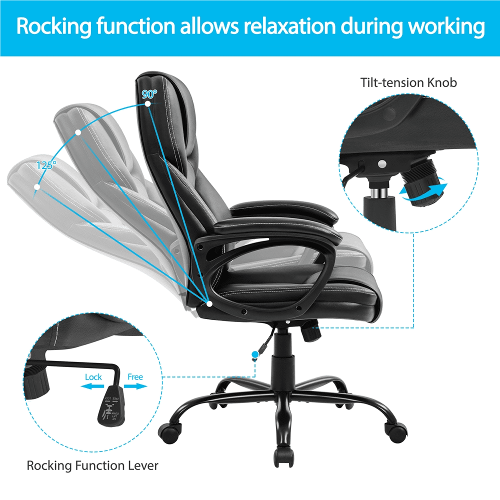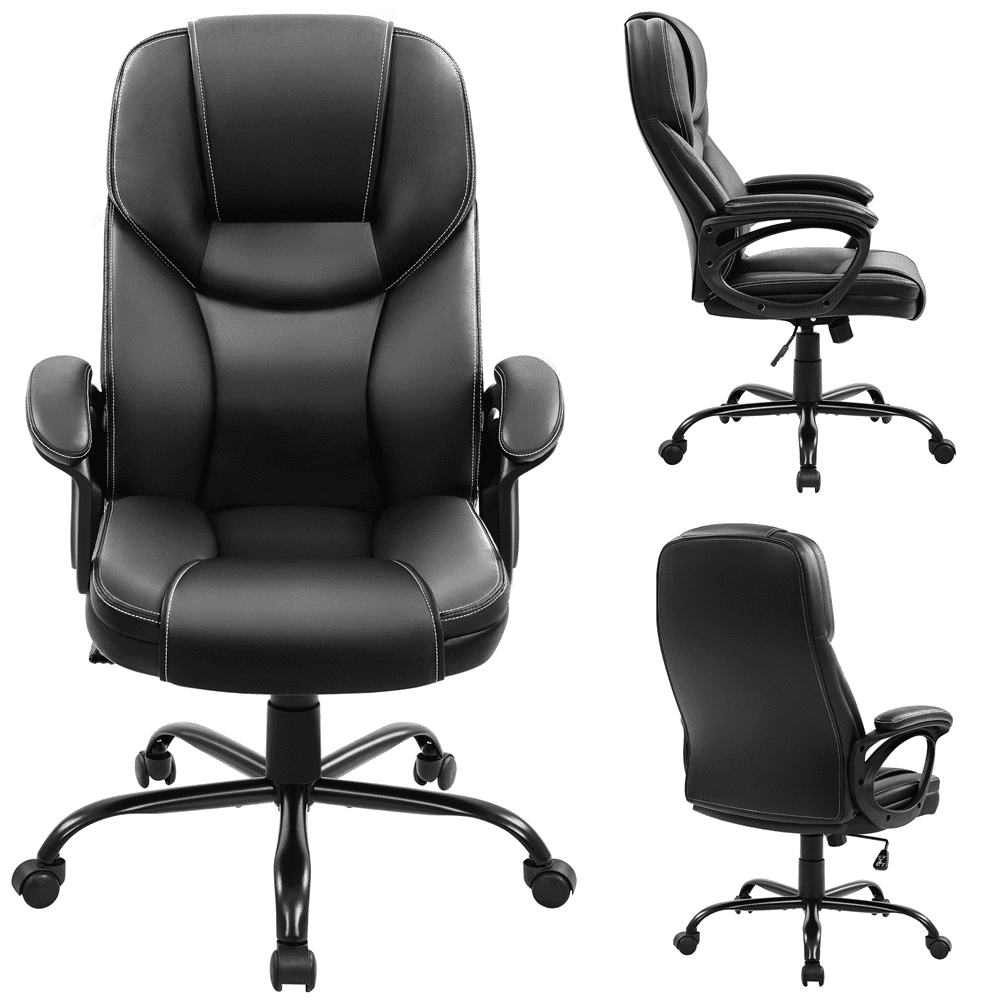 Alden Design Faux Leather Swivel Office Chair with Ergonomic High Back for Home Office, Black Overall Dimensions: 27.5″ L × 28″ W× 42-46″ H Seat Height: 19-23″ Armrest to the Ground: 26.2-30″ Maximum Weight Capacity: 300 lb N.W.: 31.4 lb G.W.: 36.7 lb Note: Please allow a 0.6″ measurement tolerance. Roomy Cushioned Seat Ergonomic High Back Adjustable Height 360-Degree Swivel Materials: PU Leather, Foam, Metal, Nylon, Plywood, PP Color: Black