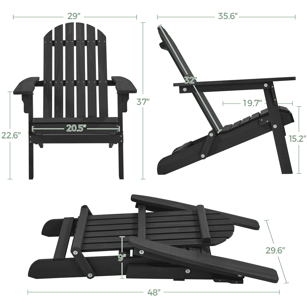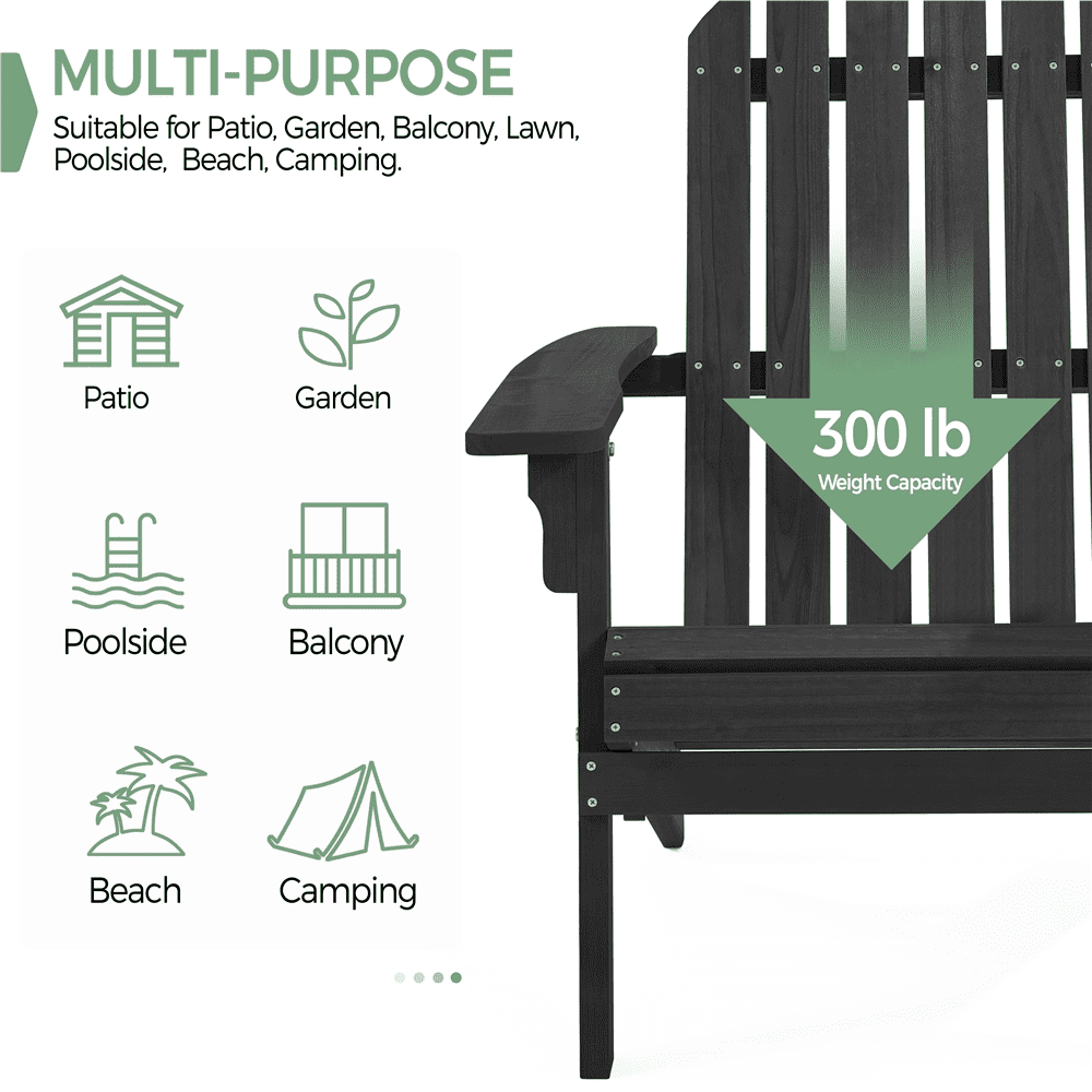 Alden Design Fir, Metal Adirondack Chairs Set of 2, Black Set includes two folding Adirondack chairs, perfect for garden or patio use Color: Black Material: Durable fir wood and metal construction Max weight capacity: 300 lb Assembly weight: 36.6 lb Shipping weight: 40.3 lb Note: Please allow ± 1/2″ measurement tolerance Hollowed-out seat and backrest design for enhanced comfort Natural and simple aesthetic complements outdoor spaces