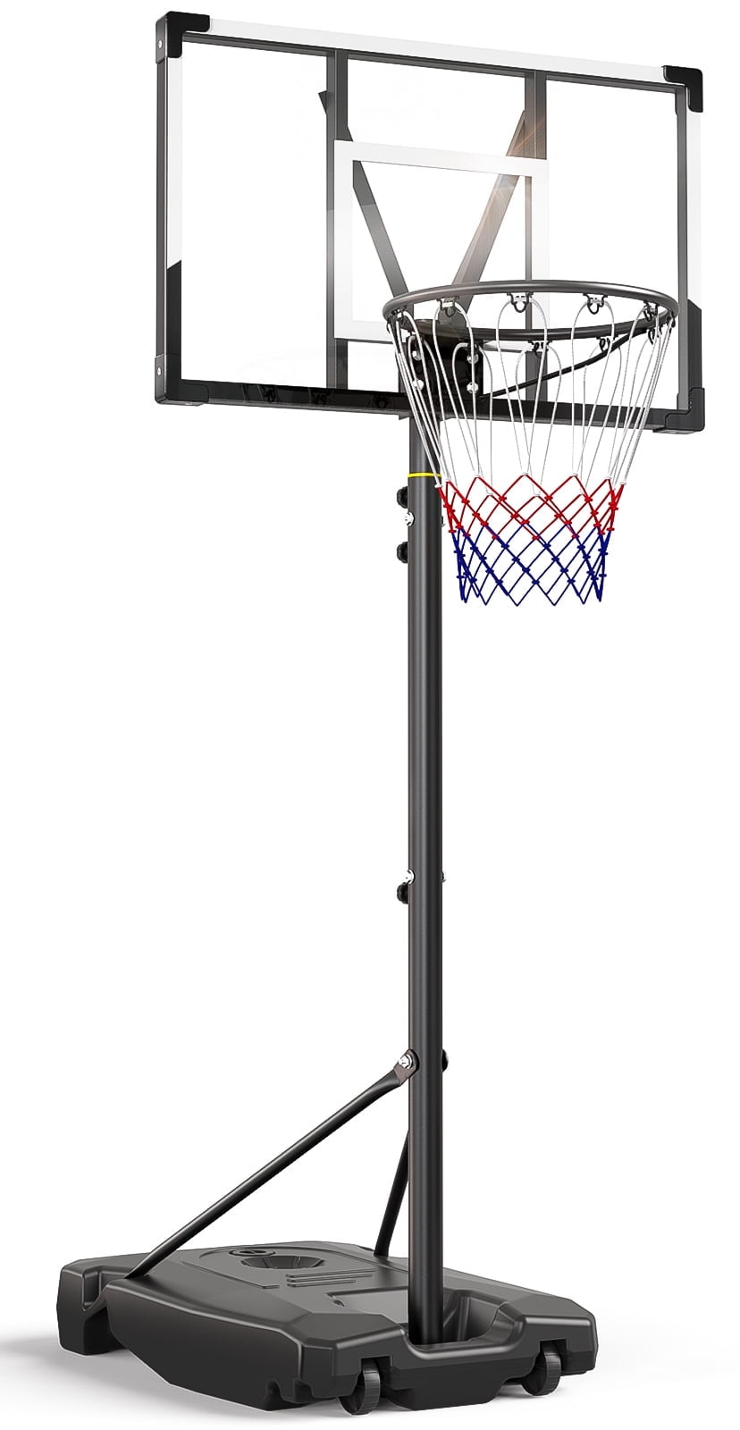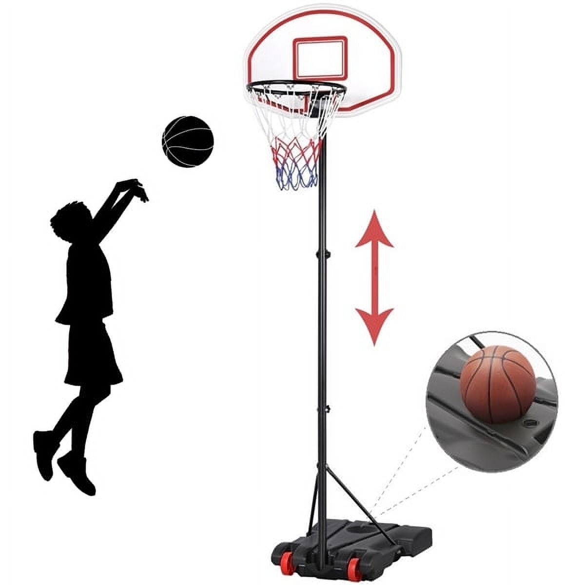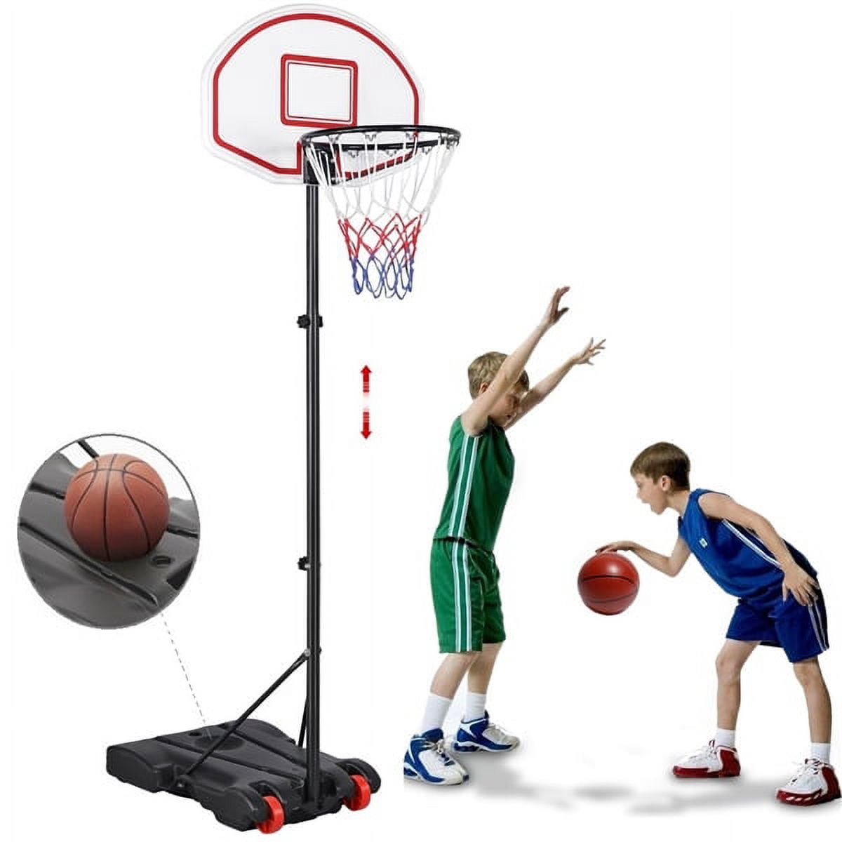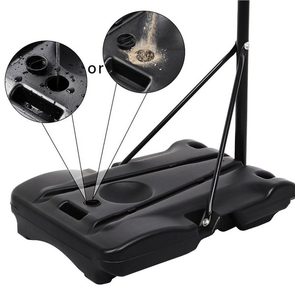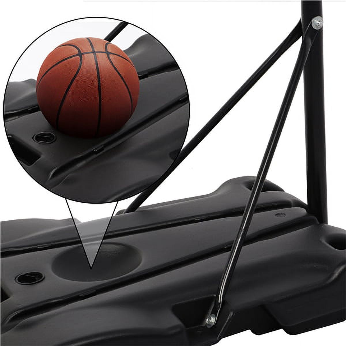 Built-to-last: Constructed of non-toxic antirust painted round iron post measured 3.8cm/1.5inch in diameter, strong PE backboard and base, and durable thickened synthetic fiber nets, this basketball hoop system adapts quality materials to ensure light weight and good durability as well. Water/Sand filled base with wheels: The base measured 73.5x55cm/29×21.7″ can be filled with water or sand to ensure good stability and safety for your every shot. Equipped with two 10cm/4″ big wheels for effortless moving even when the base is weighted by stuffing. Height-adjustable: The telescoping post features 6 adjustable heights, easily adjusted from 159cm/5′ to 214 cm/7’ in 11cm/4.3″ increments. The adjustment system contains 2 hand knobs to fix the post, making adjustment simple and easy for users. Collapsible design: When not in use or for transport, our basketball hoop system can be disassembled into flat pieces, which only takes up very little storage space in your garage or truck. Play with it in everywhere: This height-adjustable basketball hoop can be set at 7’ high for the courtside play or lowered to 5’ for kids and poolside or indoor basketball game. Recommended for 5-13 years old children/teenagers whose height ranging from 3.3ft-4.6ft to use. Worry-free assembly: Simple-structured basketball goal only takes a few minutes to set up before your game time. Tools and detailed user manual are provided for your convenience. Molding storage area: We provide two slots for holding posts and the round recess between the slots for placing your basketball.