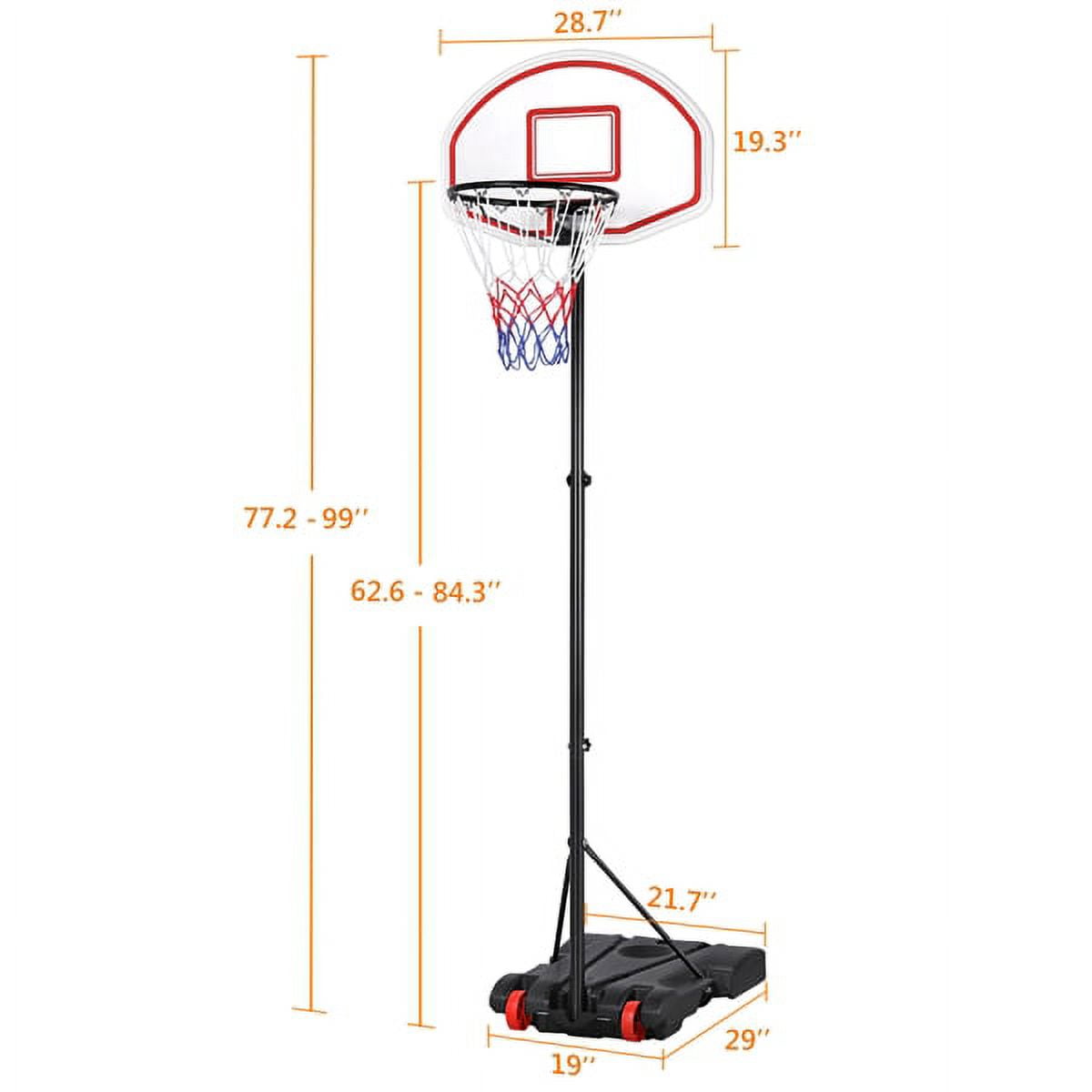*Specifications: Materials: iron, PE plastic, synthetic fiber Overall dimension: 73 x 73.5 x (196-251) cm / 2.4 x 2.4 x (6.4-8.2) ft (LxWxH) Adjustable height between rim and ground: 159-214 cm/ 5-7ft Backboard size: 73 x 49 x 1.6 cm/ 28.7 x 19.3 x 0.6″(LxWxThickness) Basketball rim diameter: 42 cm/ 16.5″ Base size: 73.5 x 55 x 13.5 cm/ 29 x 21.7 x 5.3″(LxWxH) Wheel diameter: 10 x 3 cm / 4 x 1.2″(Dia.xH) Maximum base weight (filled with water): 33kg / 73 lb N.W.: 8.1 kg / 17.7 lb G.W.: 9.5 kg / 20.8 lb Color: Red Please Note: 1. For added safety, ensure to fill the base with water or sand before use. 2. To avoid the basketball stand tipping over and causing personal injury, please do not dunk.