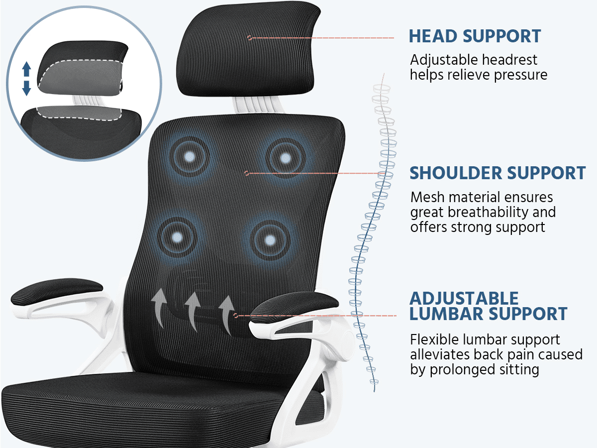 Adjustable Comfort: The height-adjustable headrest of this mesh gaming chair allows you to find the most comfortable position for your neck and head while sitting upright or reclining. The lumbar support can also be adjusted to maintain proper spinal alignment and promote good posture. The adjustable range of the lumbar support is 2″ 90° Flip-up Armrests: Want to scoot as closely as to the desk? Flip the arms up, and you’ll gain all the benefits of an armless desk chair. These benefits include having an unrestricted seating posture, saving floor space by storing the chair under the desk, and being able to use it with desks of various heights Convenient Mobility: This big and tall office chair is equipped with nylon swivel casters to make sure users can move with the chair effortlessly with a 360 degrees rotation. Durable materials of these five casters allow smooth and steady mobility Cushioned Seat & Mesh Backrest: The extra-large cushioned seat, measuring 20.5″ W and 20″ D, is elastic and not easy to deform, offering optimal support for a long period of sitting. Plus, the high mesh backrest wrapped with breathable mesh provides a cooler sitting experience and full back support Ergonomic Mesh Desk Chair: This high back office chair’s ergonomic features, including a large adjustable headrest, retractable padded armrests, a movable lumbar pillow, rocking function and 3.7-inch adjustable range of seat height, offer customized comfort for extended periods of work, study Specifications: Materials: Polyester Mesh, Foam, Plywood, Nylon, Plastic, Iron, PP; Color: White/Black; Assembled Dimensions: 25.5″ W × 25.5″ D × (49-53)″ H; Maximum Weight Capacity: 300 lb