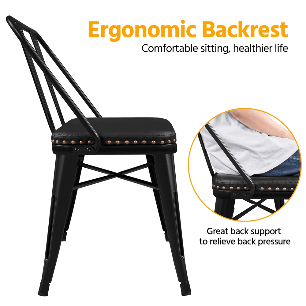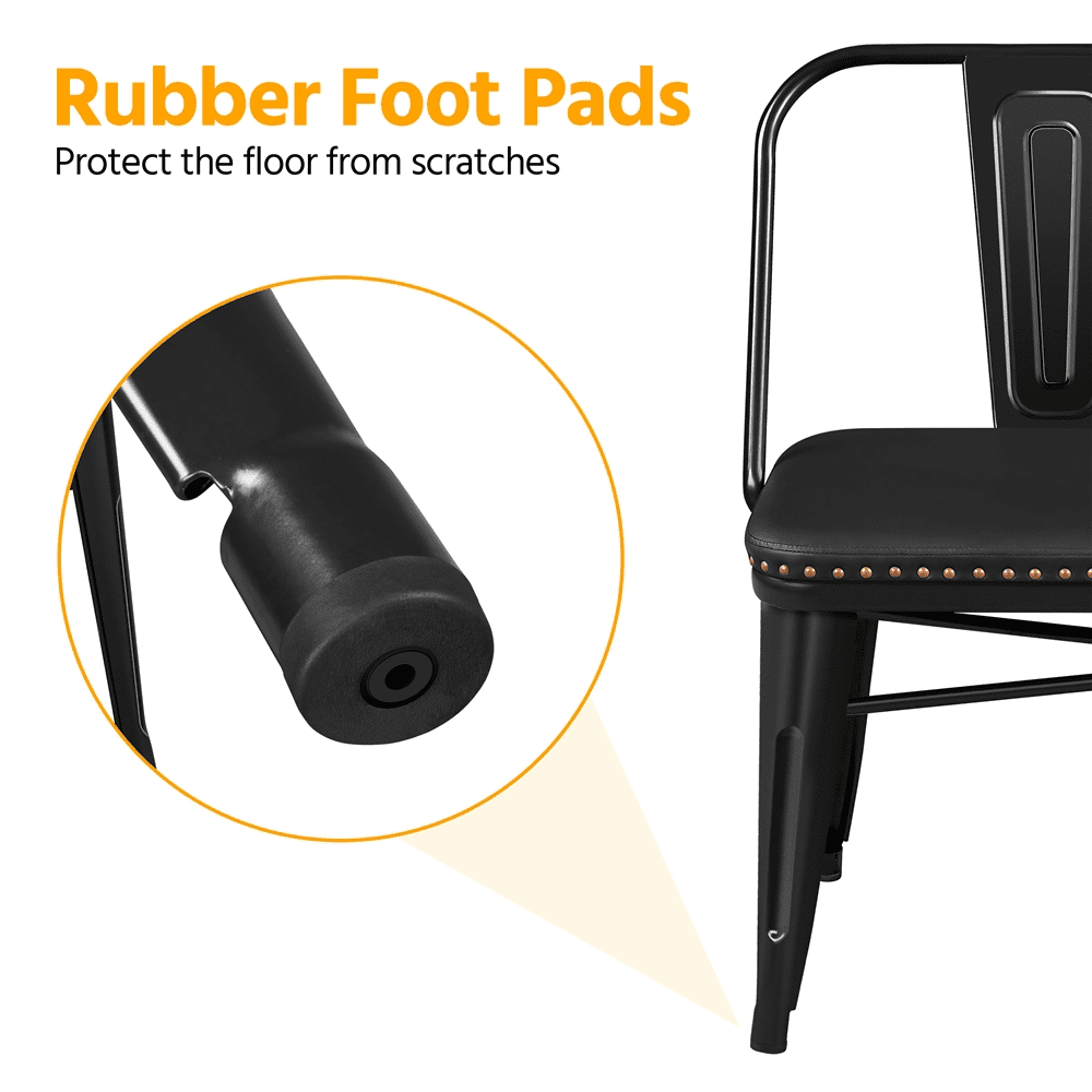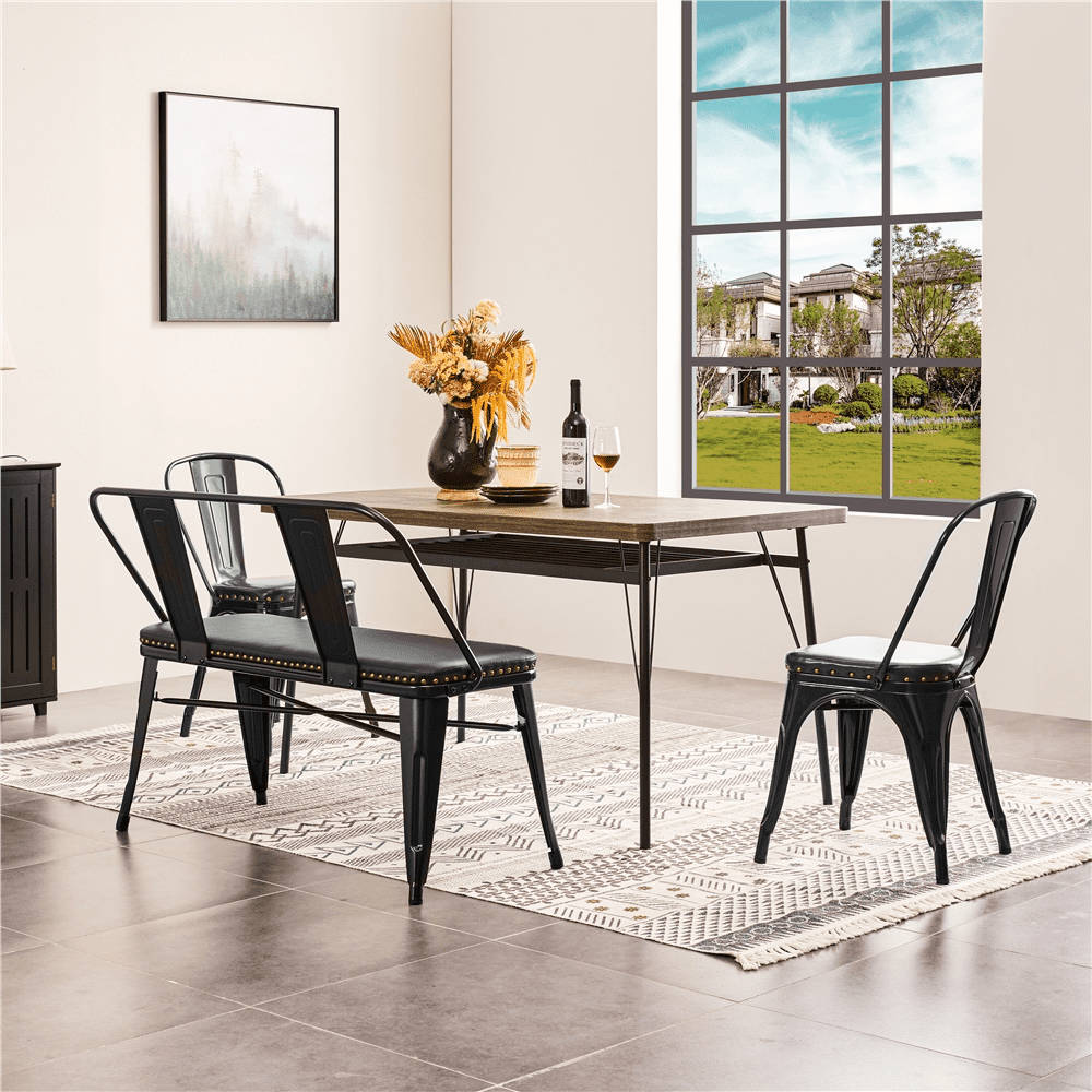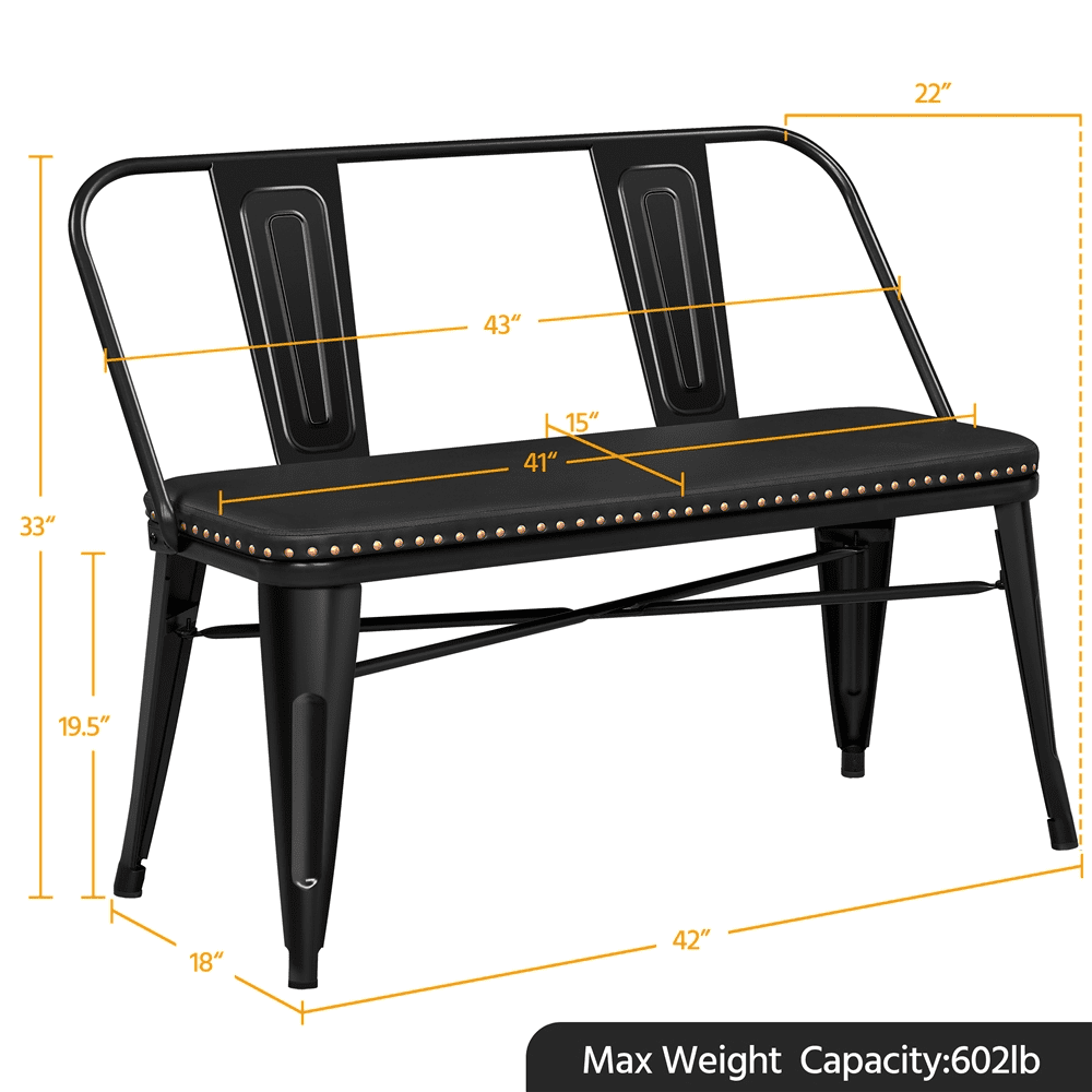 Comfortable Sitting Experience: This metal dining bench comes with a cushioned seat filled with foam for extra comfort, providing a comfortable sitting experience from reading to dining. (Seat: 41″ L ×15″ W × 19.5″ H) Light but Durable: Lightweight but durable steel with cross-bars helps keep this bench stable while withstanding up to 602 lb. Four tapered legs with rubber feet add further stability and prevent floor damage Pretty Design & Versatile: This sleek black metal dining bench with a comfy upholstered seat is the ideal choice for various spaces, including; patios, kitchens, entrance halls, cafes, restaurants and more. The smooth edge processing adds extra detail and interest while protecting your hands from cuts and scratches Seating for Two: An upholstered bench with seating for two and a removable backrest. Comes with a soft seat designed with a circle of bronze rivets for a decorative look Simple Assembly Required: The dining bench with backrest will be placed on your doorstep in one compact package. With the help of the step-by-step assembly instructions and the included tools, two adults can finish the setup within half an hour Specifications: Color: Black; Materials: PVC Leather, Iron, Foam, Non-woven Fabric; Overall Dimensions (without backrest): 42″ L × 18″ W × 19.5″ H; Overall Dimensions (with backrest): 43″ L × 22″ W × 33″ H; Maximum Weight Capacity: 602 lb