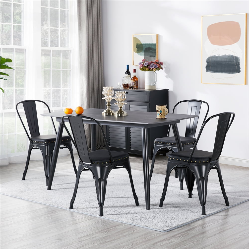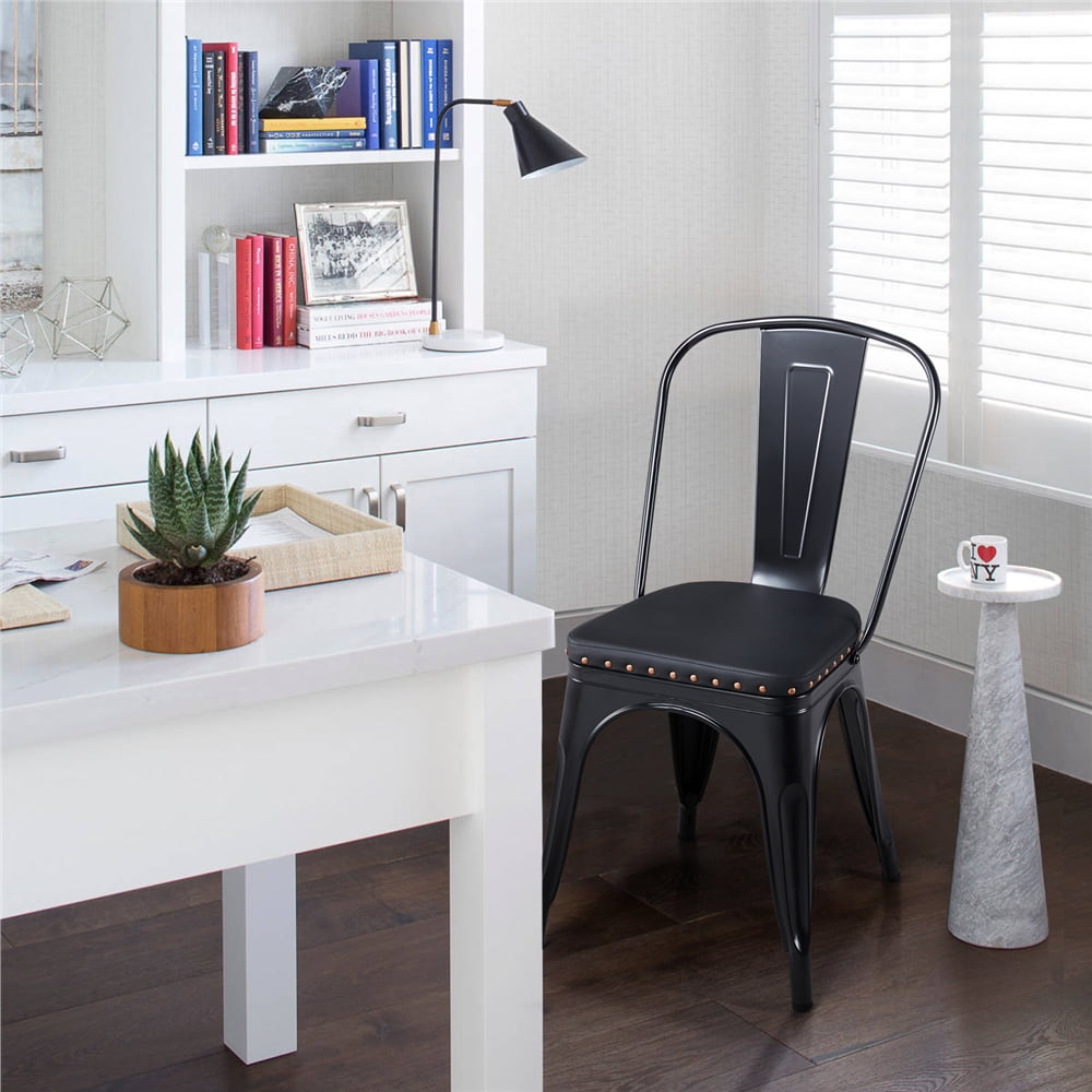 Fashion punk style: Our dining chairs feature fashion punk style and full black/brown color with matt finish. The metal frame matches the leather upholstered seat with riveted sides. These fashion dining chairs are durable and fabulous Riveted sides: Our leather chairs stand out from the crowd thanks to the riveted sides. This stylish design makes the set of chairs unique and adds a special beauty to the entirety Ideal match: As an ideal set of kitchen furniture, our dining chairs are sold in 4 pieces with good value, flawlessly matching with a dining table or a counter. You can also set them up in your living room, yard, porch, etc Reliable backrest: With an ergonomic backrest, our living room chair is comfy even for a long sitting. The metal backrest will provides you with a strong support and let your back relax Removable backrest: If you do not need the backrests, you can remove them, and the dining chairs will become simple bar stools, making them flexible and easy to organize Specifications: Material: Iron, PU, plywood, non-woven fabrics and foam; Color: Black; Qty: 4PCS; Overall size: 17.5” L x 21” W x 33” H; Max. weight capacity: 330.7lb; G.W.: 49.6lb; N.W.: 41.4lb
