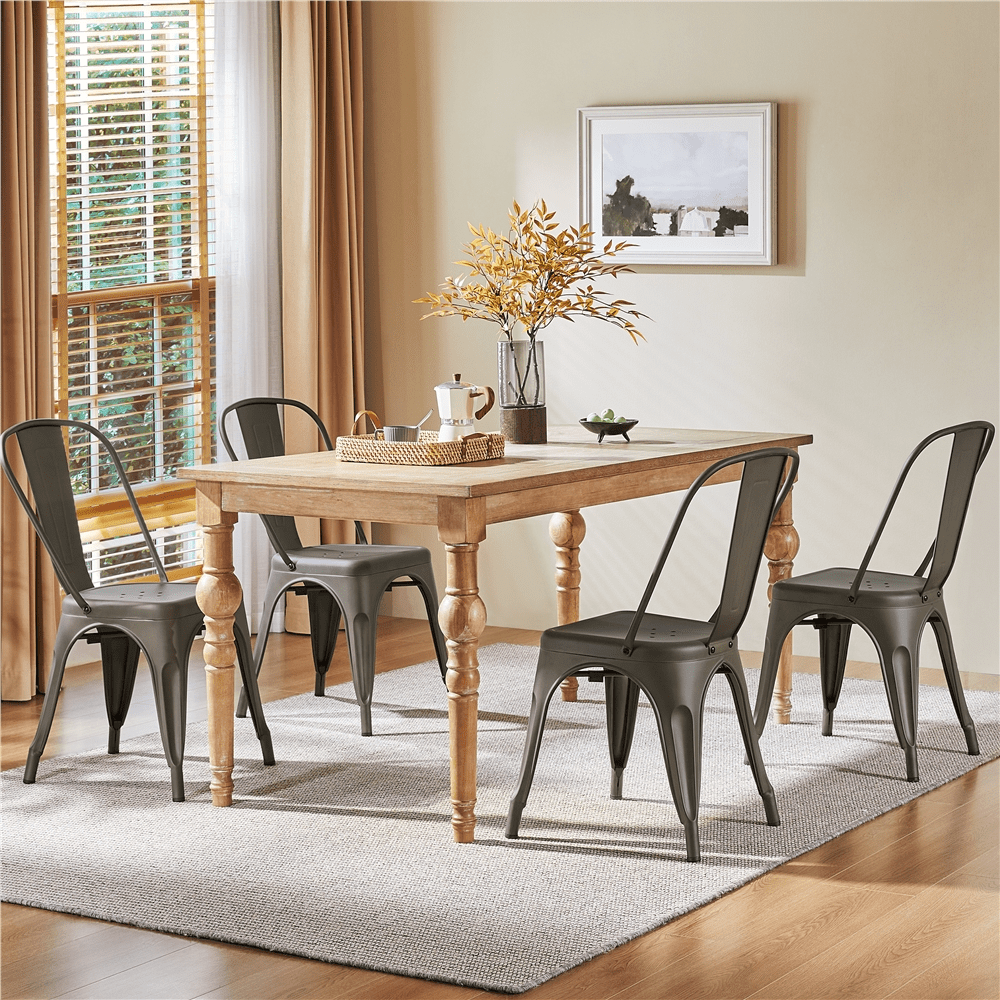 The Alden Design Industrial Modern Metal Dining Chairs come in a set of four allowing you conveniently decorate your space while providing you with good value. These indoor/outdoor dining chairs are applicable for bistros, patios, cafes, restaurants and dining rooms. The rubber feet keep the chairs from sliding and scratching hardwood floors. There are several holes on the surface of each chair which are designed to release pressure and provide ventilation when sitting in them. They are industrial and modern allowing them to match many various interior design styles. The chairs are made of iron metal and the max load bearing is 340 pounds. The high-quality material is solid enough for everyday needs and durable enough for long-term use. Because of the glossy surface is polished in water-resistant and rust-resistant material, these chairs will withstand weather changes. Instructions and accessories are included.
