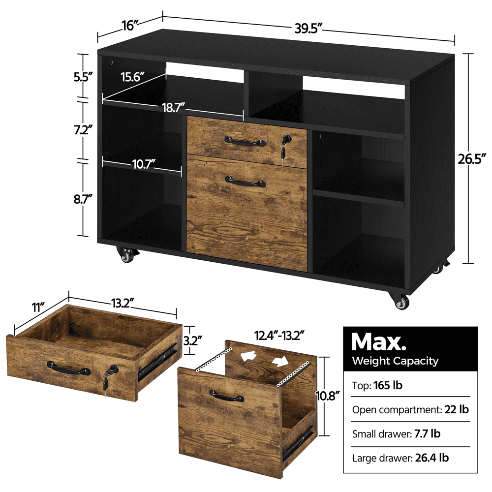 Alden Design Industrial Wooden Rolling File Cabinet with Lockable Drawer, Black/Rustic Brown Color: Black/ Rustic Brown Material: MDF, iron Overall Dimension: 39.5″ L × 16″ W × 26.5″ H Tabletop: 39.5″ L × 16″ W Each upper open compartment: 18.7″ W × 15.6″ D × 5.5″ H Each side open compartment: upper: 10.7″ W × 15″ D × (6″/ 7.2″/ 8.4″) H; lower: 10.7″ W × 15″ D × (7.4″/ 8.7″/ 10″) H; without panel: 10.7″ W × 15″ D × 16.5″ H Small Drawer: 13″ W × 11″ D × 3.2″ H; Large Drawer: 13″ W × 11″ D × 10.8″ H; Spacing between two bars: 13.2″/ 12.4″ Suitable File: A4/ letter/ legal files Max Weight Capacity: Top: 165 lb; each panel of open compartment: 22 lb; small drawer: 7.7 lb; large drawer: 26.4 lb Item Weight: 70.4 lb Shipping Weight: 75.5 lb Note: Please allow ±1/2″ measurement tolerance. Residential Use Assembly Required